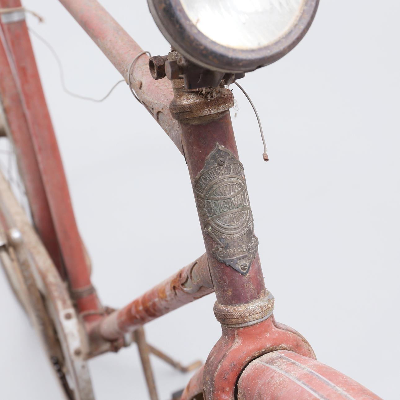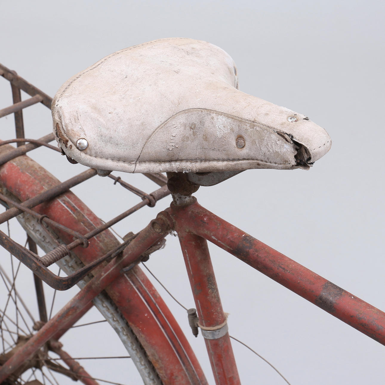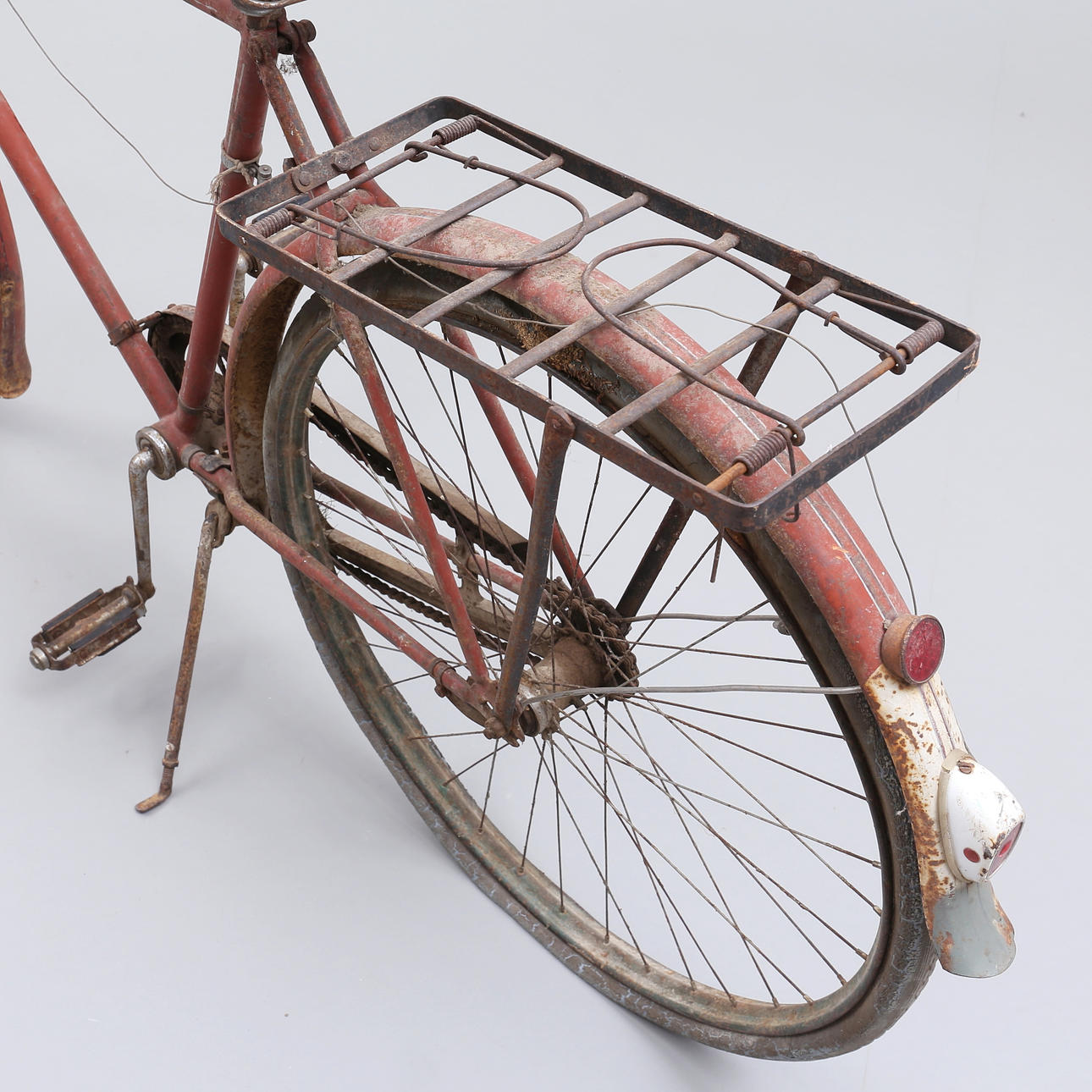 Grovt slitage, skador. Rostanlupen, färgbortfall. Trasiga däck samt sadel.