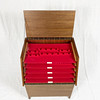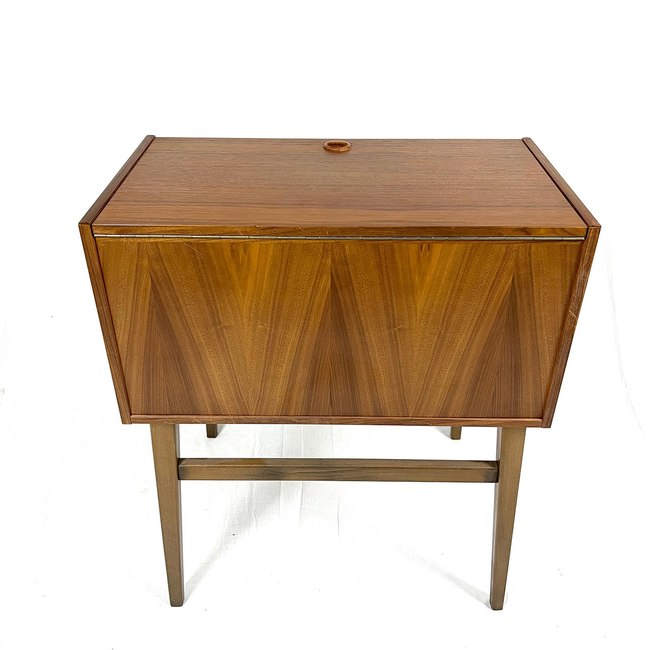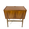 Utan bestick, Teakfaner. Fällbar front och top. Utdragbara hyllplan med fack för bestick.