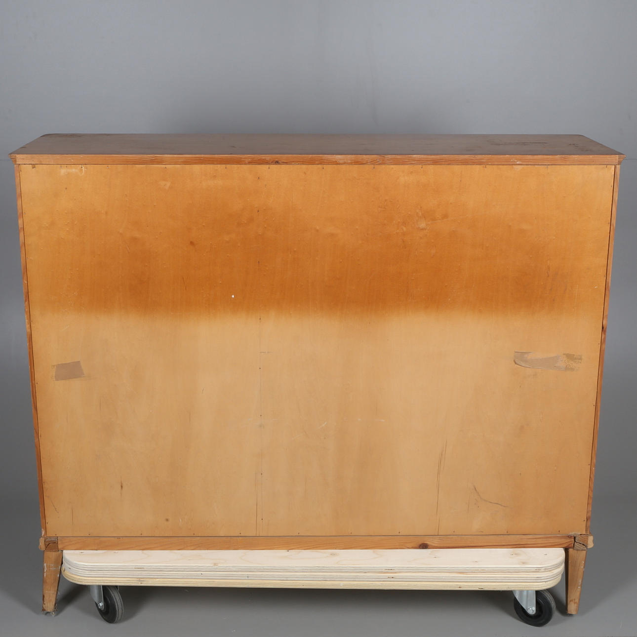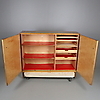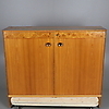 Med intarsiaarbeten. 2 st dörrar samt 2 st lösa hyllplan och 5 st lådor på insida. Längd 132,5 cm. Bredd 39,5 cm. Höjd 110 cm.