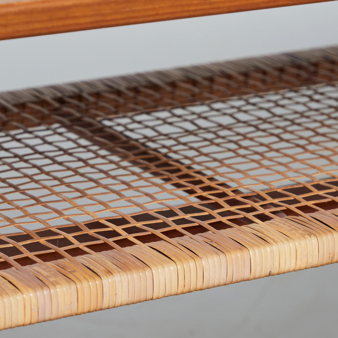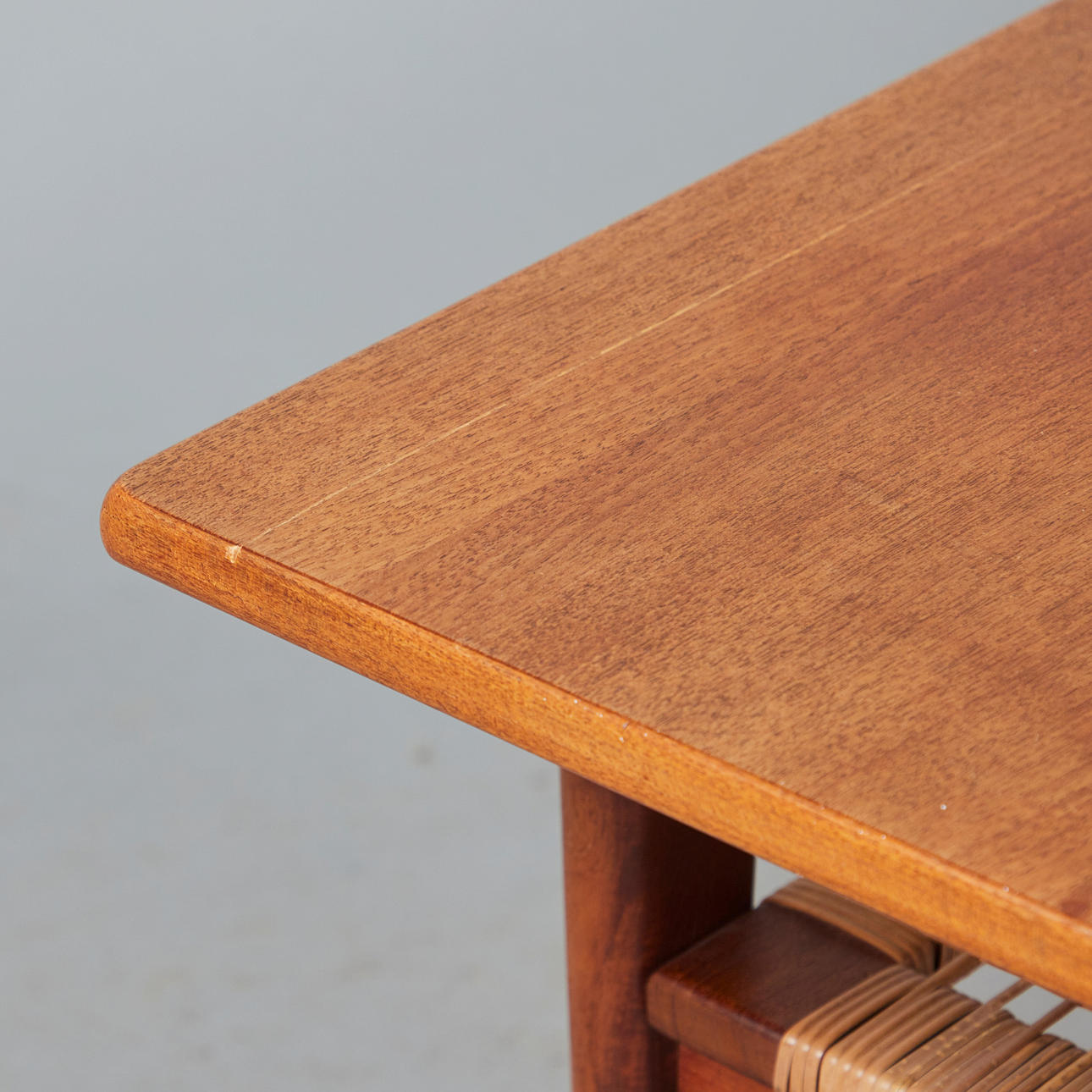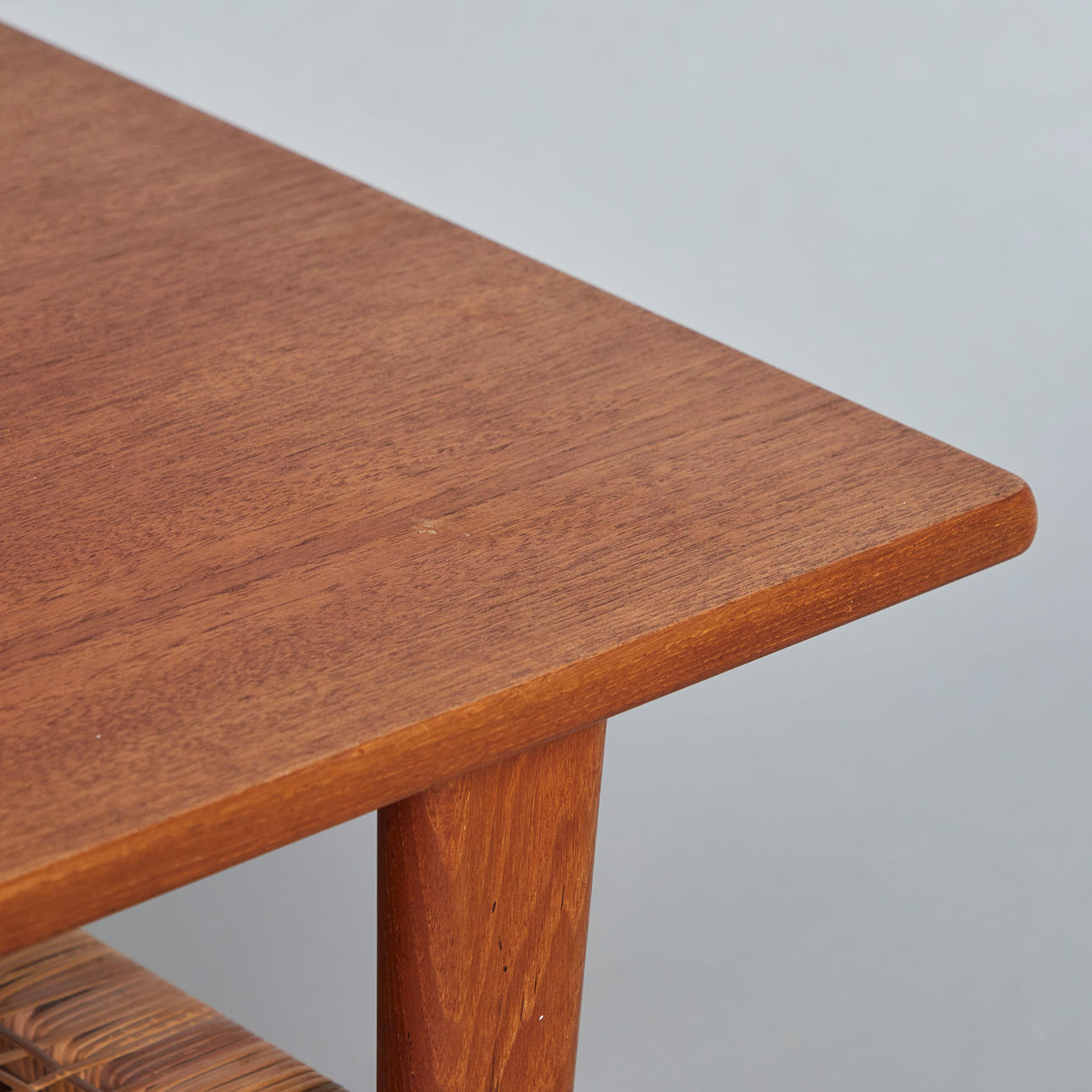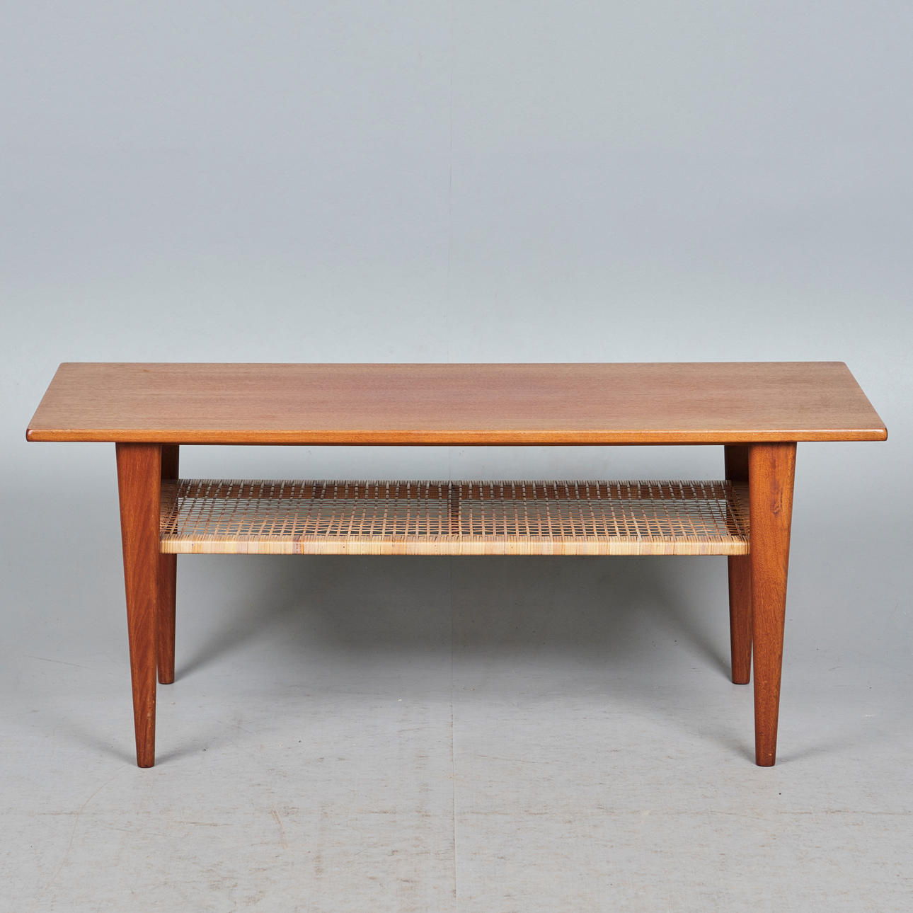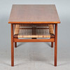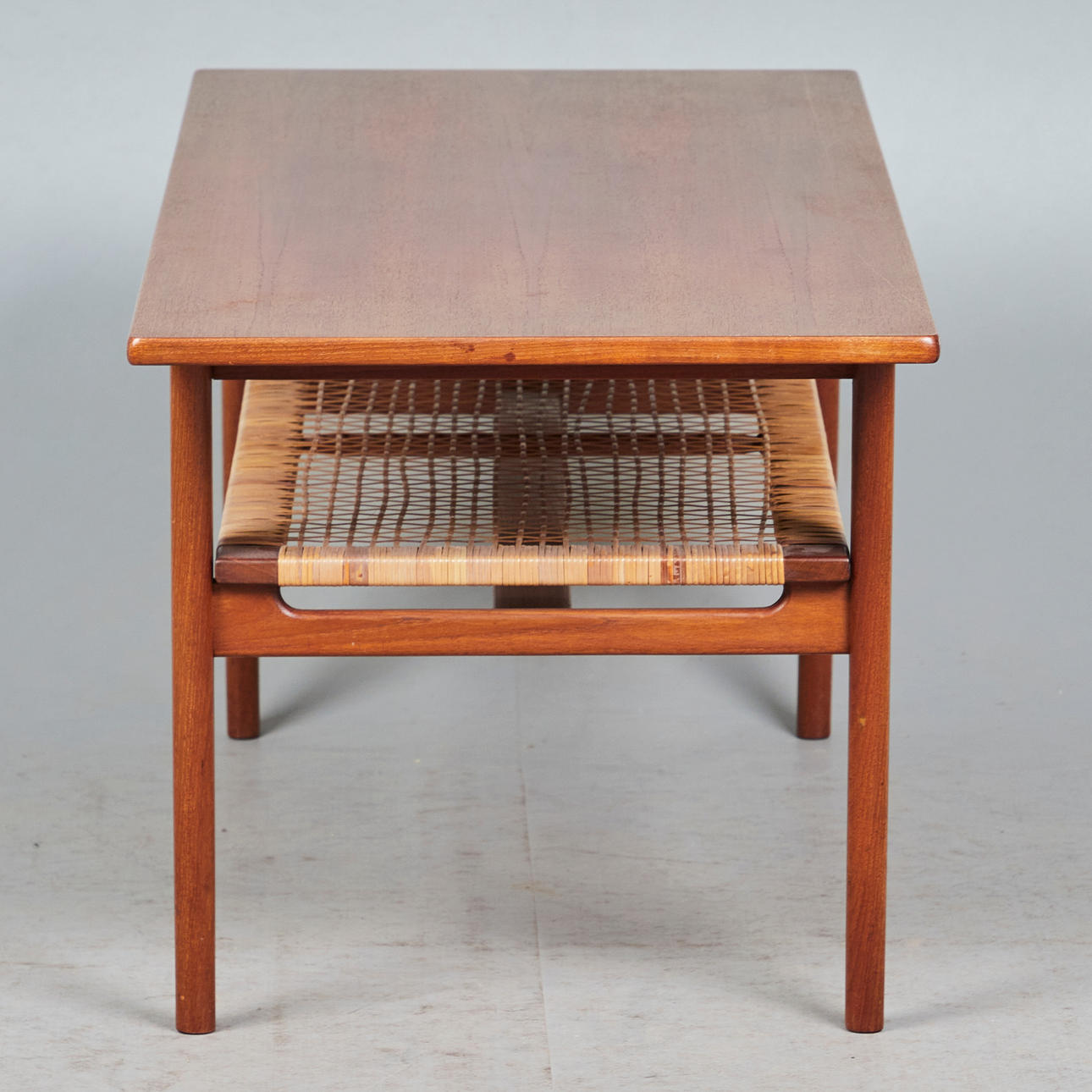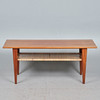 Soffbord/sidobord, rotting, teak, 1960-tal. Glaserad teakkonstruktion med fyra koniska ben och en rektangulär bordsskiva, med en korghylla på undersidan, H.51cm, L.123cm, W.53cm.