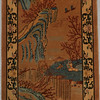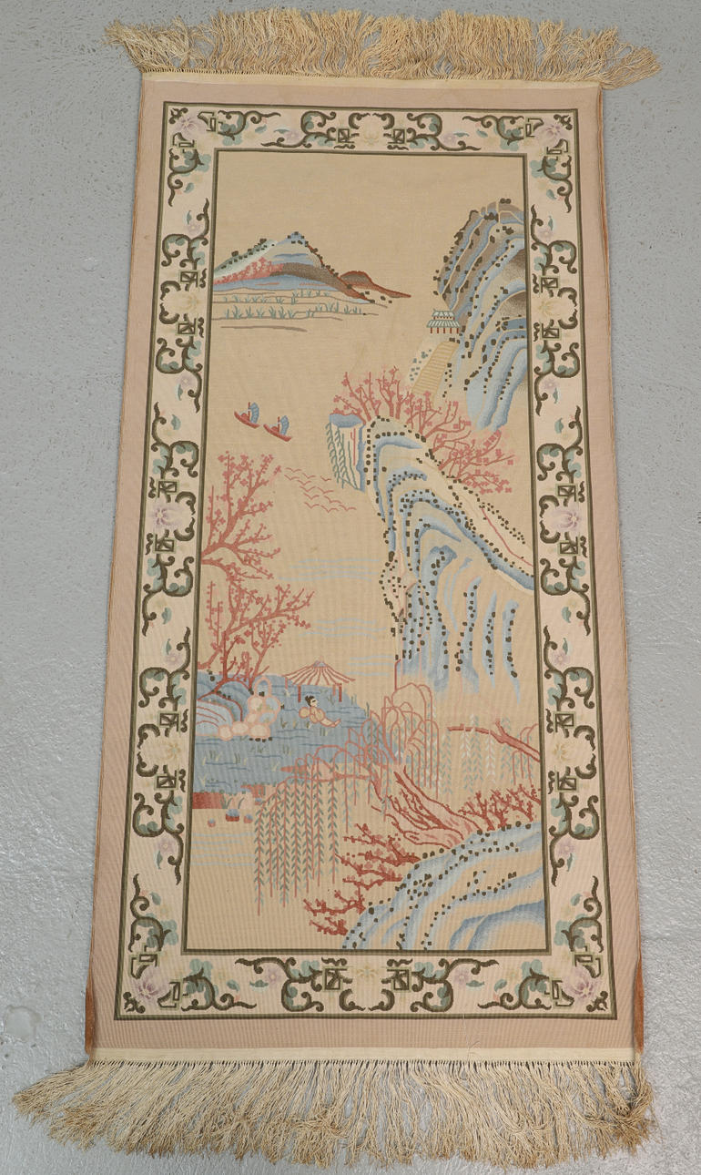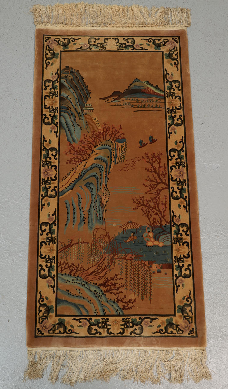 Brunbeigebotten med blå, svarta och röda inslag. Landskapsscen Mått exkl fransar ca 153x76 cm.