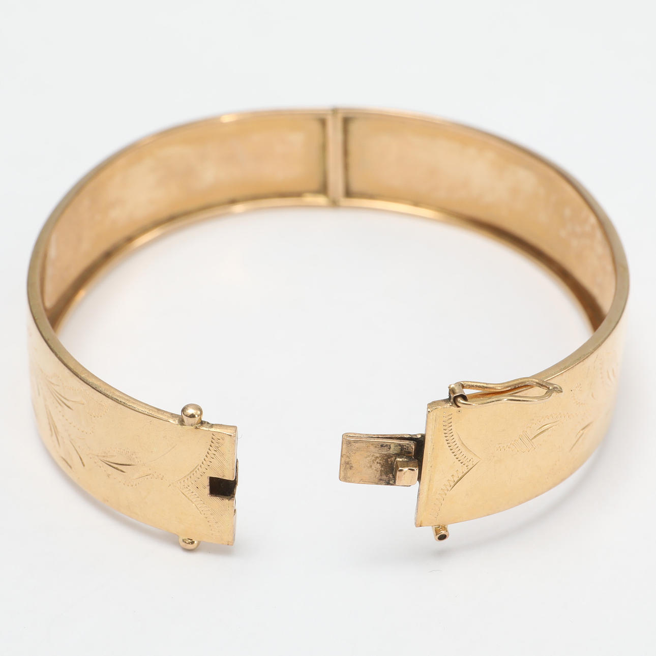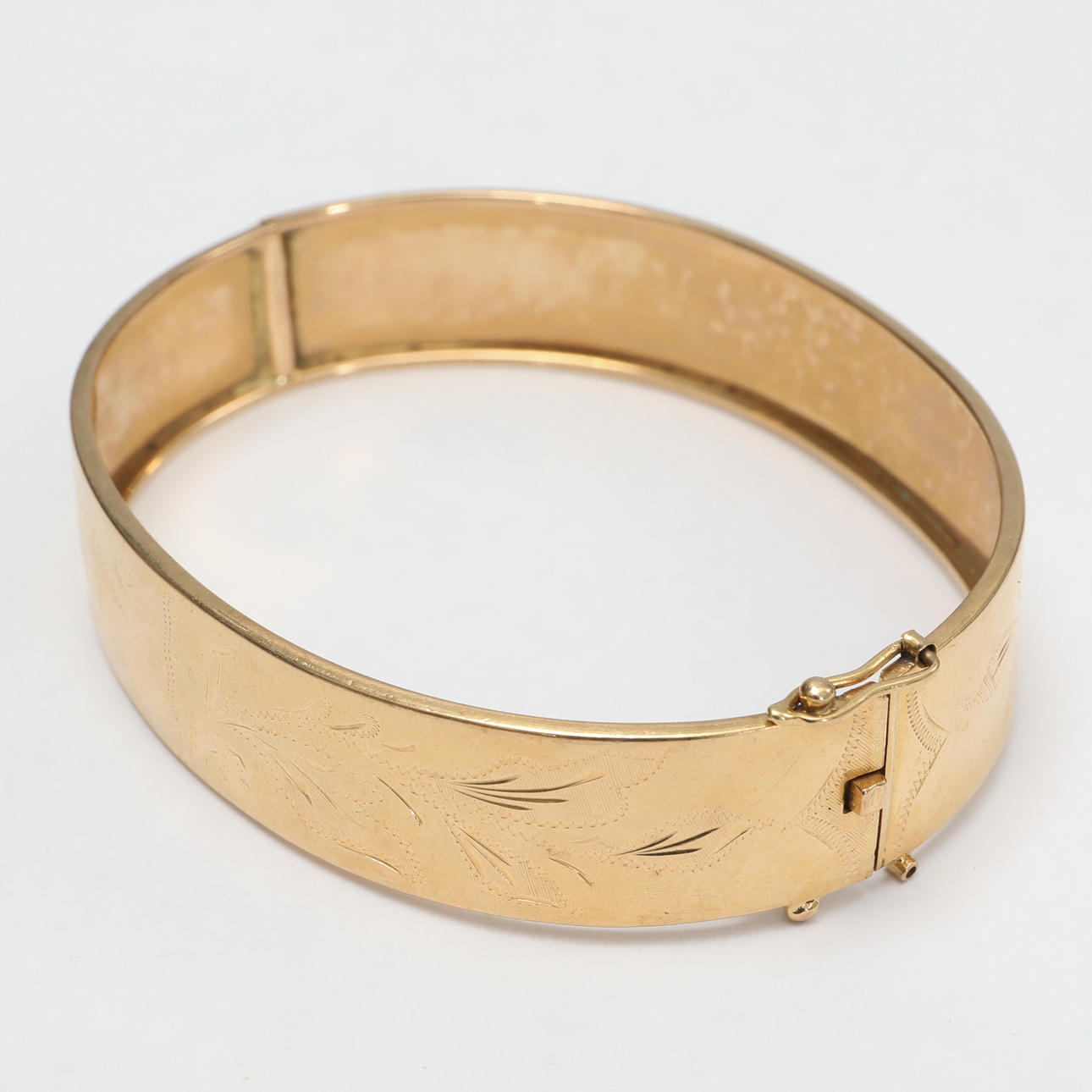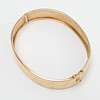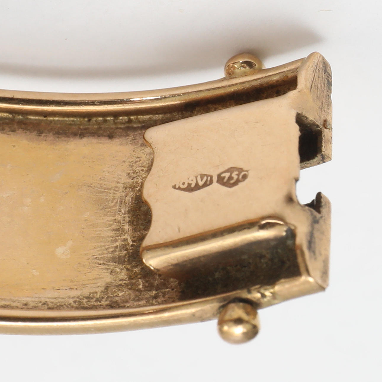 Öppningsbar armring i 18 karat guld. Oval modell, sticklås med en säkerhetsåtta- Ena säkerhetsåttan saknas. Stämplad invändigt vid låset. Ca 6,5 cm i diameter.