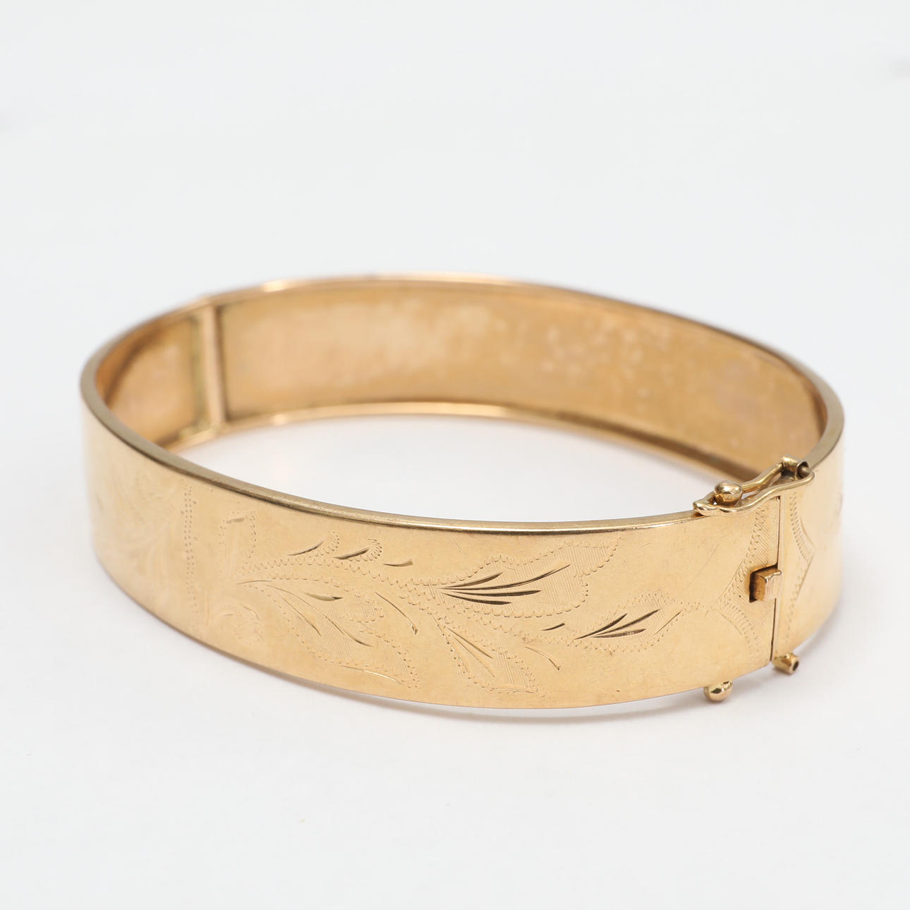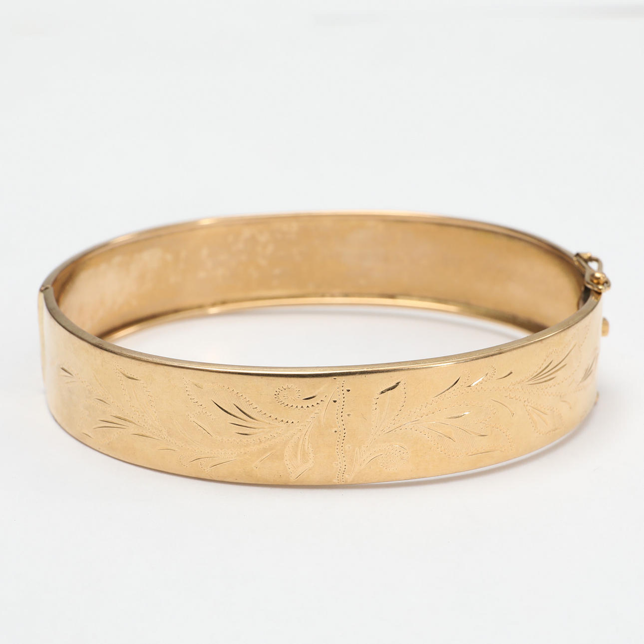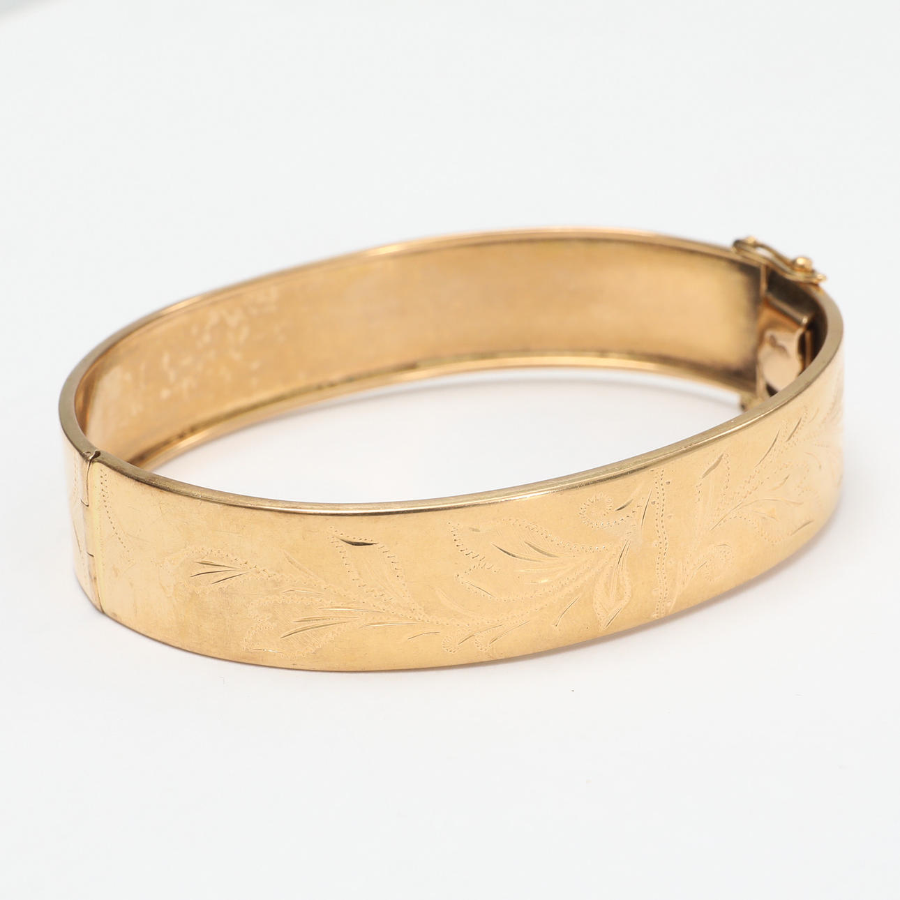 Öppningsbar armring i 18 karat guld. Oval modell, sticklås med en säkerhetsåtta- Ena säkerhetsåttan saknas. Stämplad invändigt vid låset. Ca 6,5 cm i diameter.