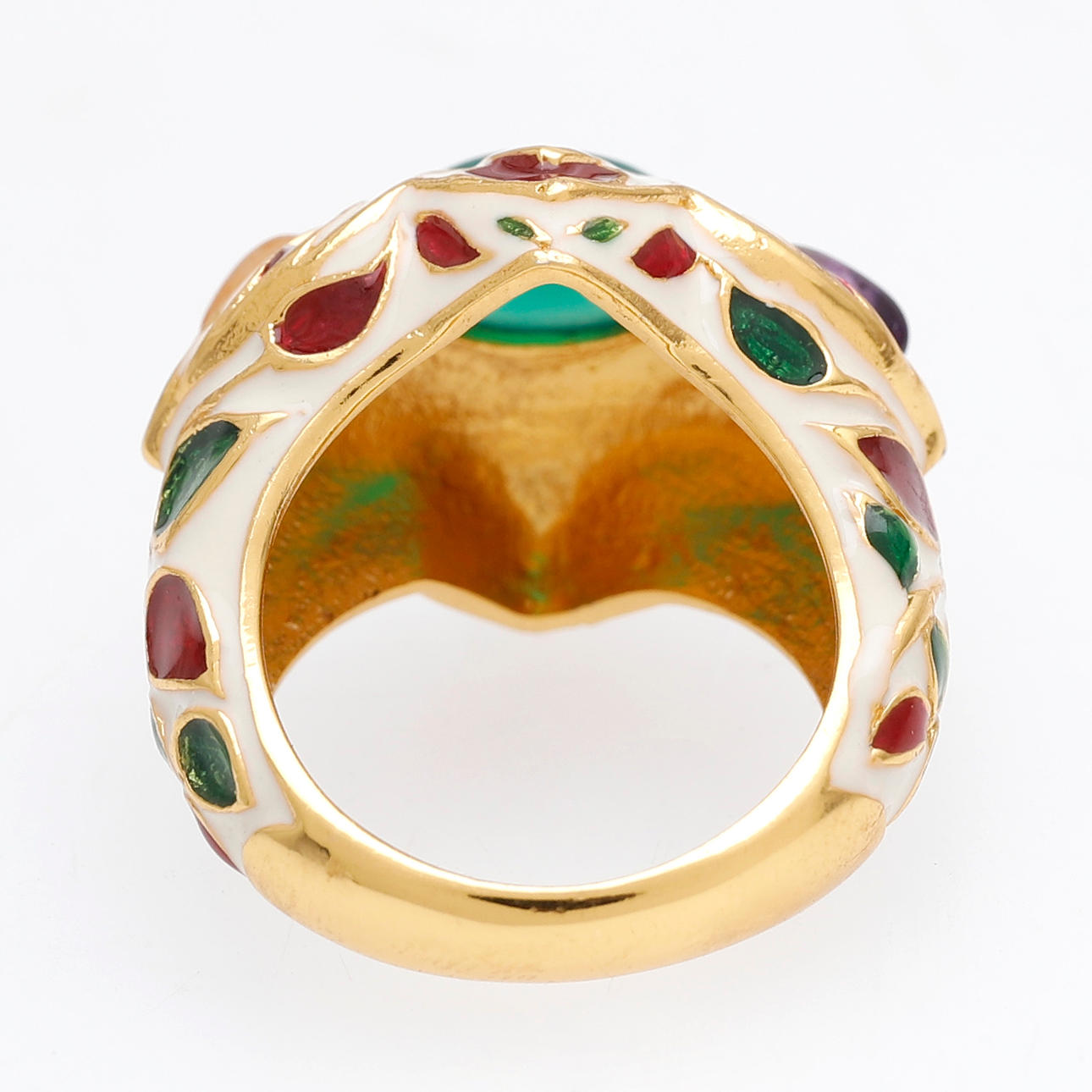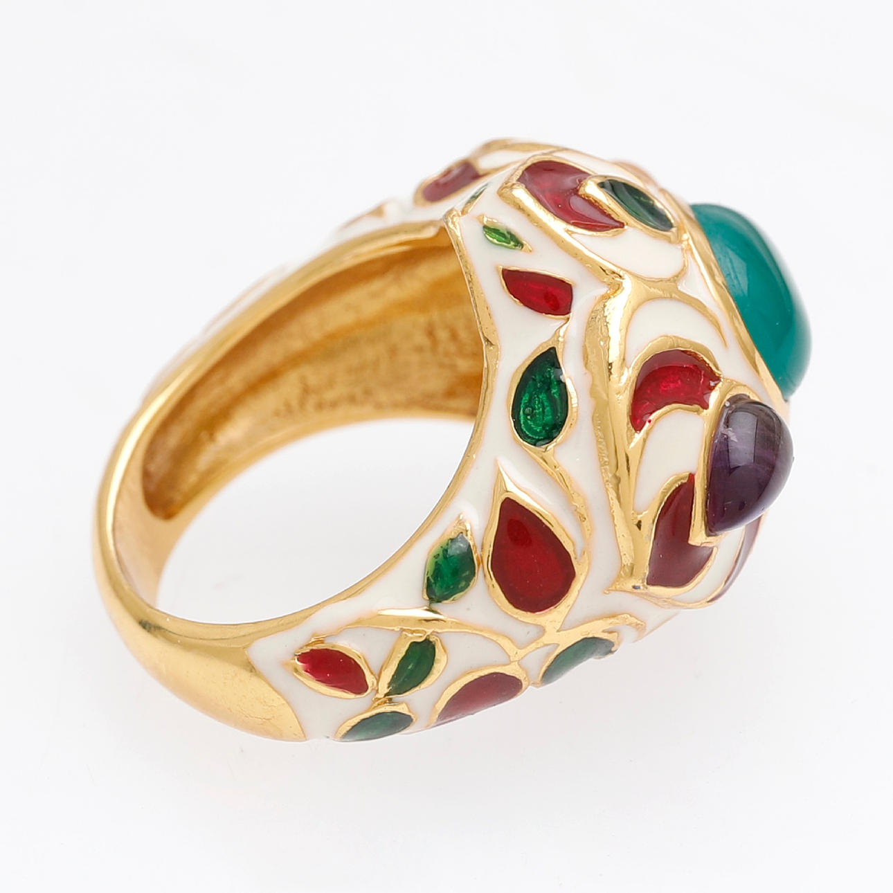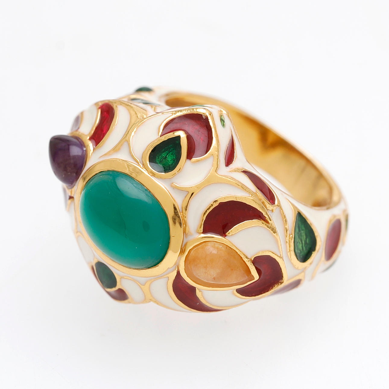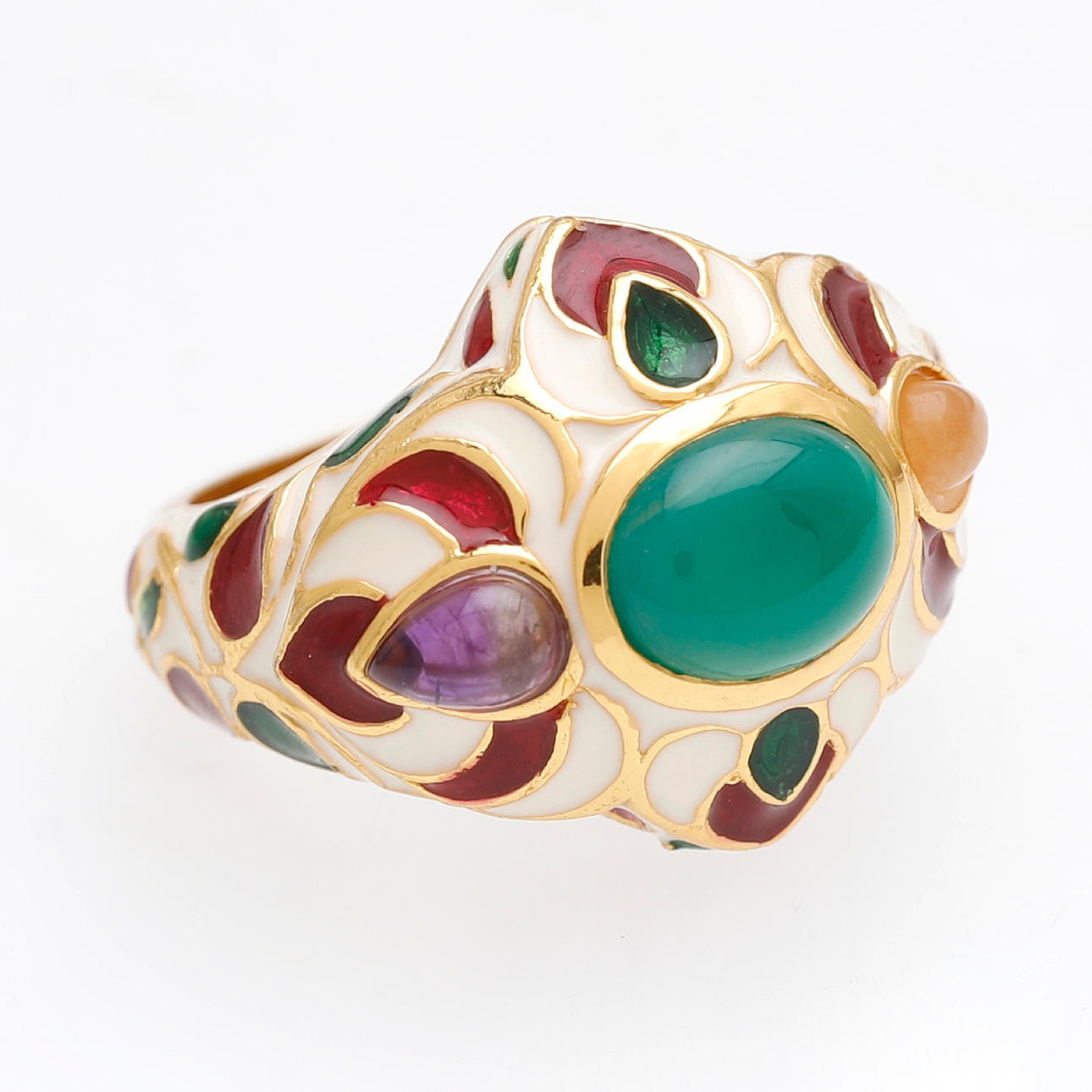 Överförgyllt silver, kalcedon, ametist och emalj. Storlek 16/56. 11,5 gr.