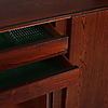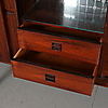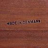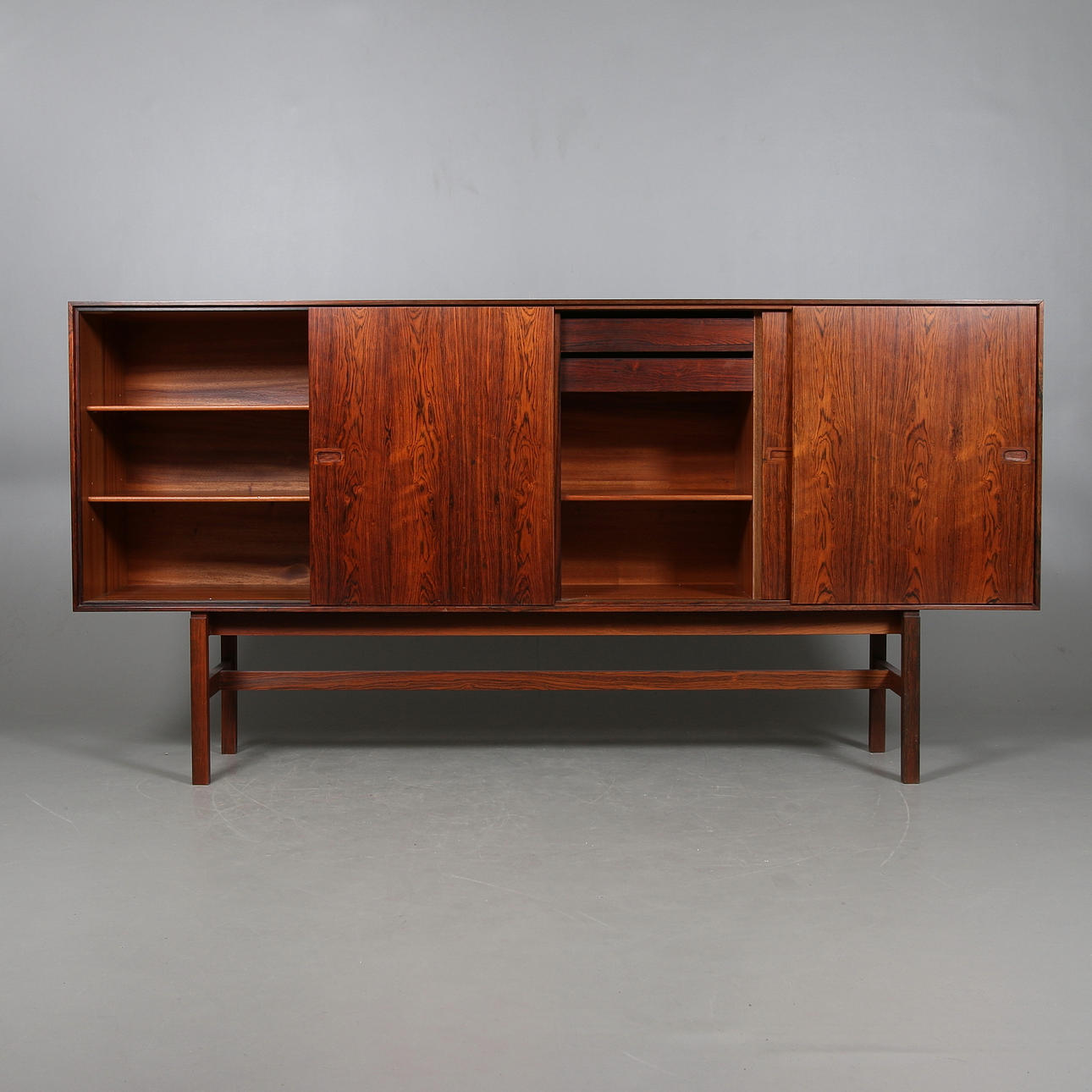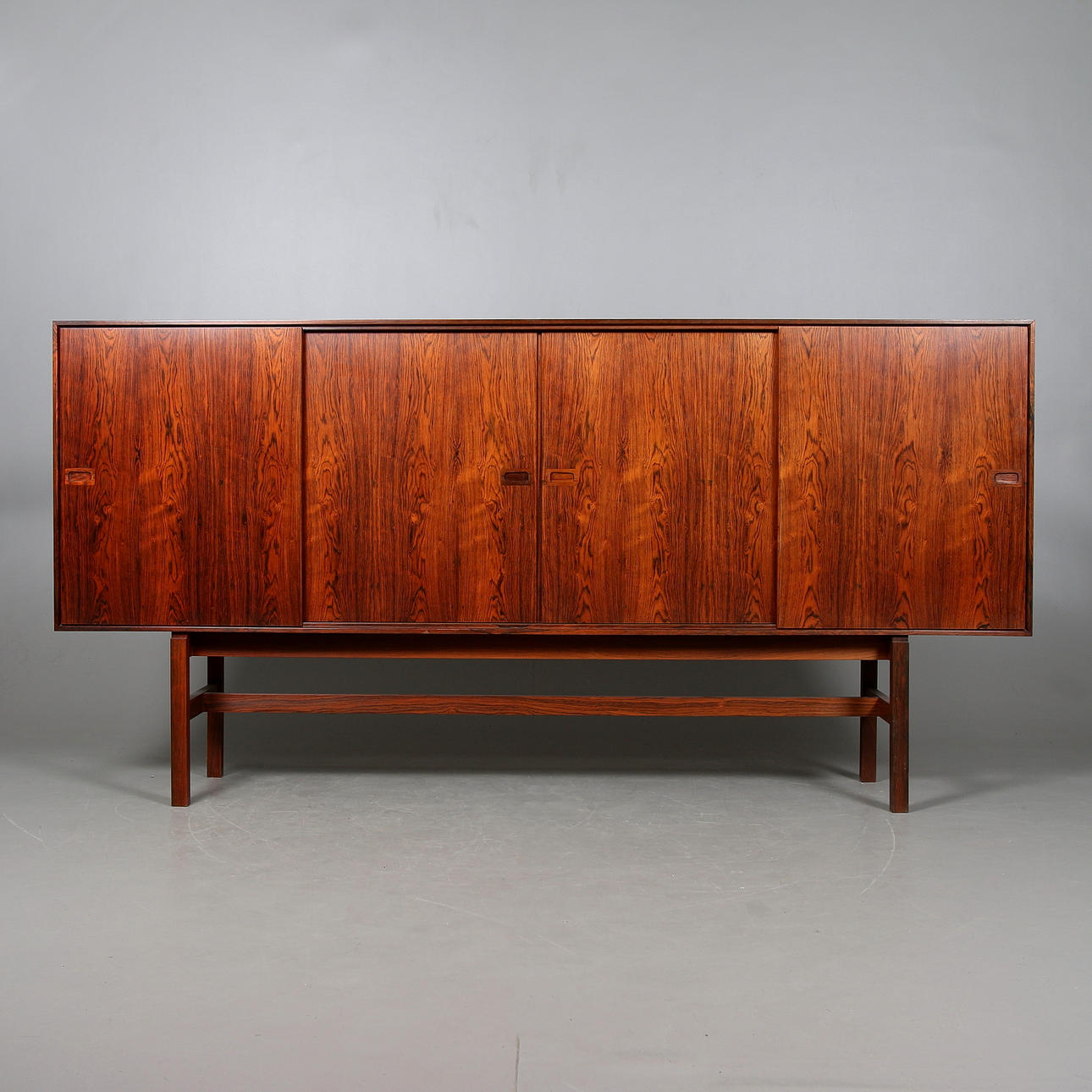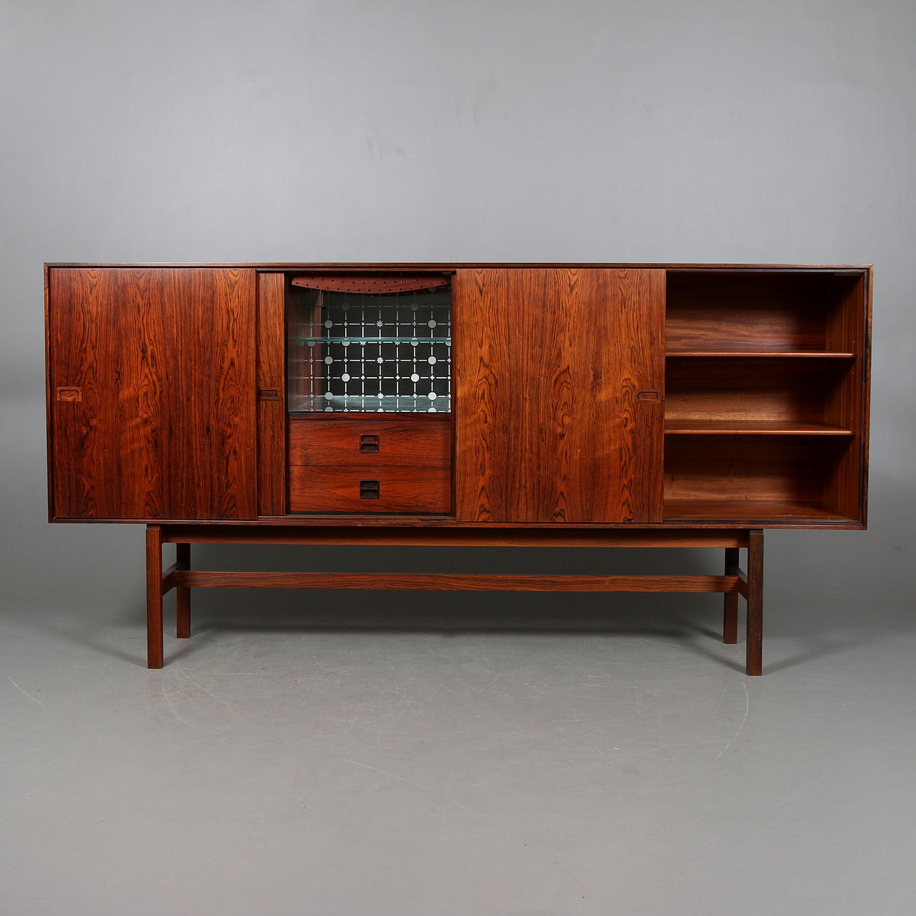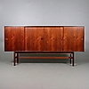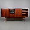 Brännmärkt "Made in Denmark". Fyra skjutdörrar, bakomliggande lådsektioner, hyllor samt barskåp inredd med belysning och spegel med etsad dekor. Längd 210, djup 44, höjd 105 cm.