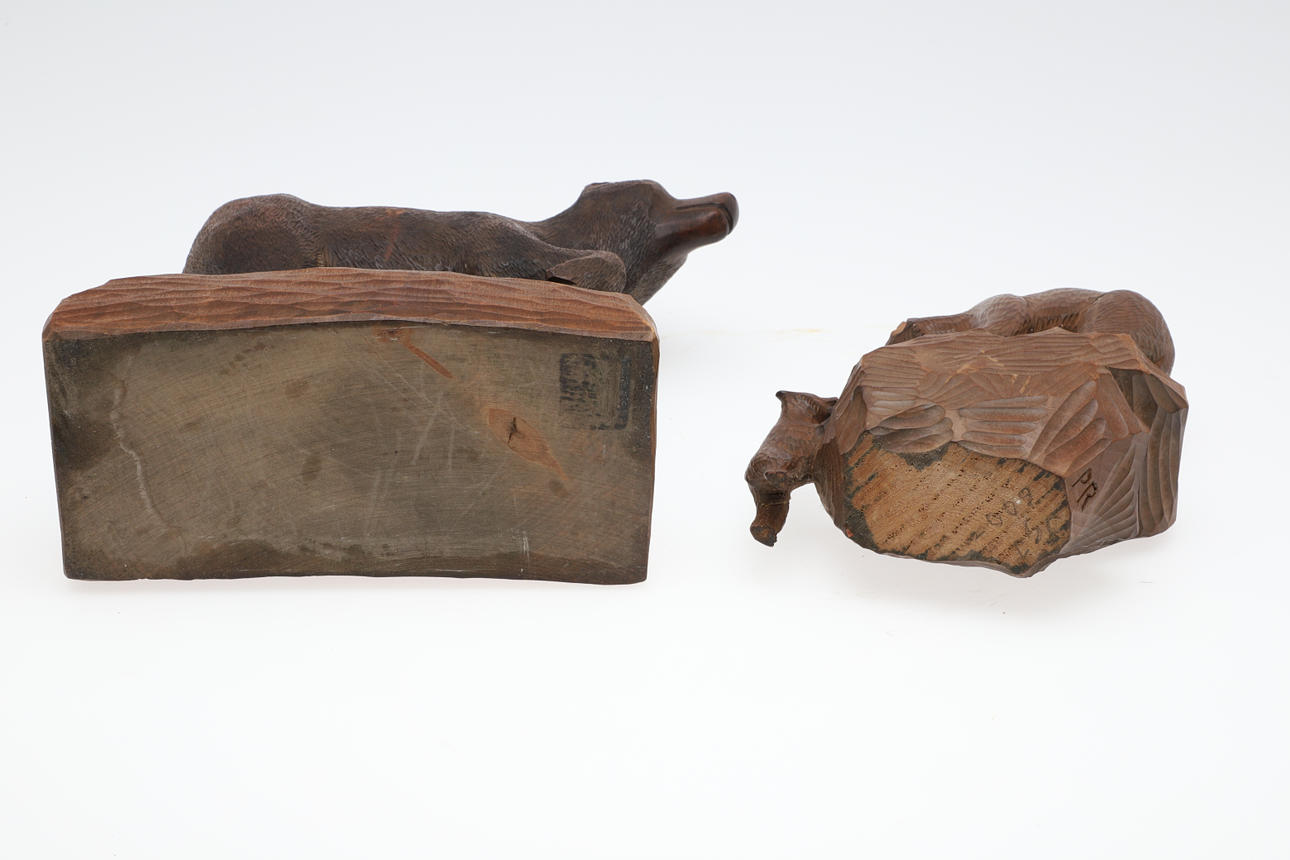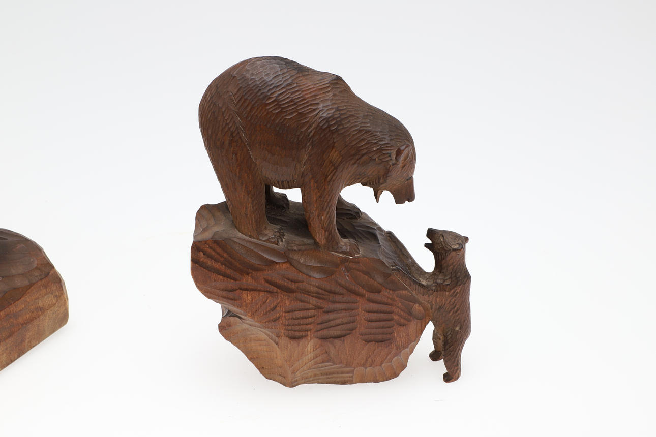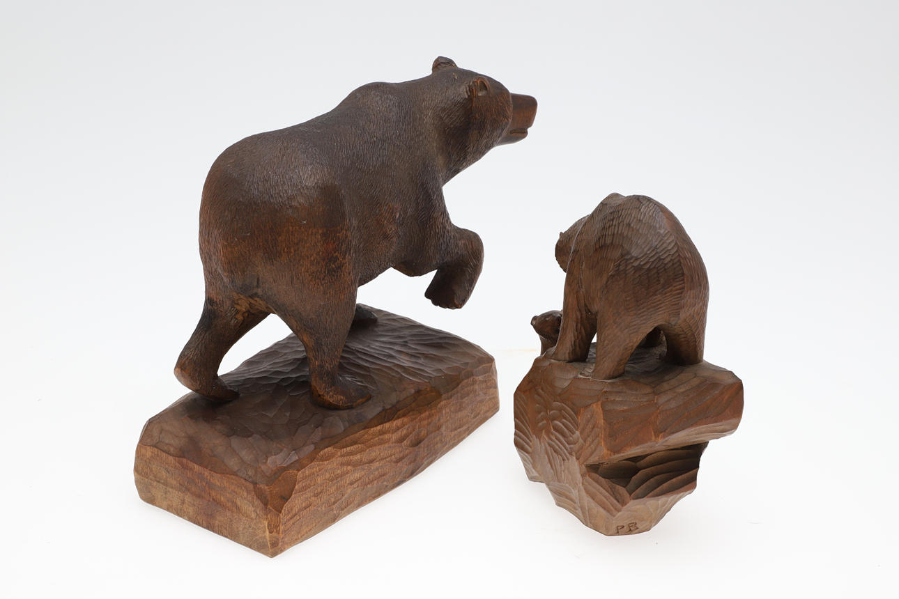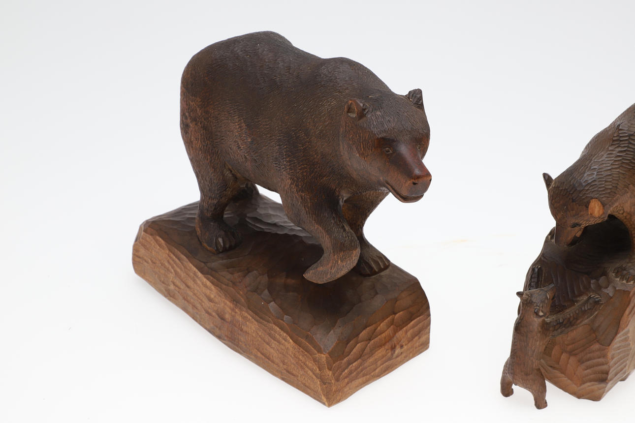 Inklusive en figur av en björn med en tass upphöjd från marken, och på en rektangulär formad snidad bas (19cms hög övergripande, bas 19cms av 9cms). Även med en snidad Schwarzwald Bear och gröngöling (17cms hög, signerad i ena änden). (2).