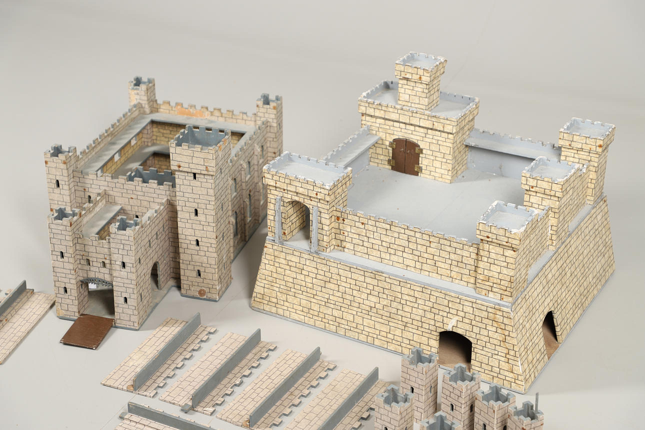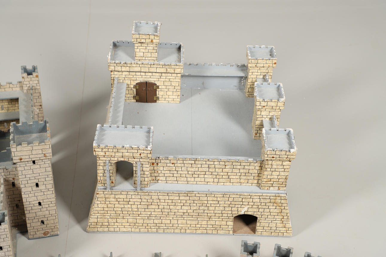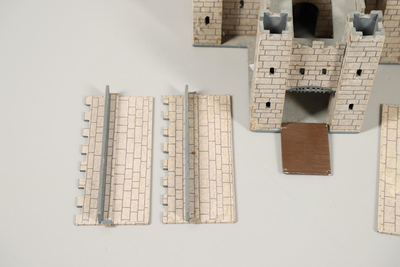 Leksaksslott, två 1950-tal, gjorda av trä. Både i olika utföranden och färgscheman. Liknande storlekar, med det grå slottet som mäter: Höjd 34 cm x Längd 59 cm x Djup 36 cm. Levereras med ett sortiment av reservdelar/delar. Ljusare färgade slottmått: Höjd 41 cm x Längd 49 cm x Djup 56cm. (2).