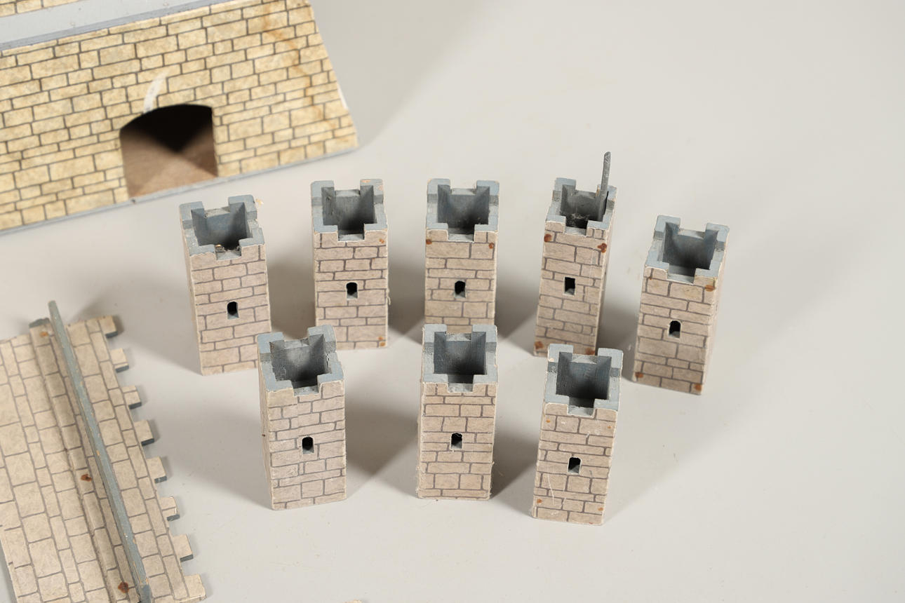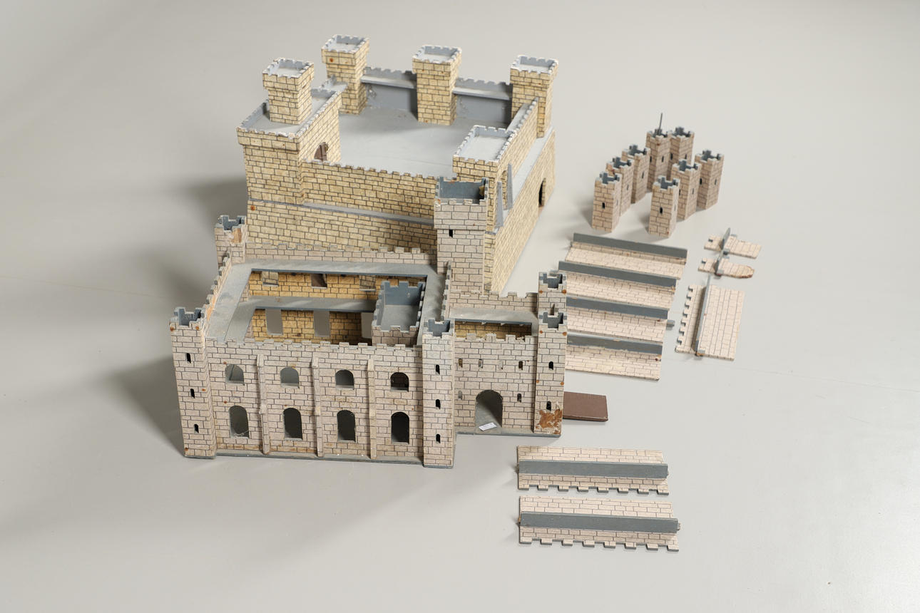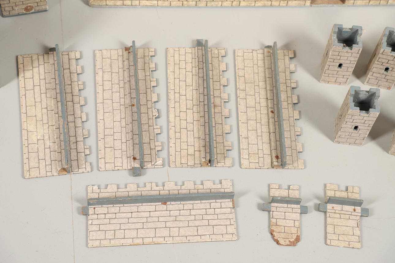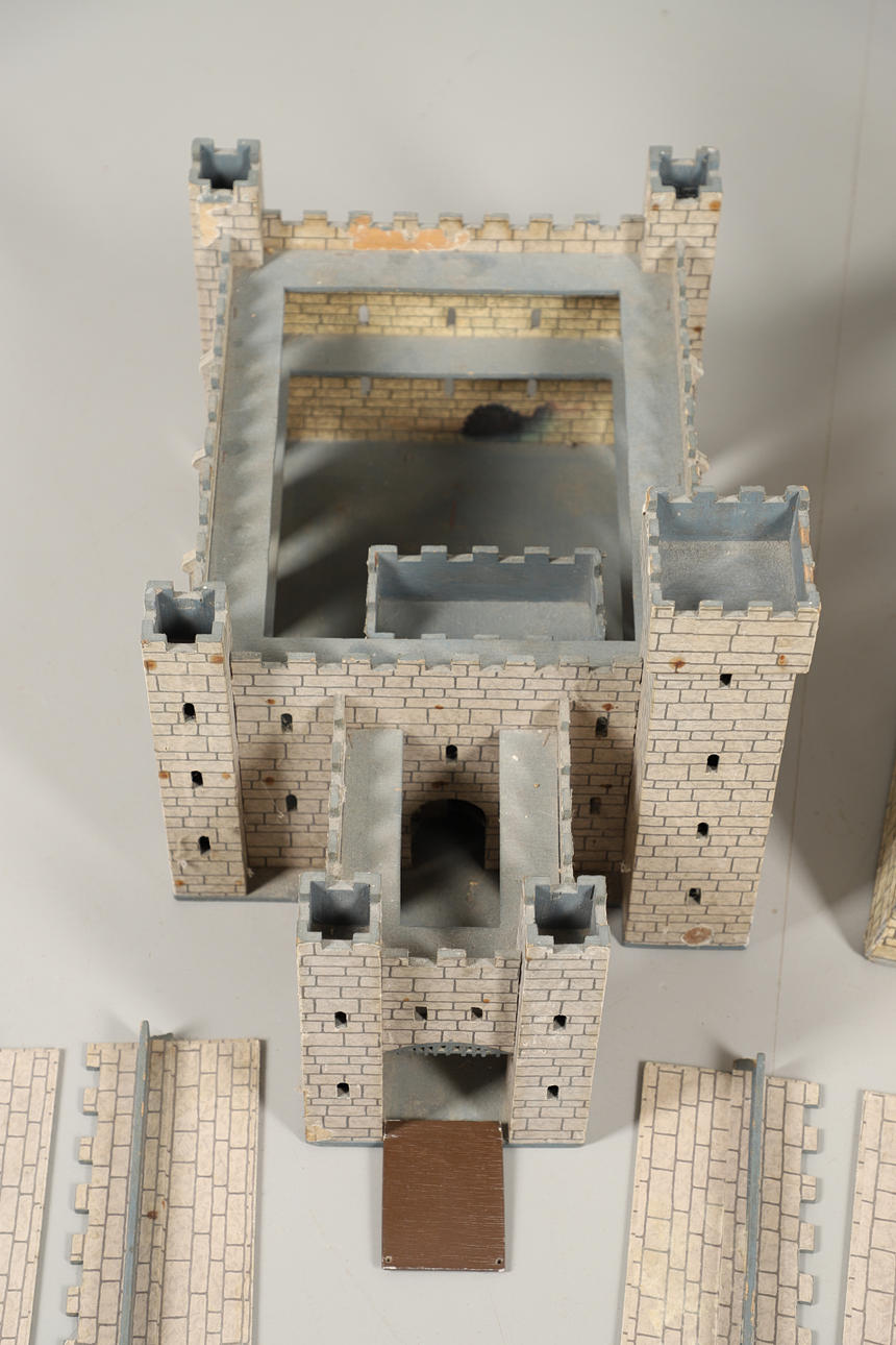 Leksaksslott, två 1950-tal, gjorda av trä. Både i olika utföranden och färgscheman. Liknande storlekar, med det grå slottet som mäter: Höjd 34 cm x Längd 59 cm x Djup 36 cm. Levereras med ett sortiment av reservdelar/delar. Ljusare färgade slottmått: Höjd 41 cm x Längd 49 cm x Djup 56cm. (2).