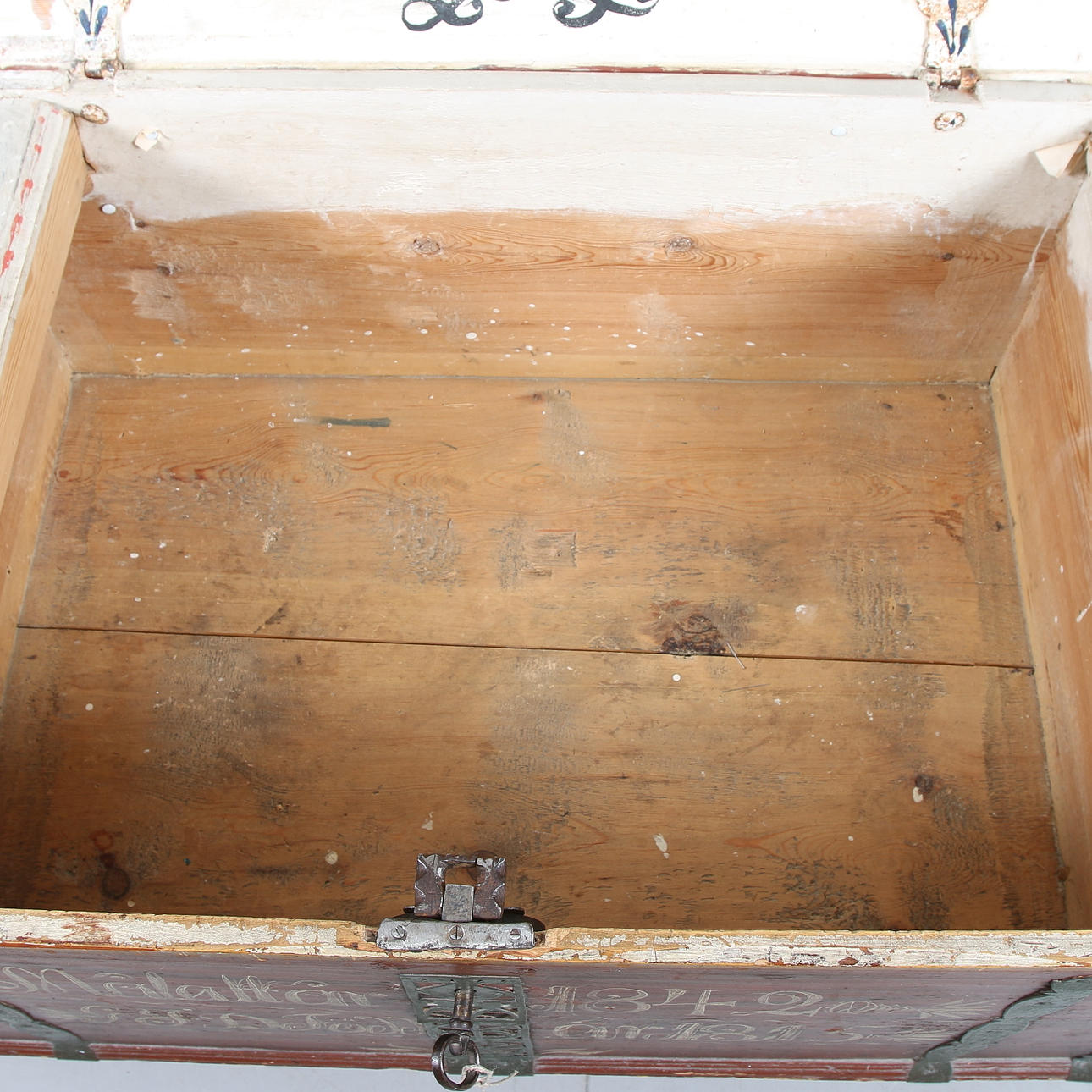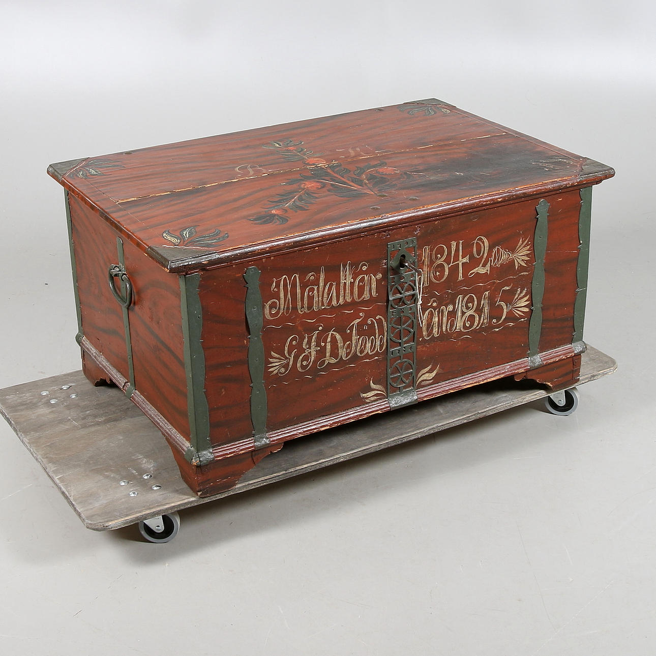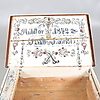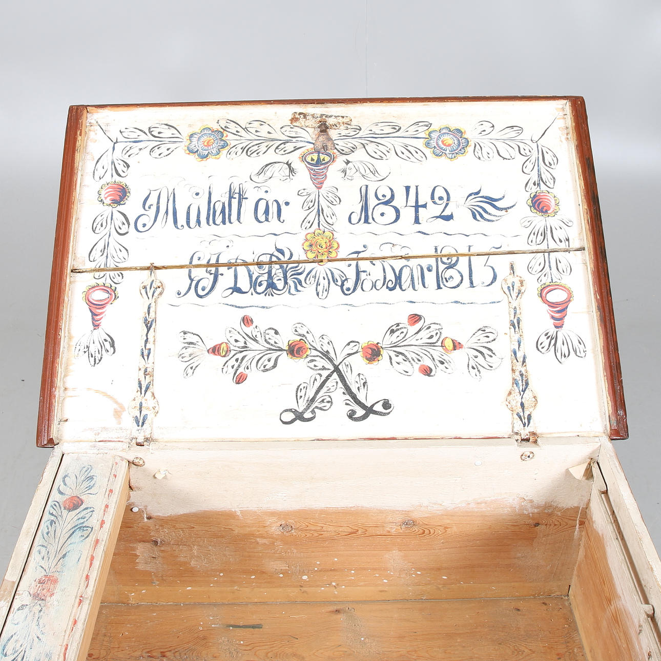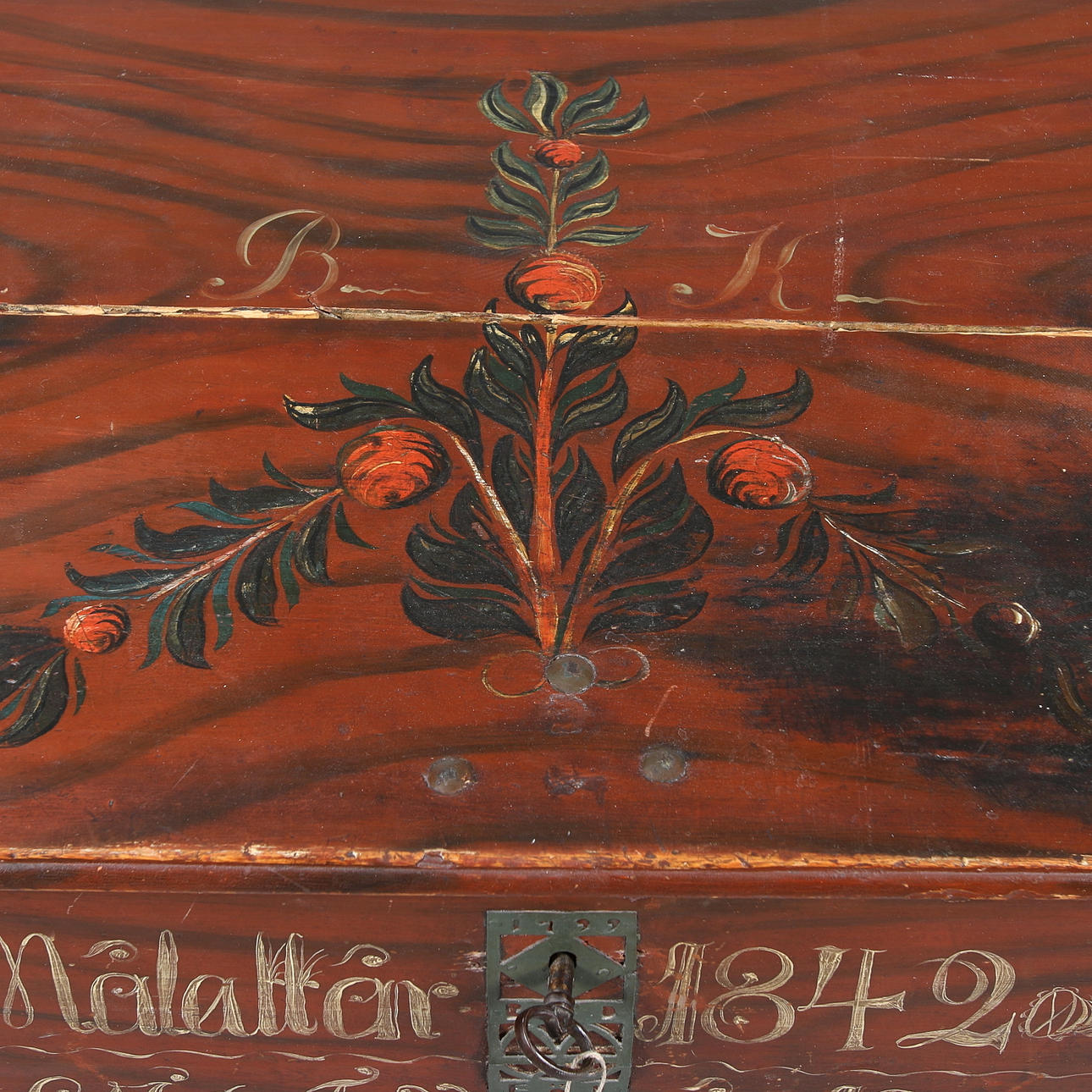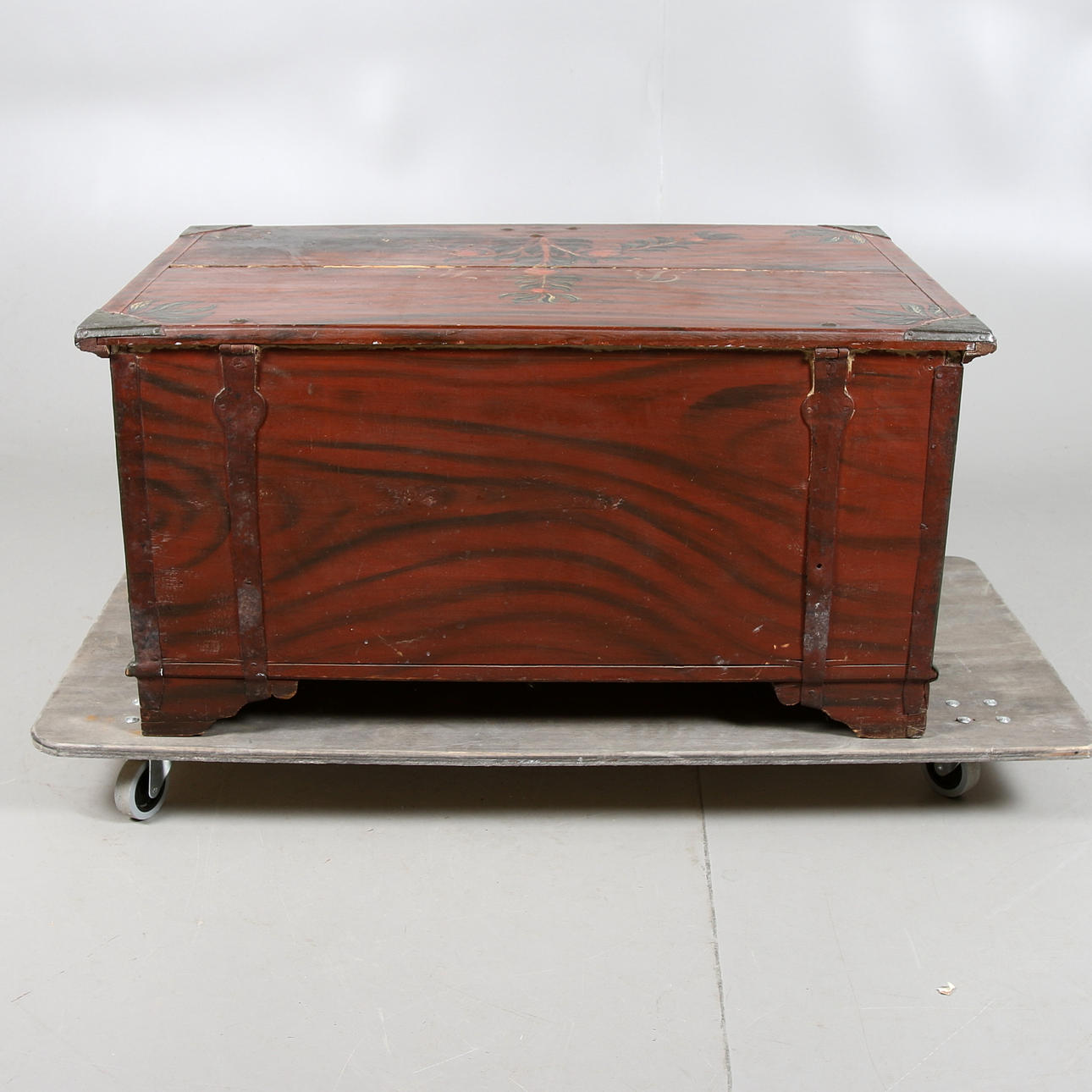 Rödmålad på utsidan och vitmålad på insidan, med dekoration av blommor. Längd 93, bred 62, höjd 47 cm.