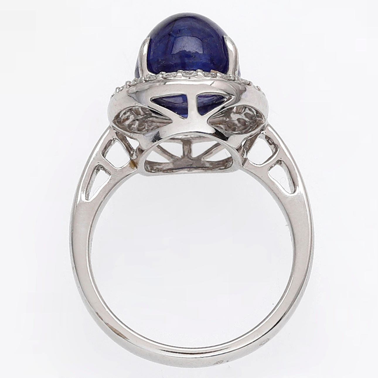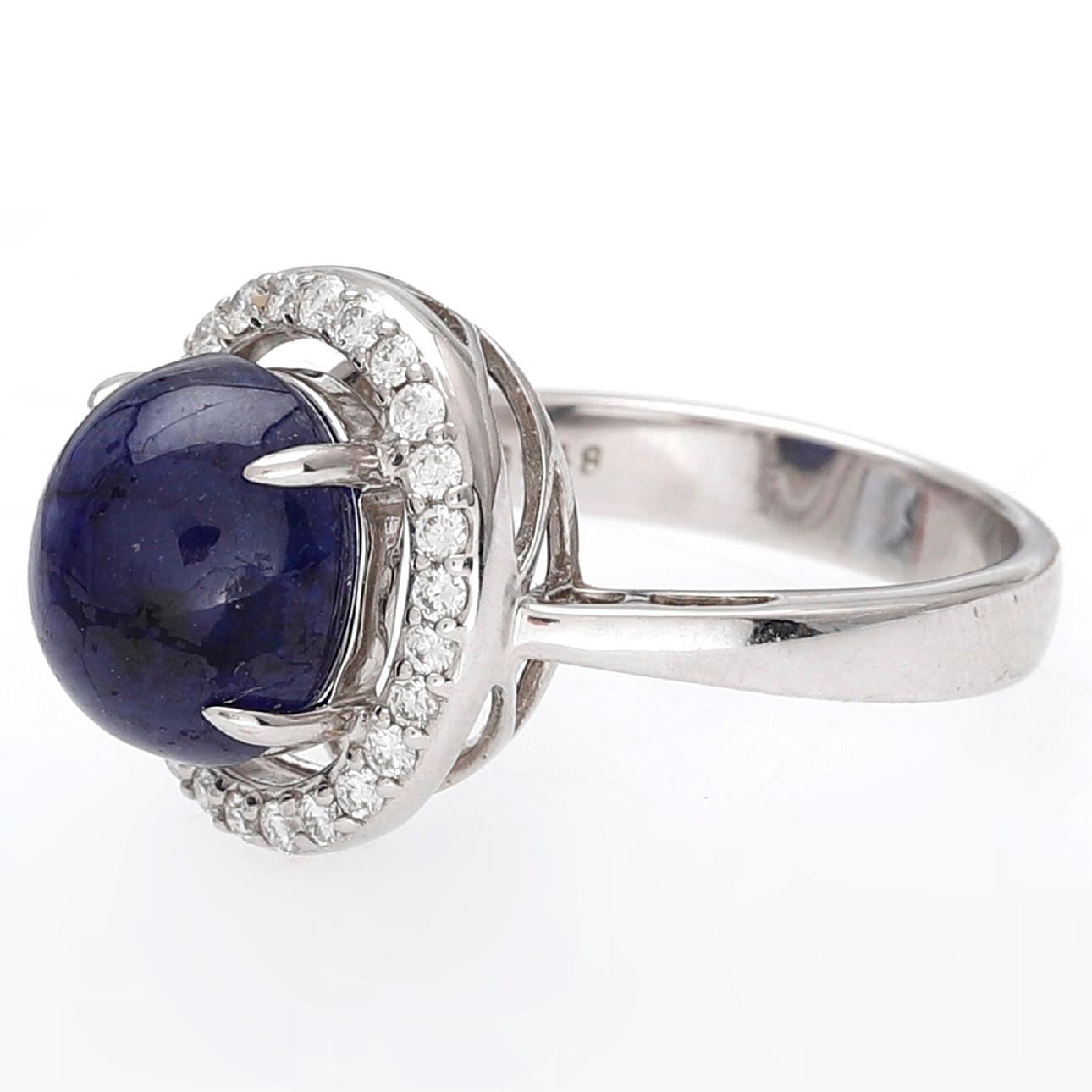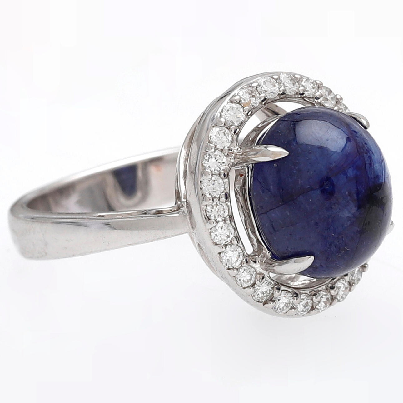 18K vitguld, briljantslipade diamanter, ca 0.32 ct. och behandlad safir oval cabochonstorlek, ca 8.05 ct. Storlek 14/54. 7,8 g.