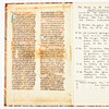 Pergamentblad ur medeltida Lectionarium. Använt som pärmomslag på ett ex. av Andreas Caesalpinus Aretinus: De metallicis libri tres, Nürnberg 1602, och vid bokens ombindning 1928 tillvarataget.