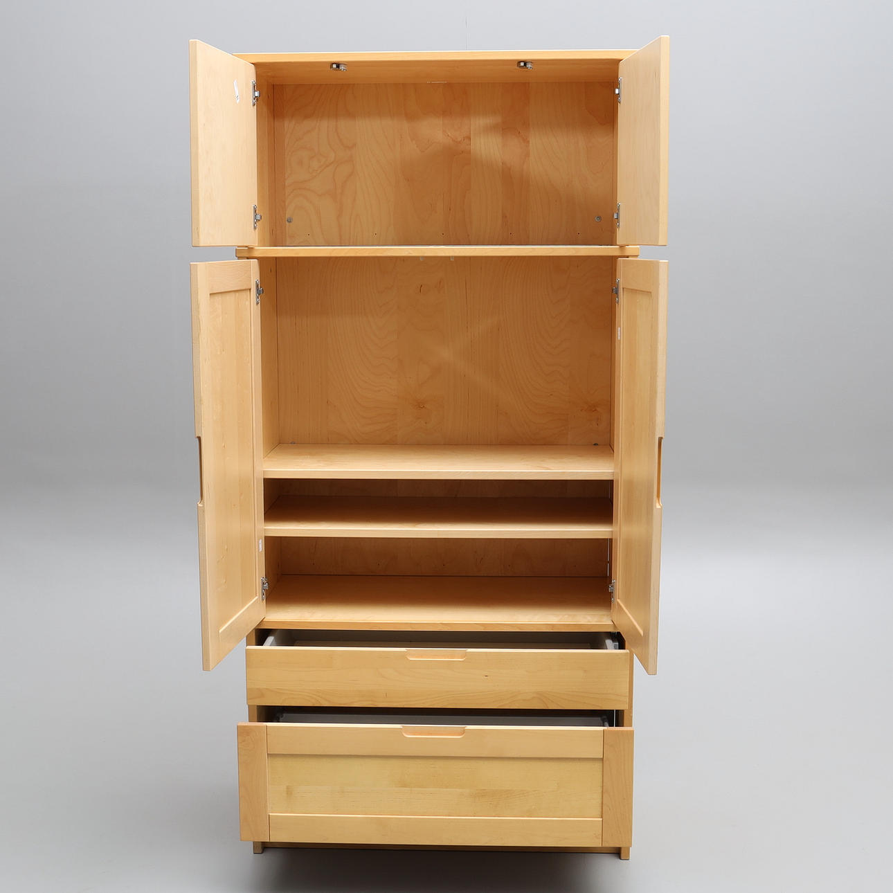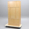 Högskåp, med flera förvaringsmöjligheter, två övre skåp med hyllinredning, två undre lådor. Kan användas som rumsavdelare då baksidan är beklädd.