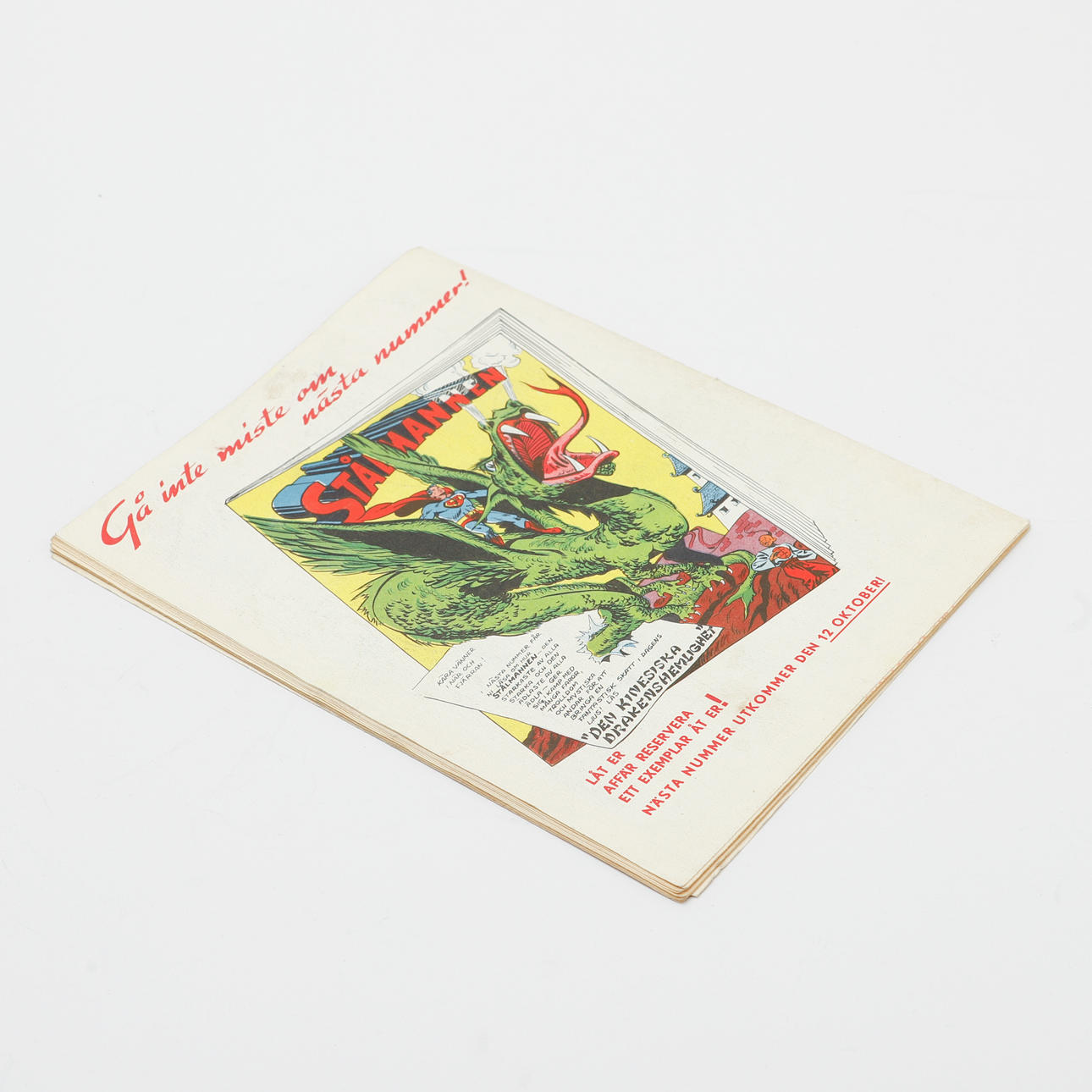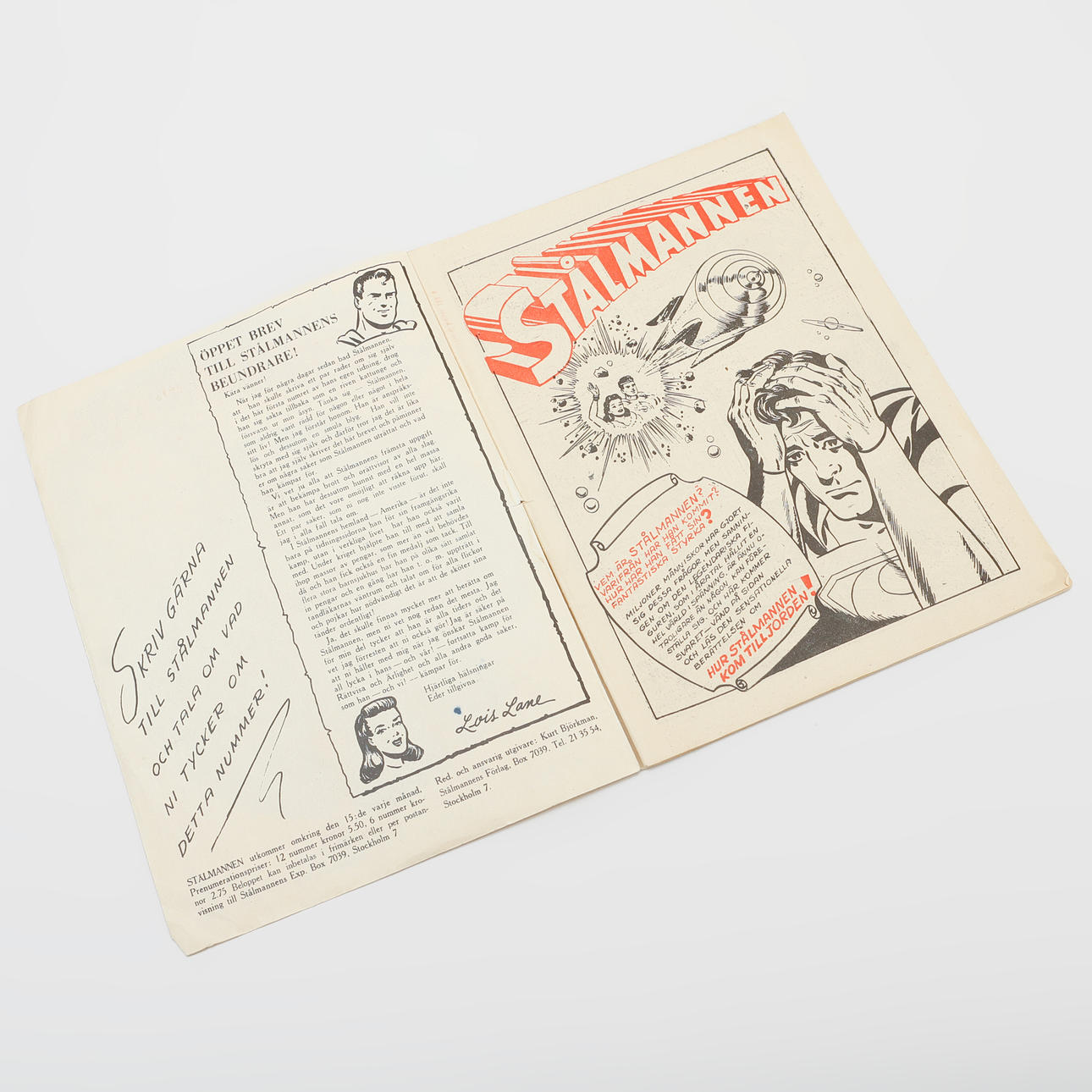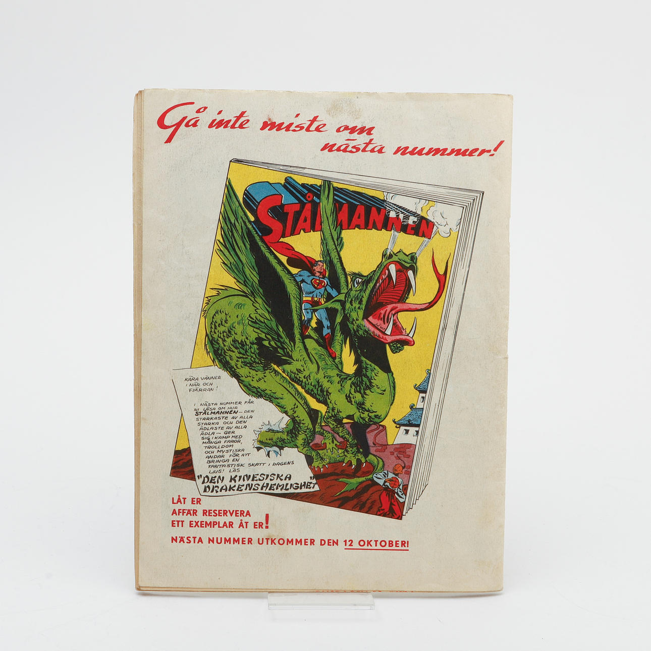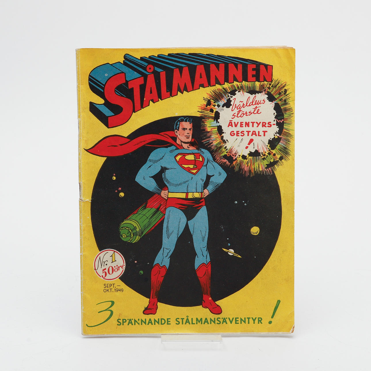 "Stålmannen Världens största Äventyrsgestalt!" "3 spännande Stålmansäventyr!" Nr 1, sep-okt, 1949. Mått 24 x 18 cm.