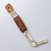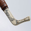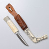 Läder och graverat renhorn. Osignerad. Total längd inklusive balja 15 cm. Knivens längd 13,5 cm.