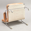 Stomme i stålrör, dynor och armstöd med skinnklädsel.