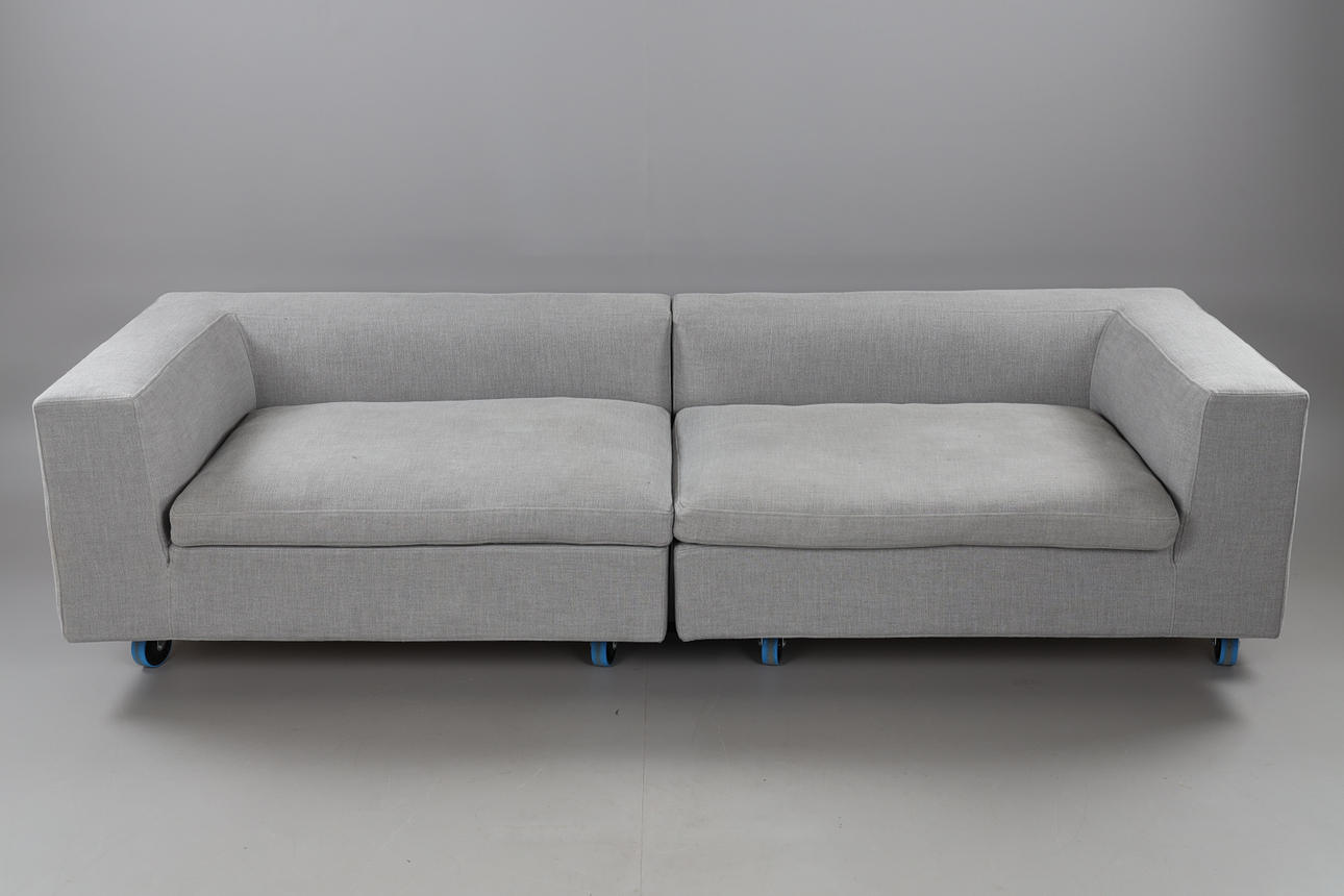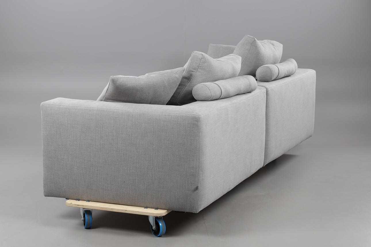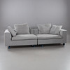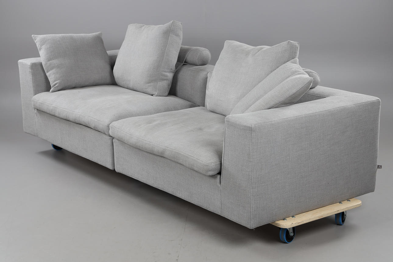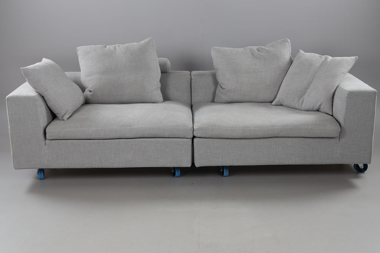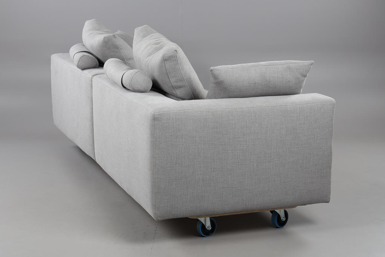 Etikettmärkt, grå klädsel, lösa plymåer, ca 255x95 cm, sitthöjd ca 35 cm