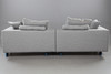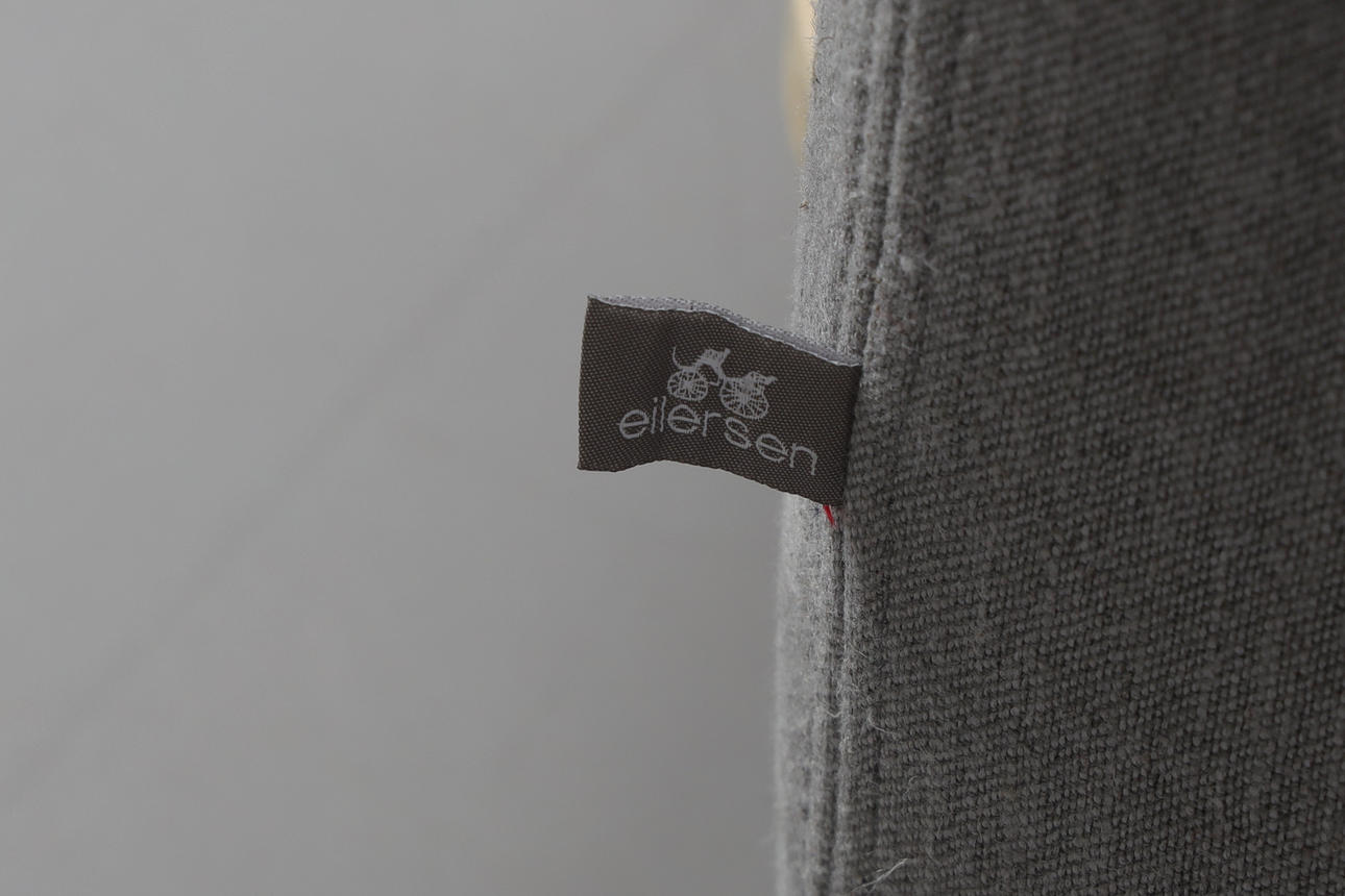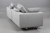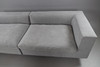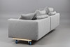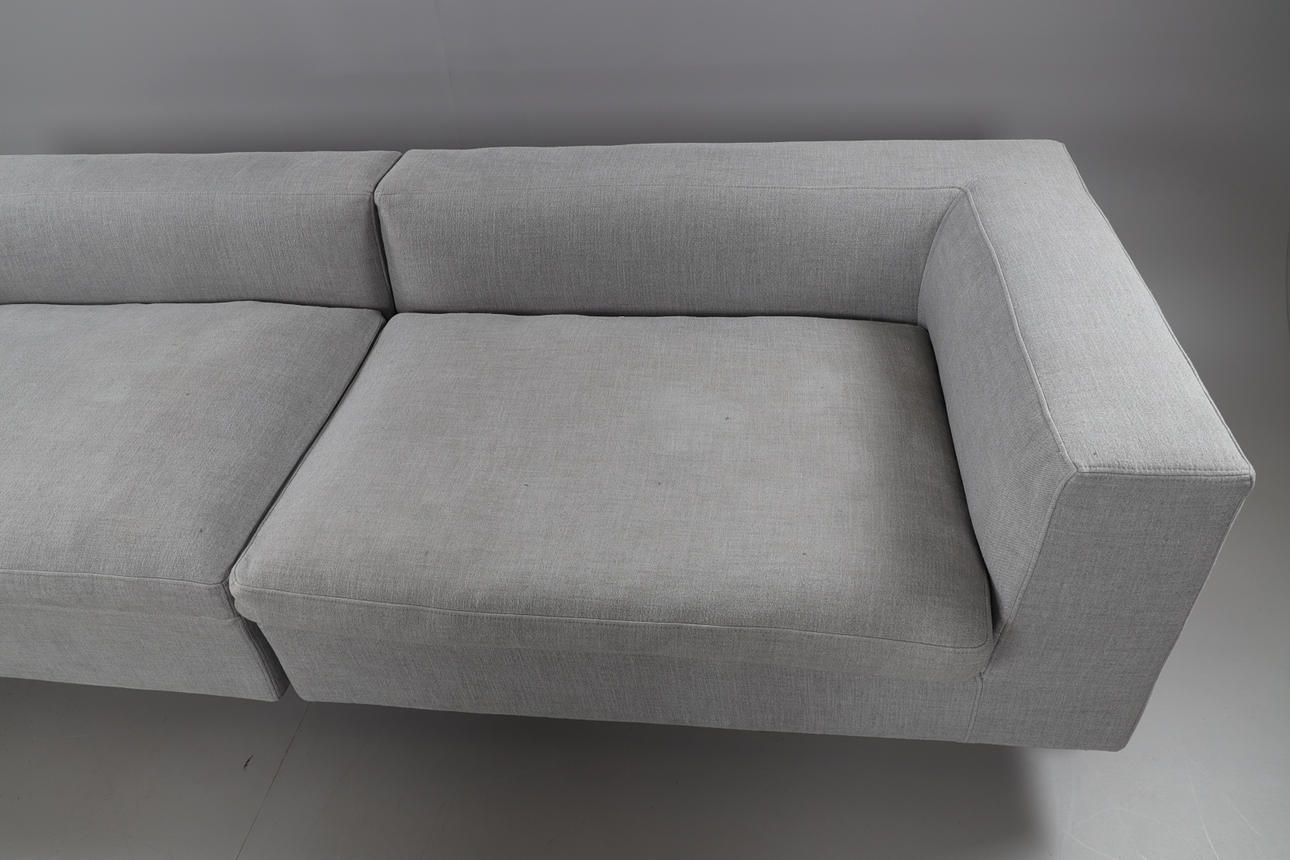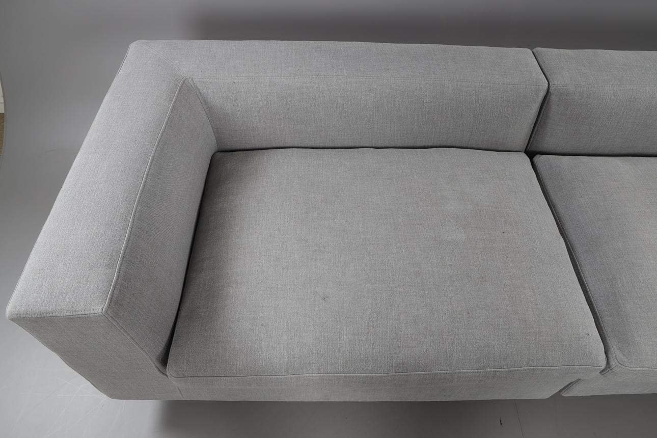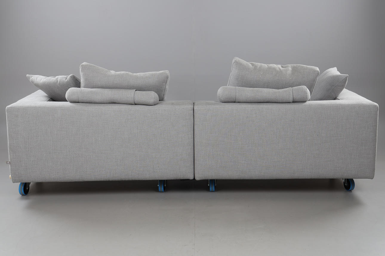 Etikettmärkt, grå klädsel, lösa plymåer, ca 255x95 cm, sitthöjd ca 35 cm