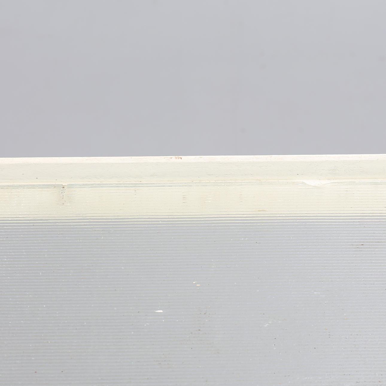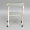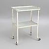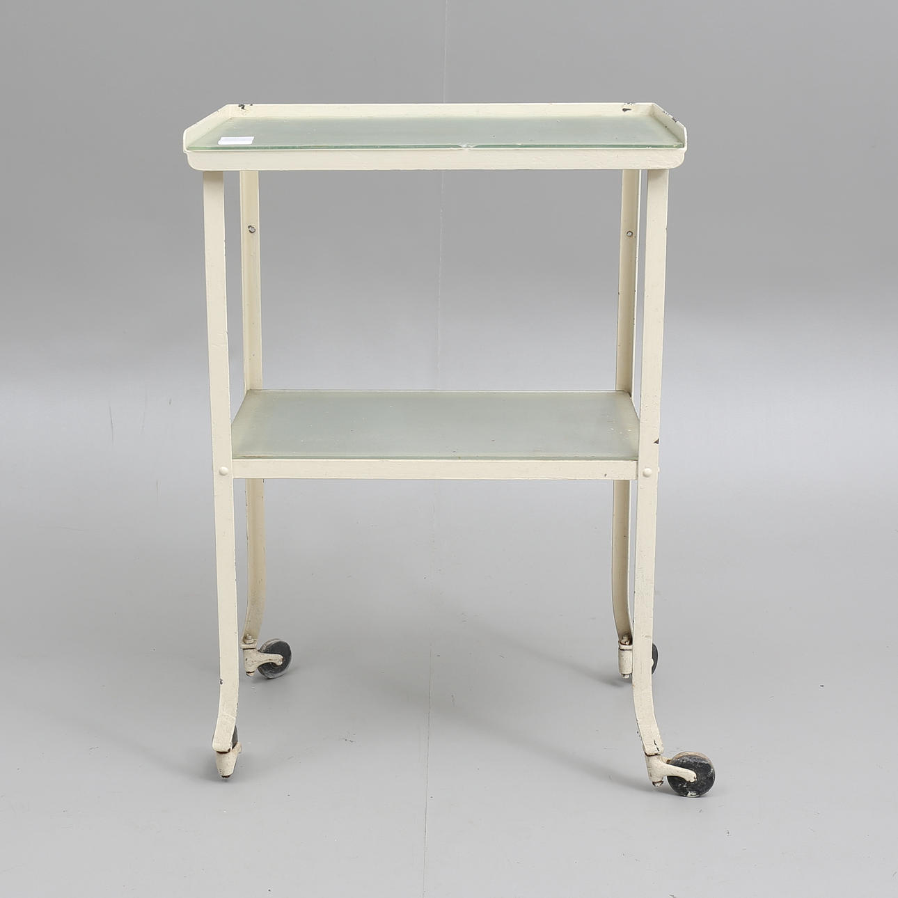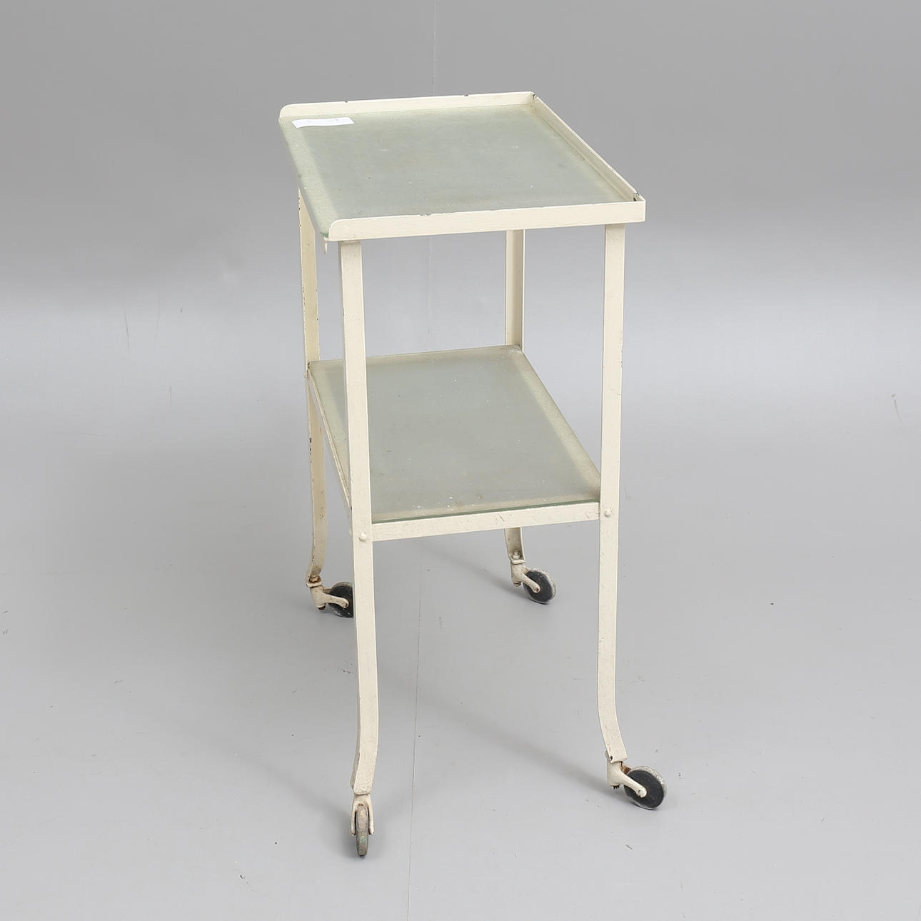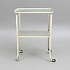 Metall med räfflade glashyllor, längd 61, bredd 40, höjd 89 cm.