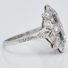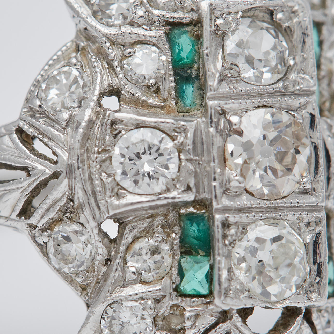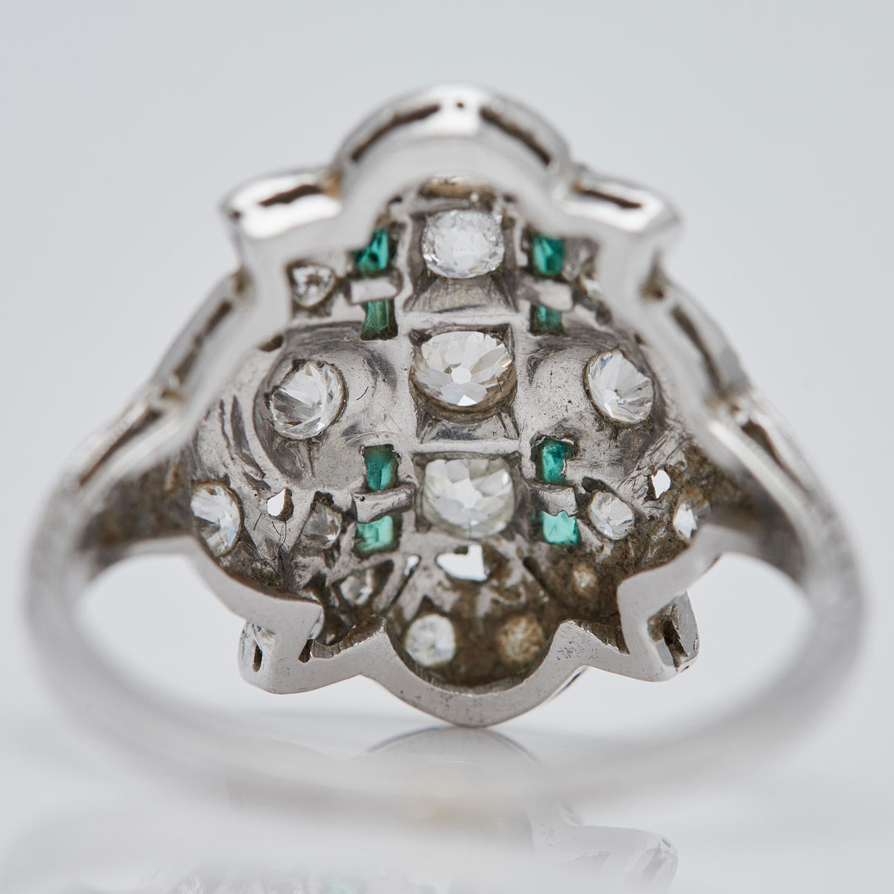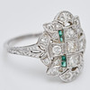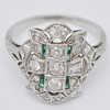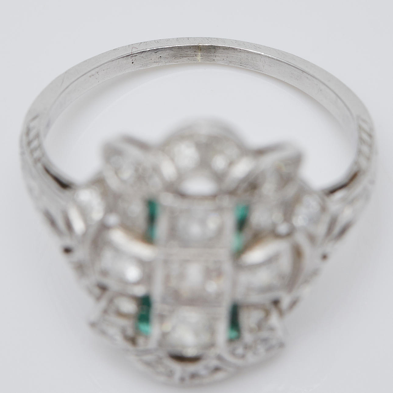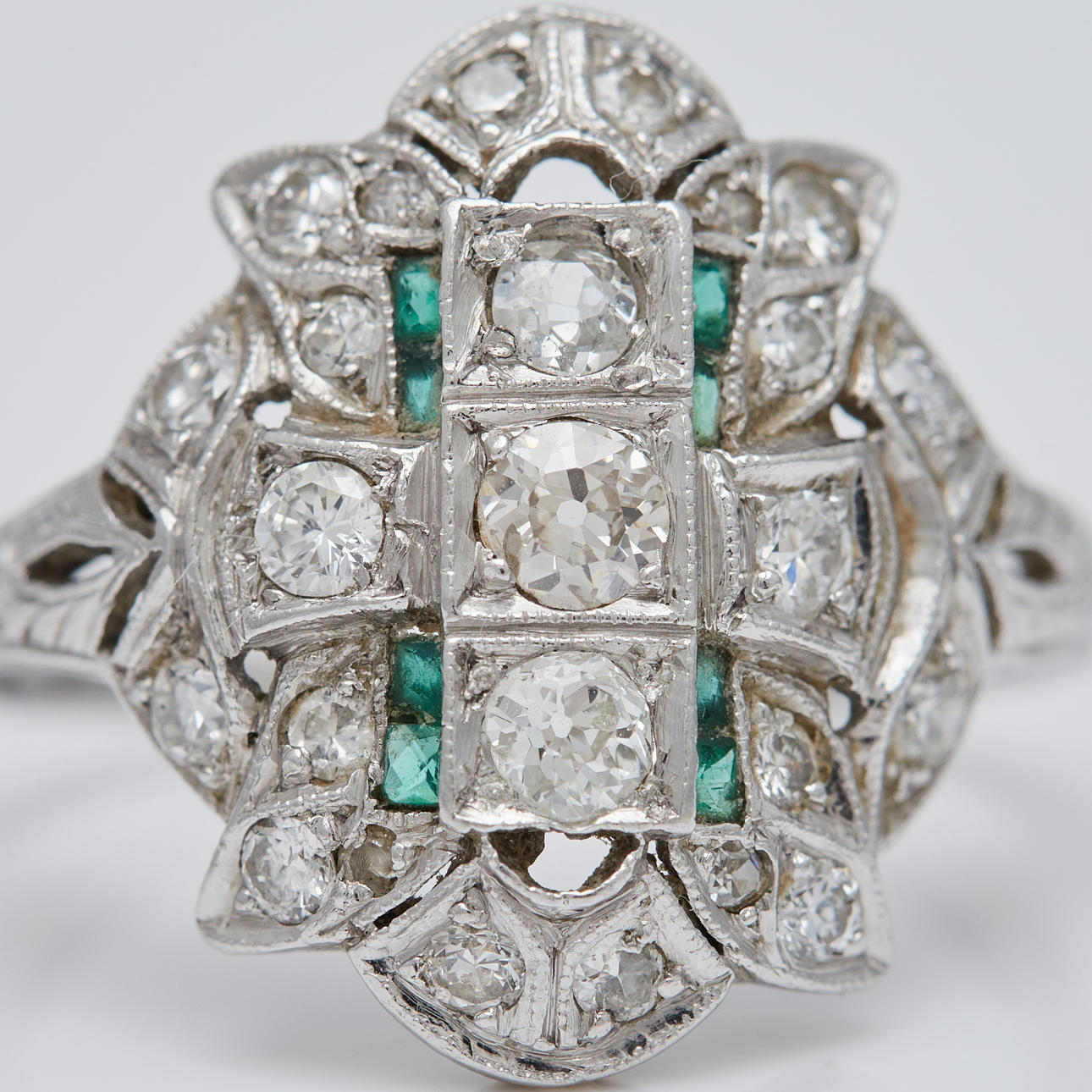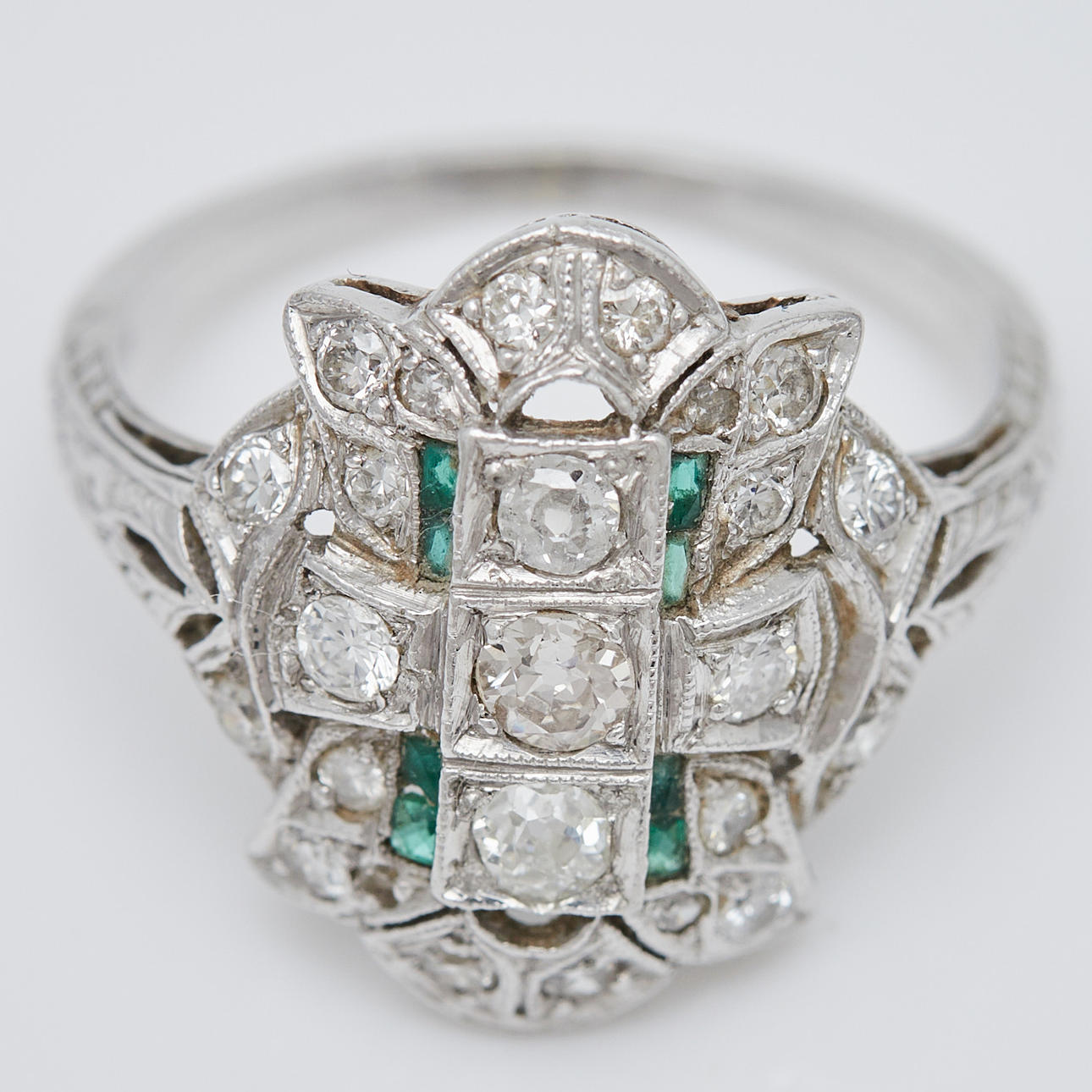 Ring av platina, infattad med smaragder och gammalslipade diamanter totalt ca. 1 ct. Färg: kristall (K), renhet: SI, ringstorlek: ca. 52, ringhuvudets bredd: 8,5 mm, legering testad, vikt: 4,2 g.
