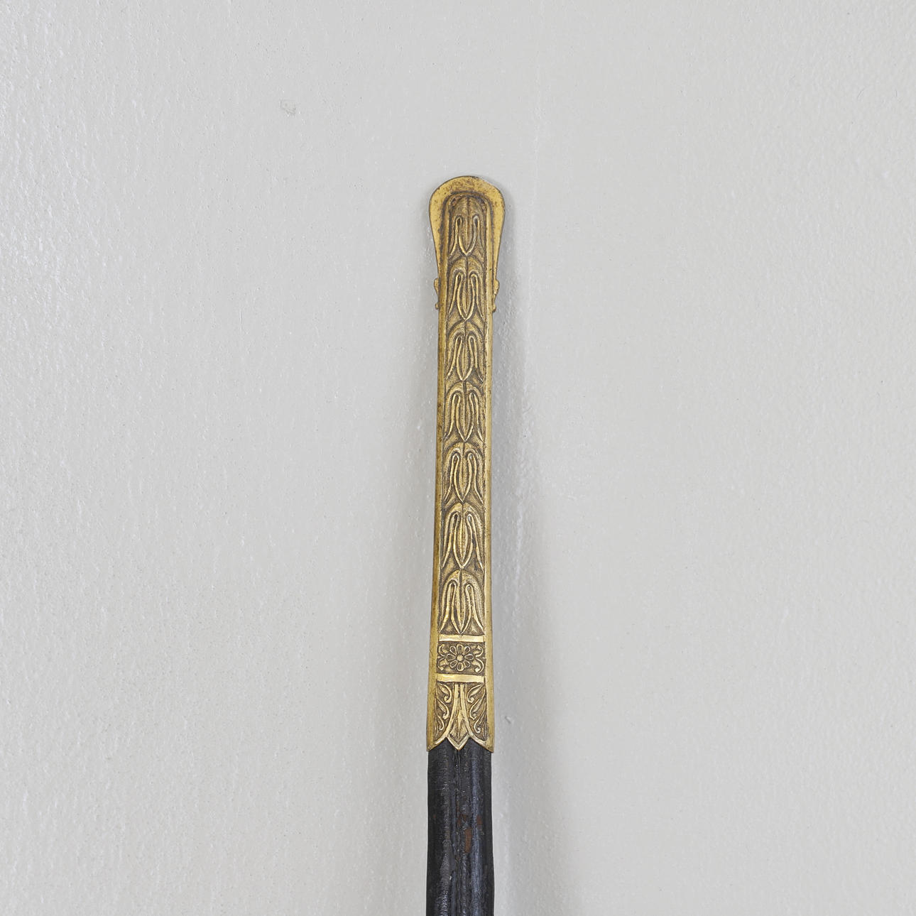 Hjalt i svärtat trä. Mindre parerstång i mässing. Klinga i stål. Balja i läder. Munbleck och doppsko i mässin. Längd svärd/värja ca 102 cm.