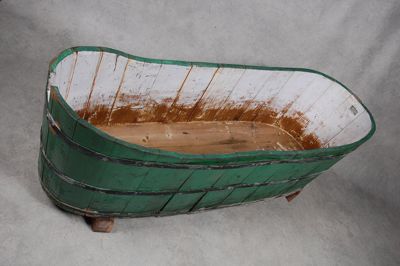 Badkar, 1900-talets början, trevlig för trädgården istället för badtunnan. Längd 180 cm Bredd 60 cm Höjd med ställning 69-75 cm.