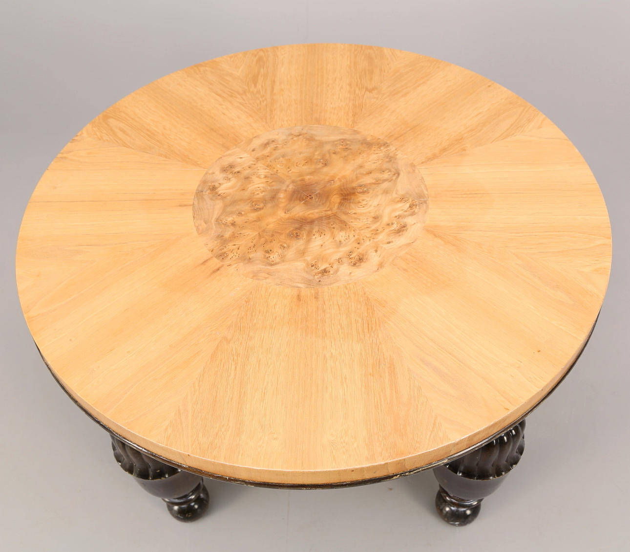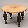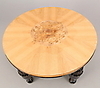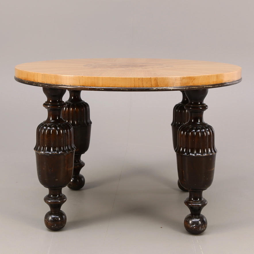 Balusterformade ben, ljus skiva i två träslag, rotintarsia dekor. Höjd 61, diam 90 cm.