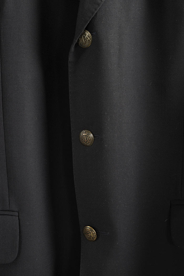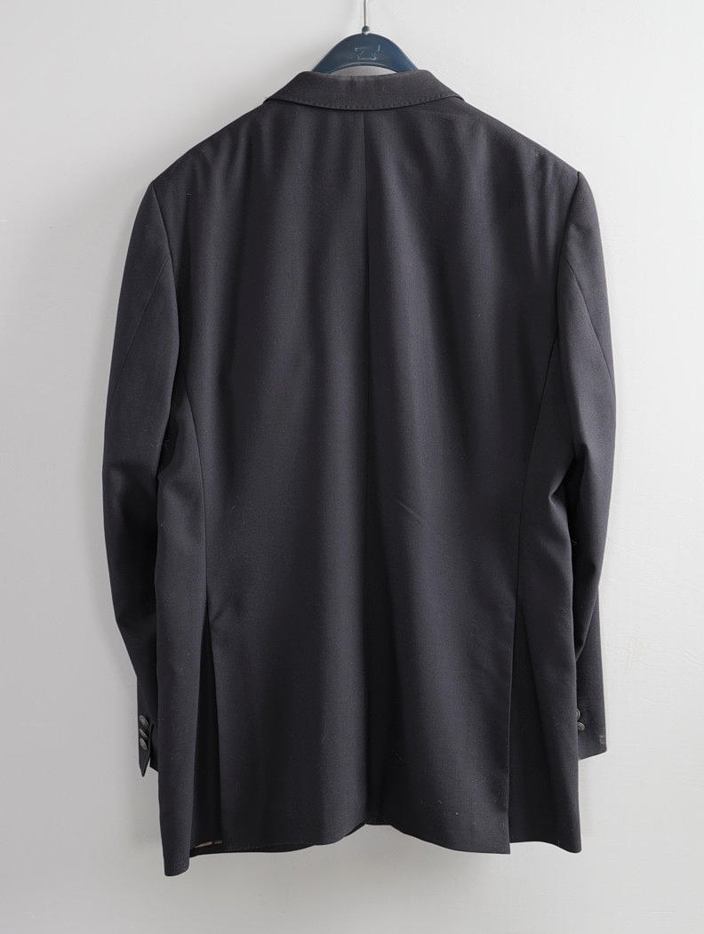 Mörkblå kavaj i tunn ull, fodrad med klassiskt rutigt fodertyg. Storl 52, Bröstvidd ca 110 cm. längd ca 85 cm.