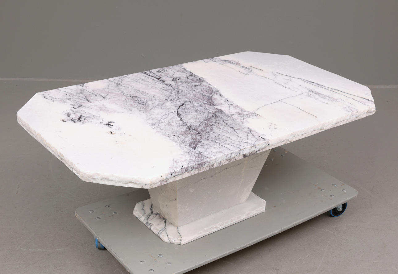Soffbord med skiva och bas i vit marmor.