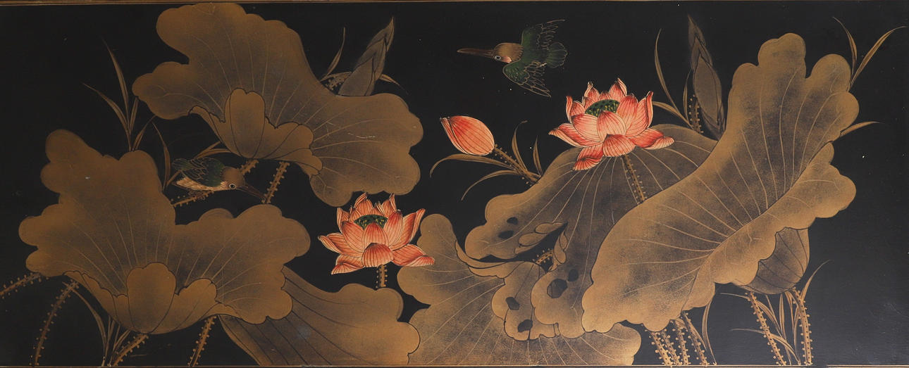 Av vinklad form, topp och sidor målade med kolibrier bland lotusblommor och annat lövverk, 123cm bred x 41 cm djup x 71 cm hög.