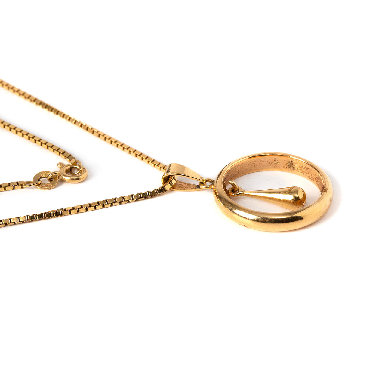 Hänge med höjd ca 3 cm. Kedja från Balestra, Italien, längd ca 50 cm. Total vikt 14,1 gram.