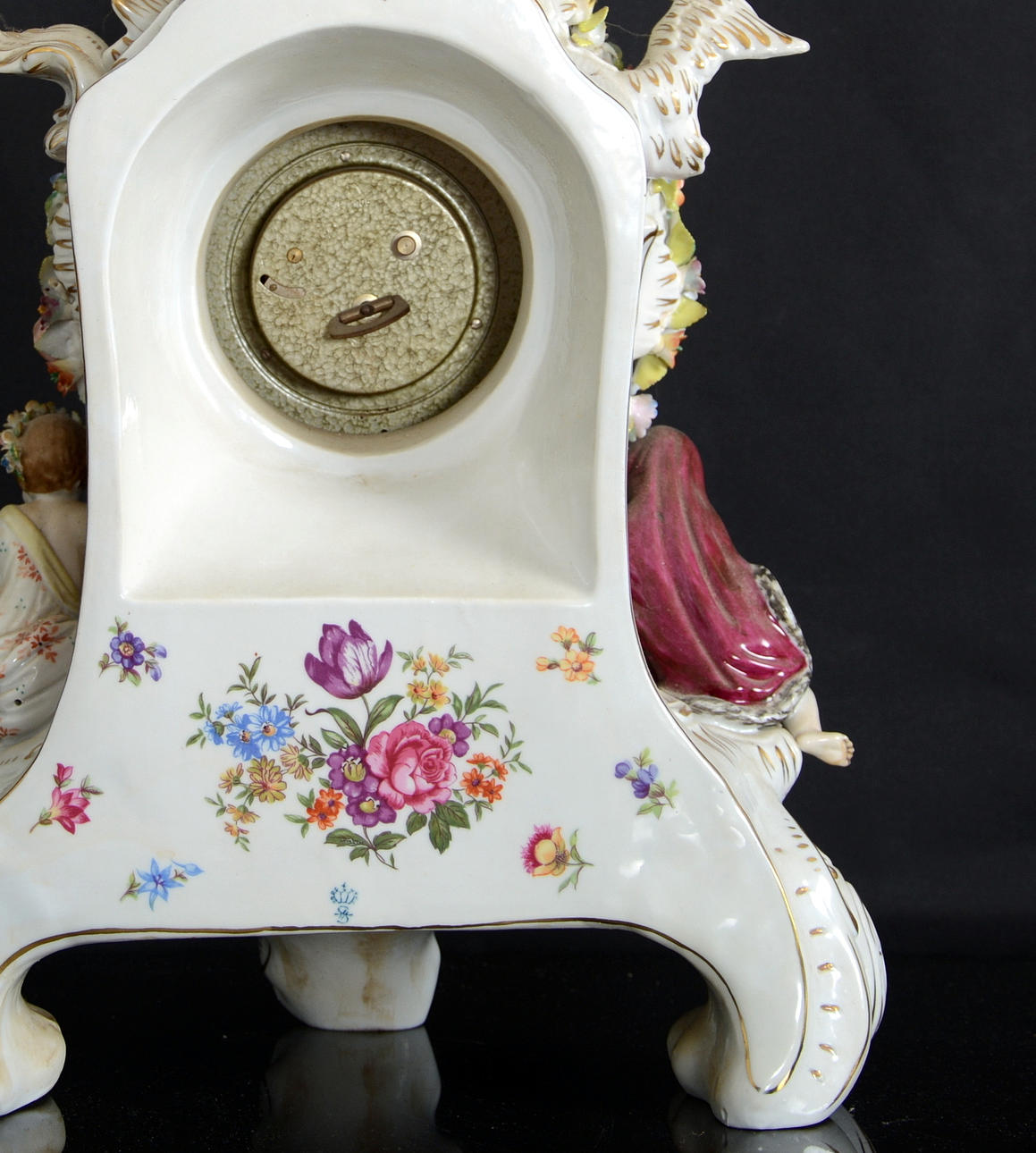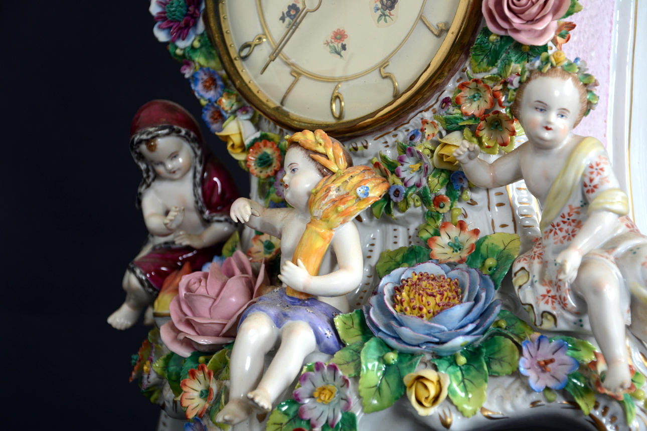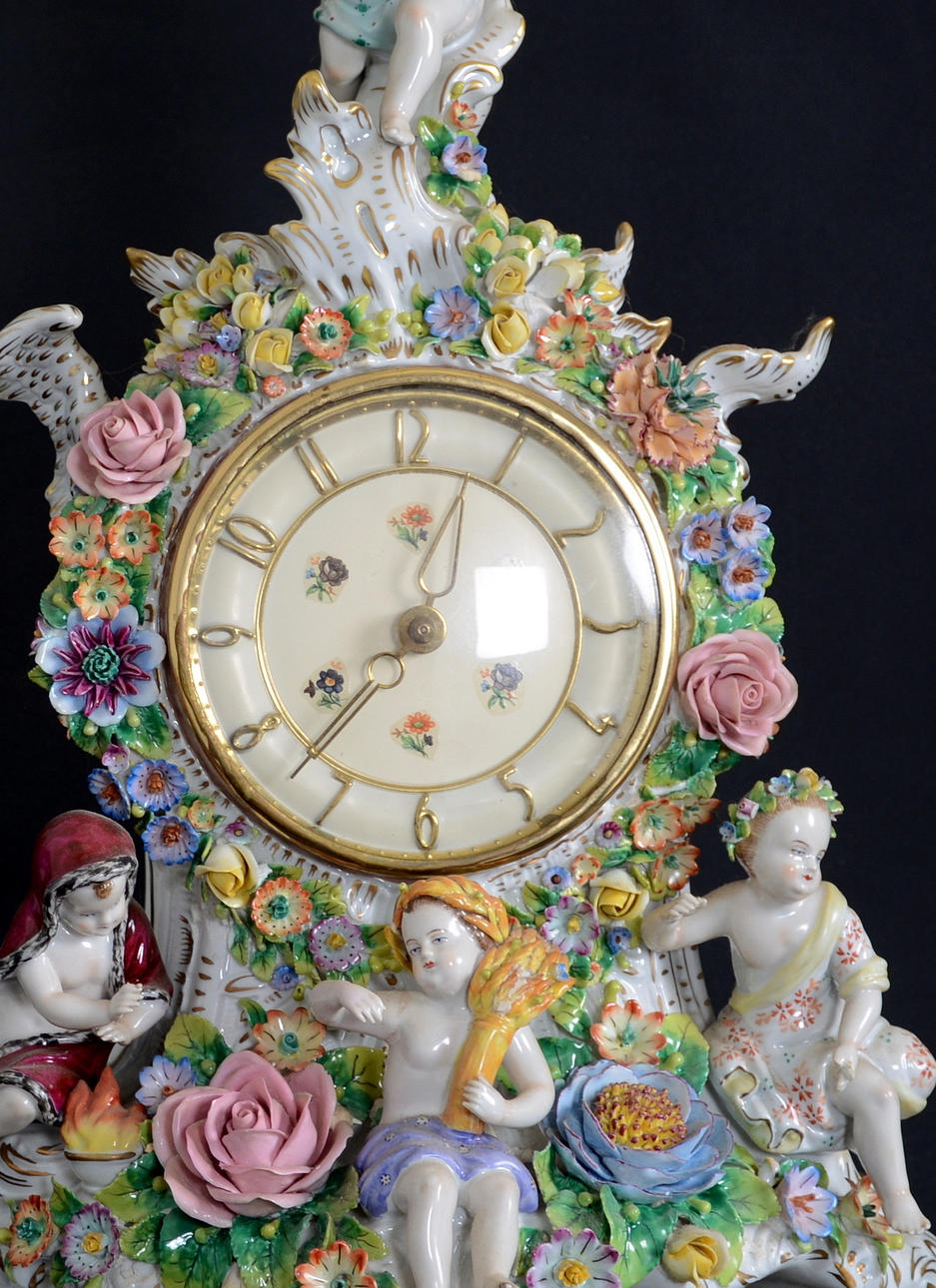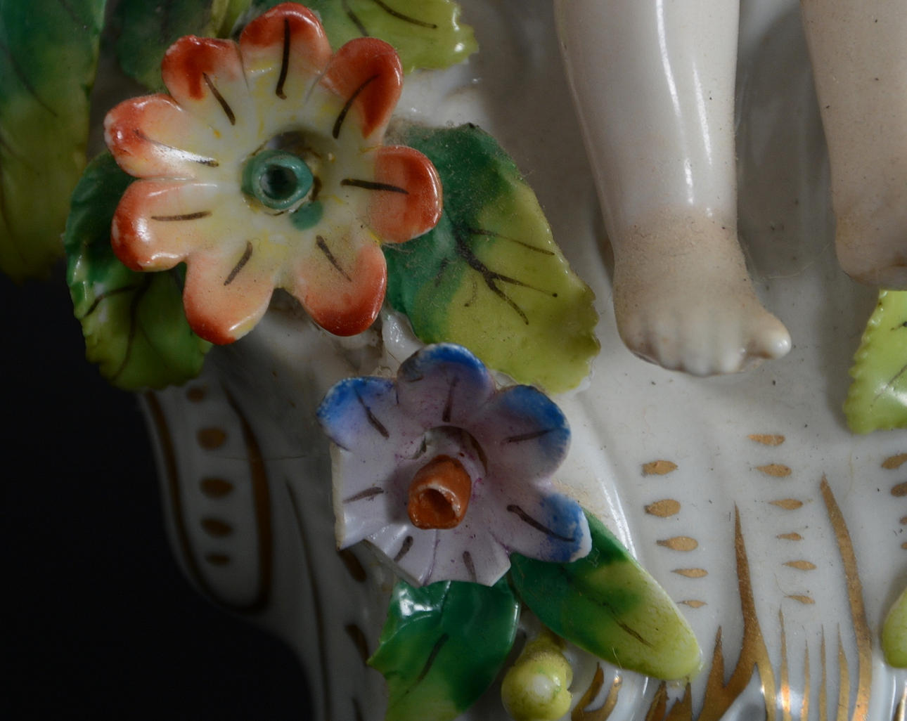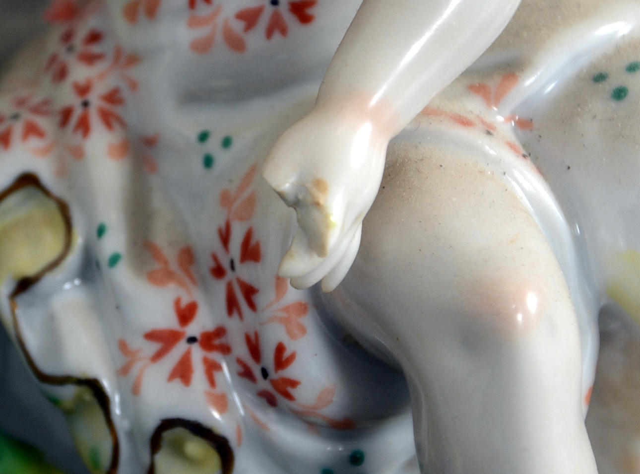 Omfattande skador. En arm limmad på bordsuret. Avslag på fingrar och blommor.