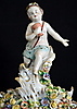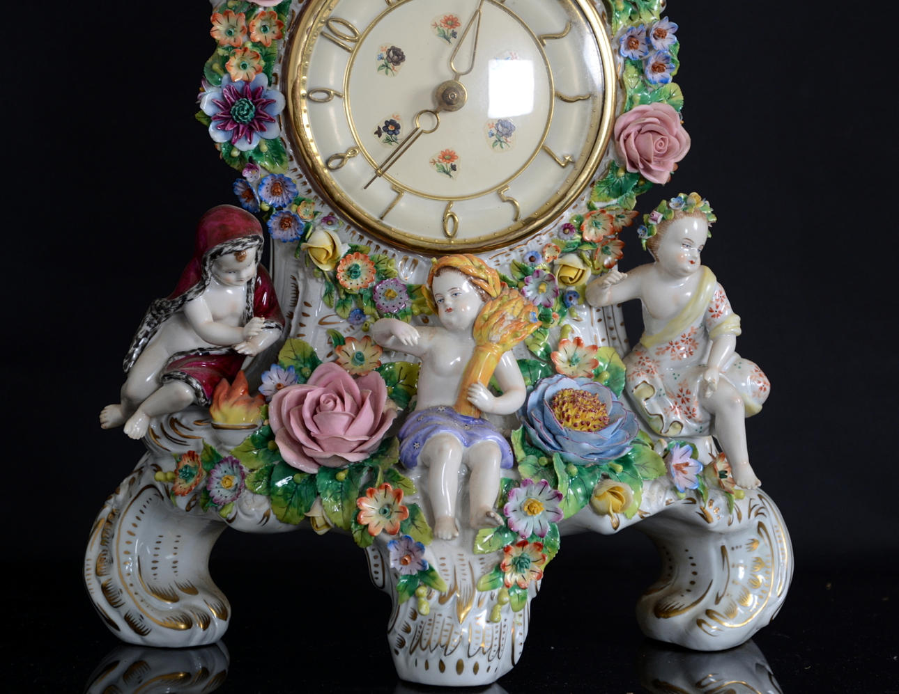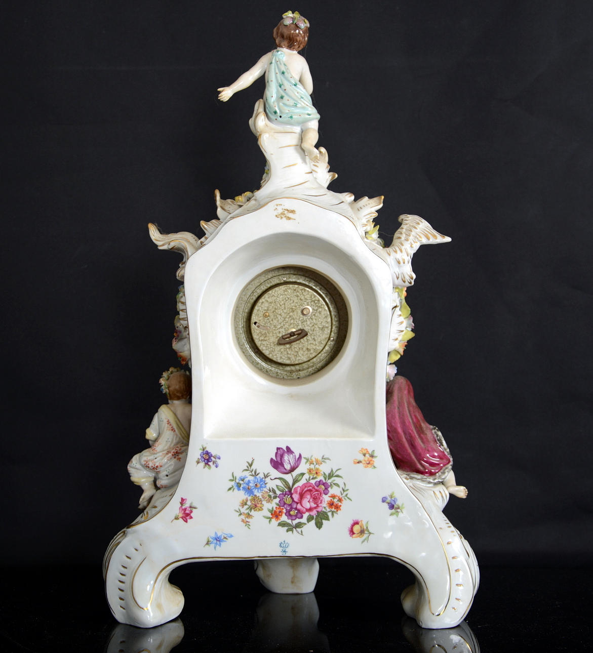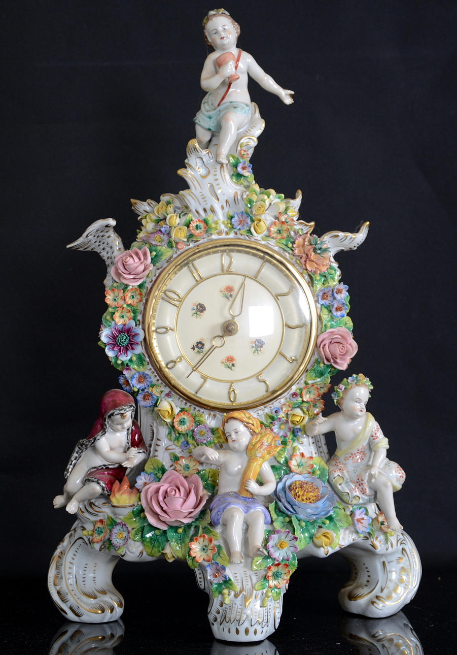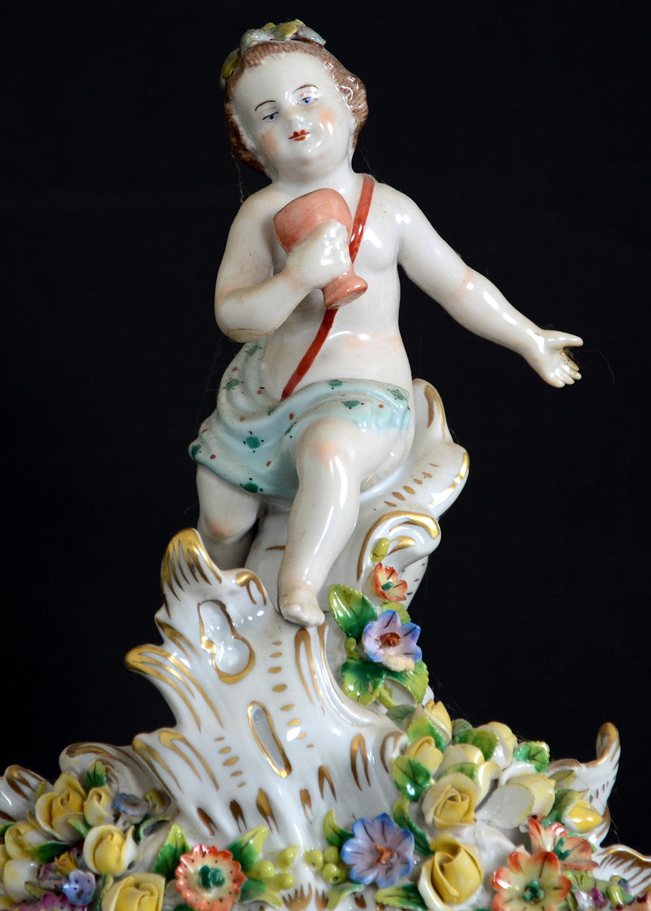 Omfattande skador. En arm limmad på bordsuret. Avslag på fingrar och blommor.