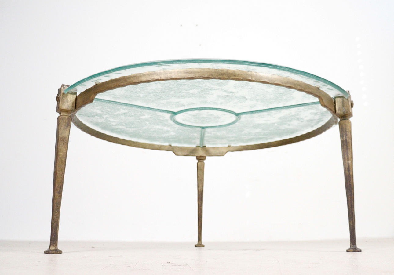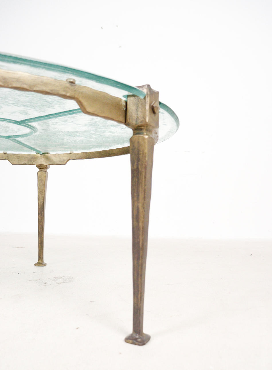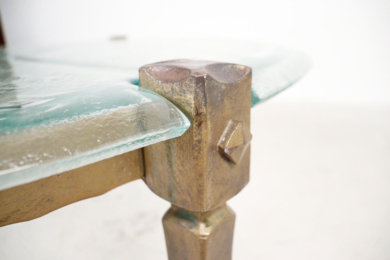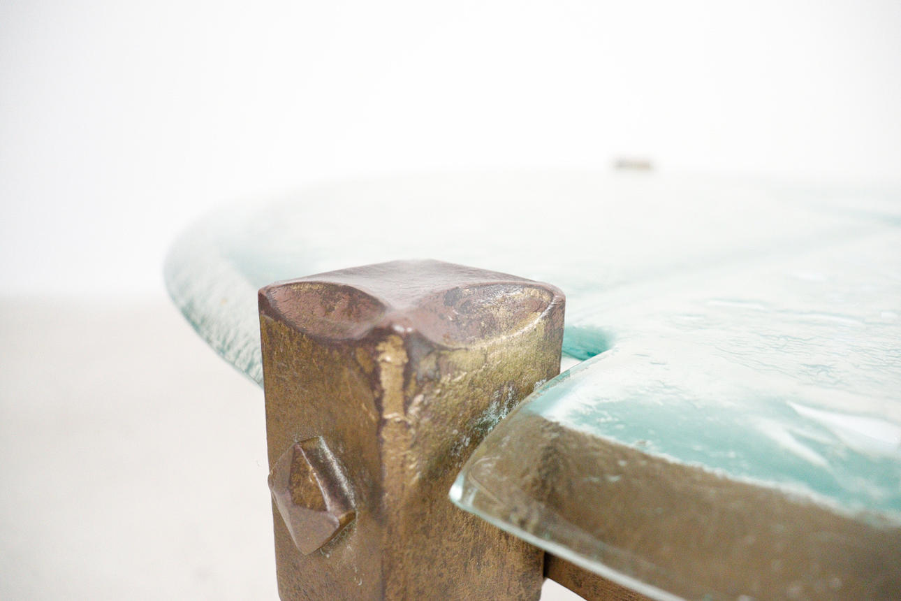 Brutalistiskt soffbord från 1970-talet, solid konstruktion av handsmidd järn, brunpatinerad, med lös gjuten blykristallskiva,