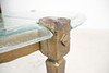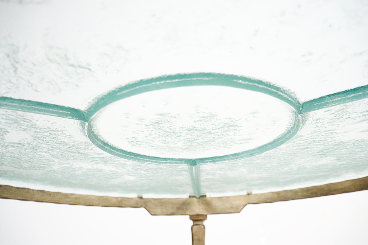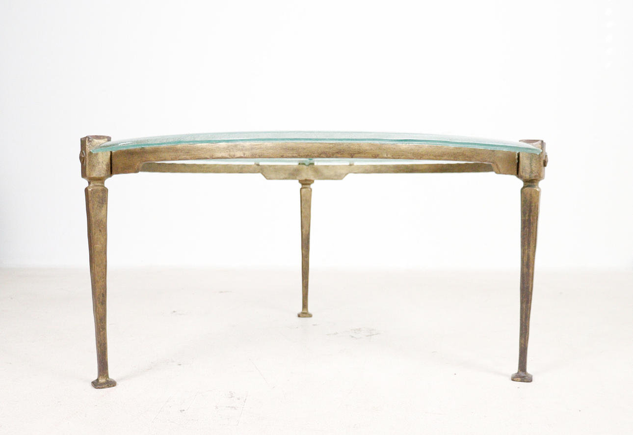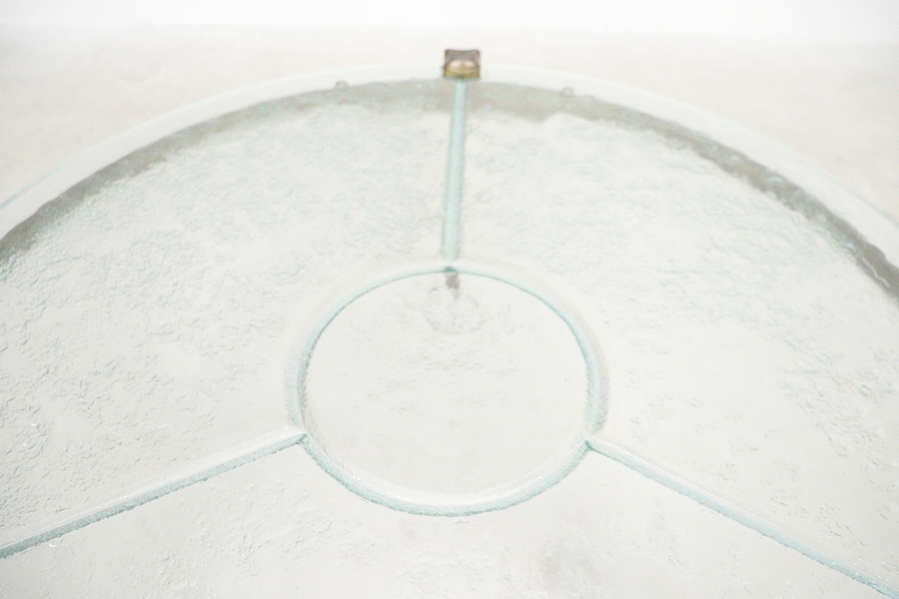 Brutalistiskt soffbord från 1970-talet, solid konstruktion av handsmidd järn, brunpatinerad, med lös gjuten blykristallskiva,
