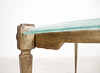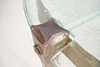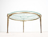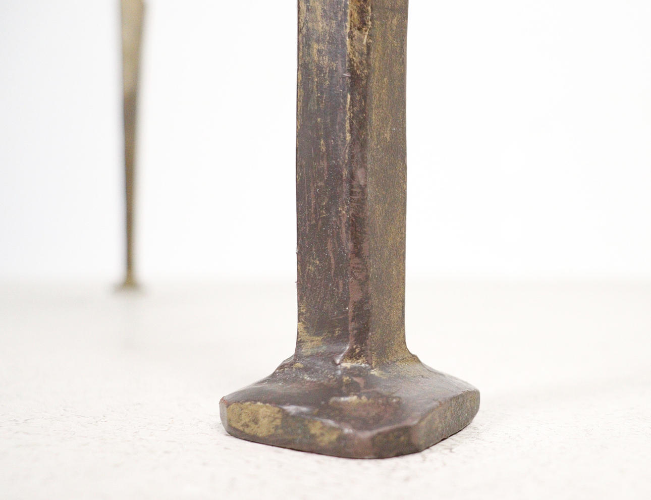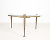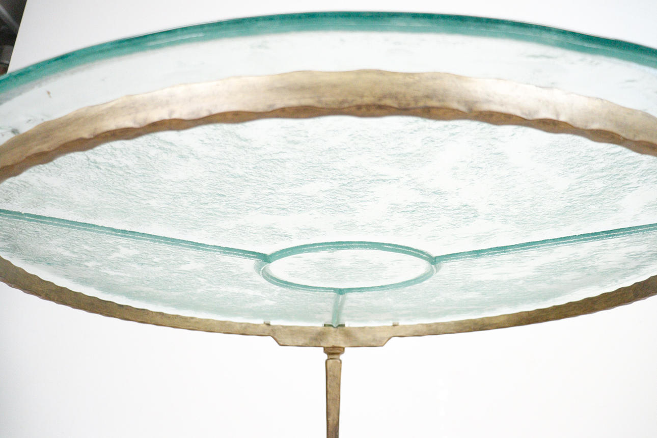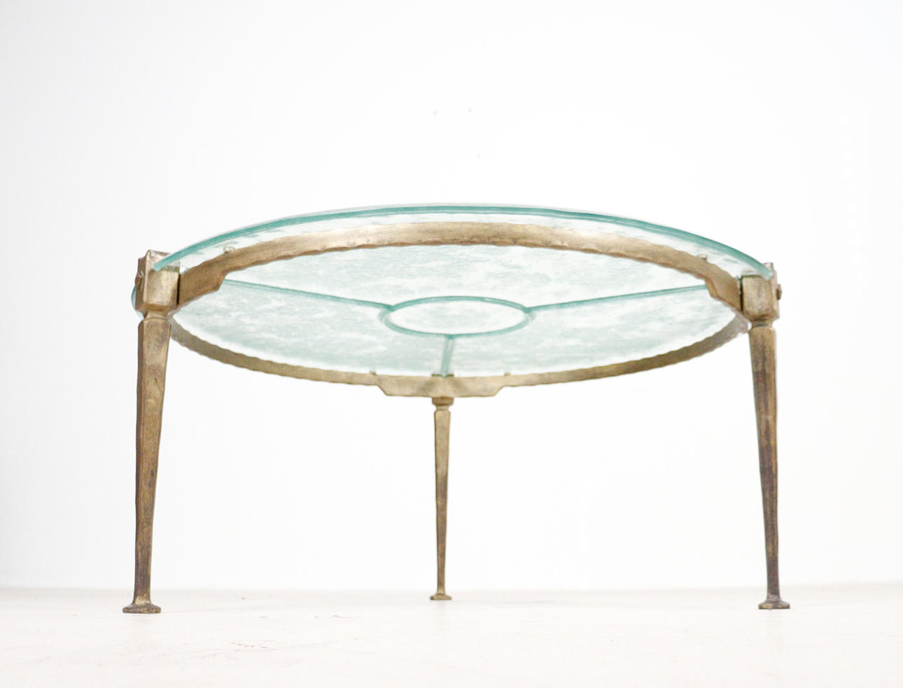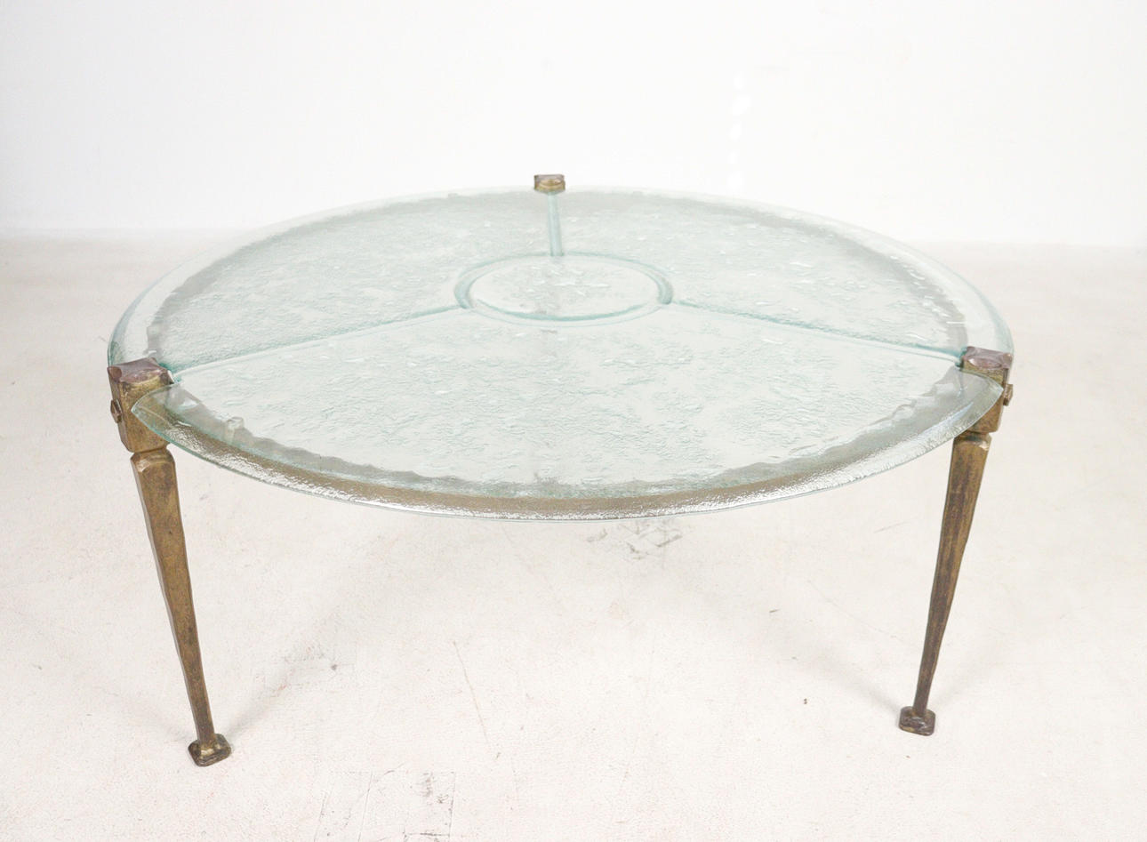 Brutalistiskt soffbord från 1970-talet, solid konstruktion av handsmidd järn, brunpatinerad, med lös gjuten blykristallskiva,