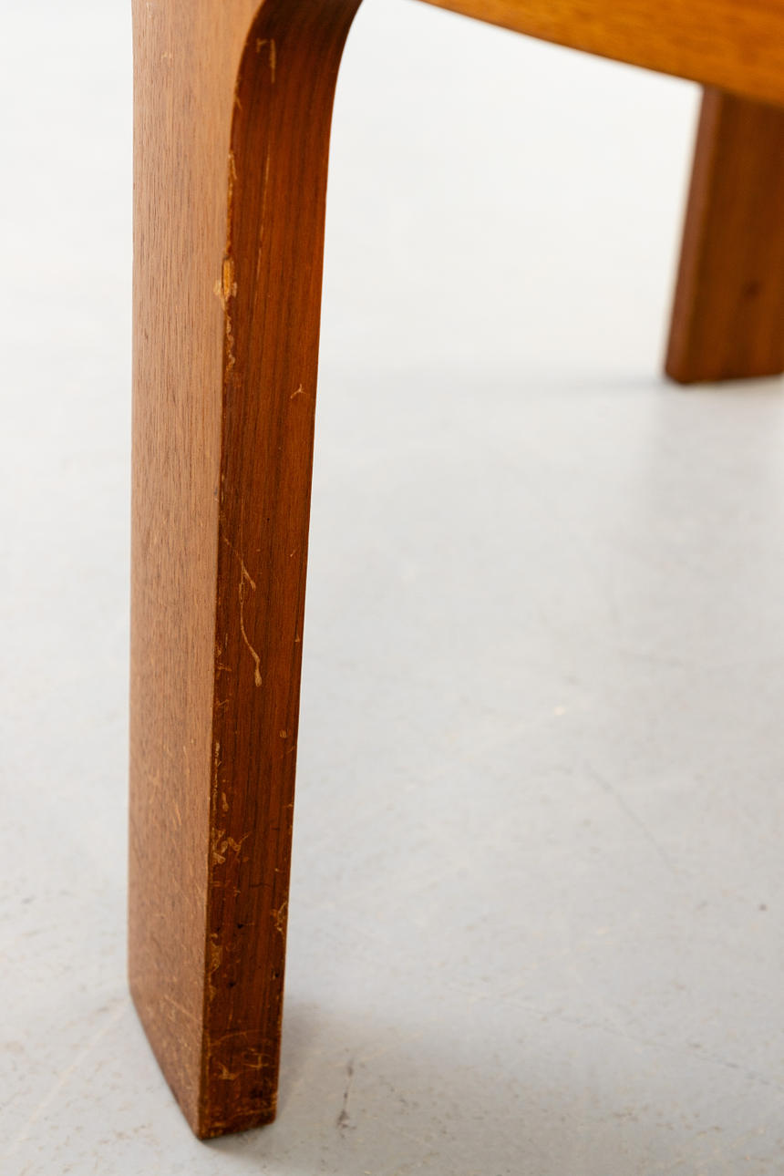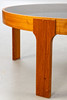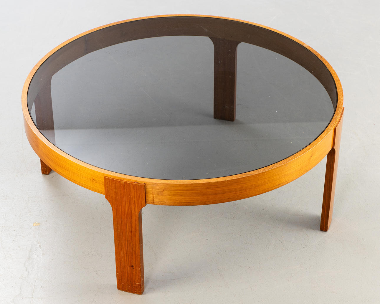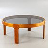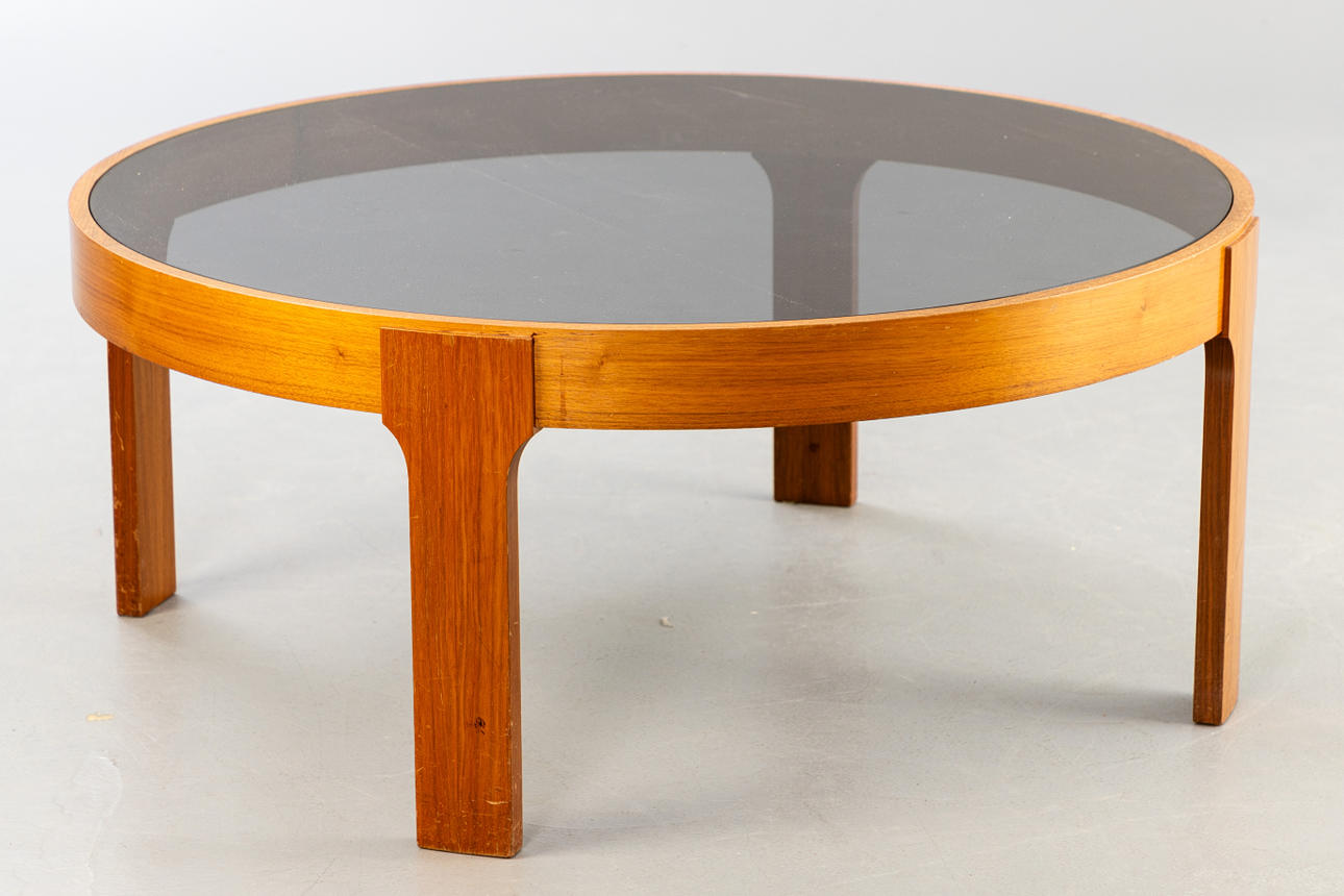 Runt soffbord från 1970-talet. Fanerad träram med löst insatt rökt glasskiva.