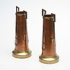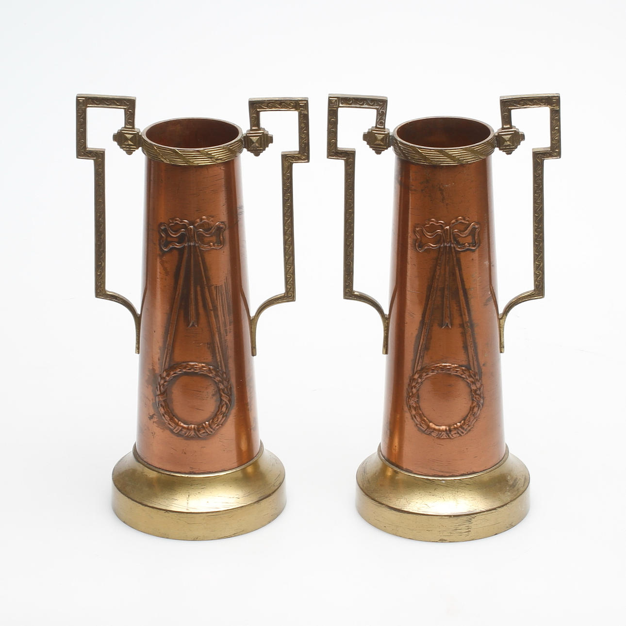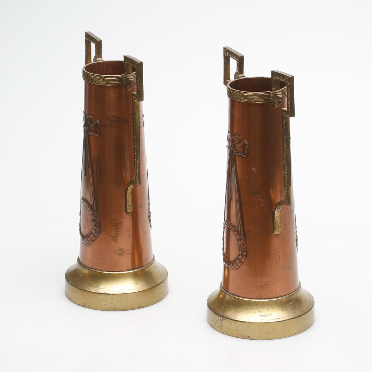 Koppar och mässing. Dekor med bl.a lagerkrans och bandfläta i relief. Märkta F i botten. Höjd 27,5 cm.