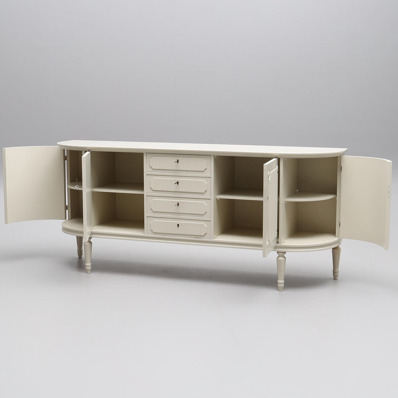 4 skåpsluckor med bakomliggande hyllplan samt 4 låsbara lådor. 4 nycklar finns.