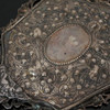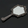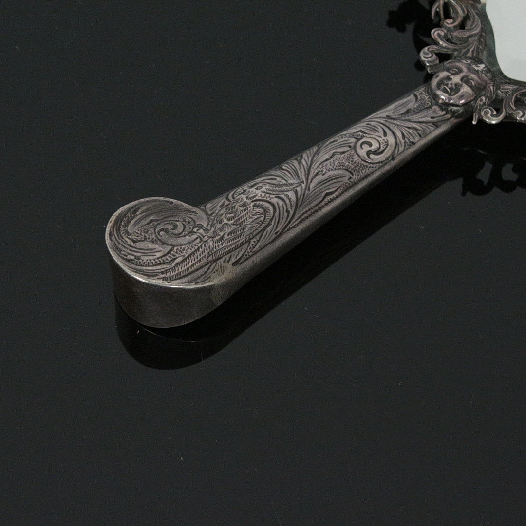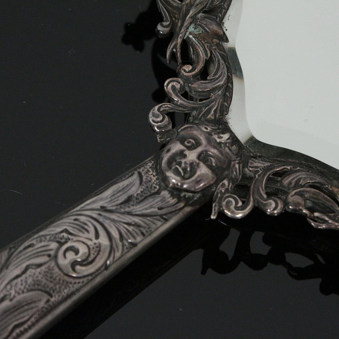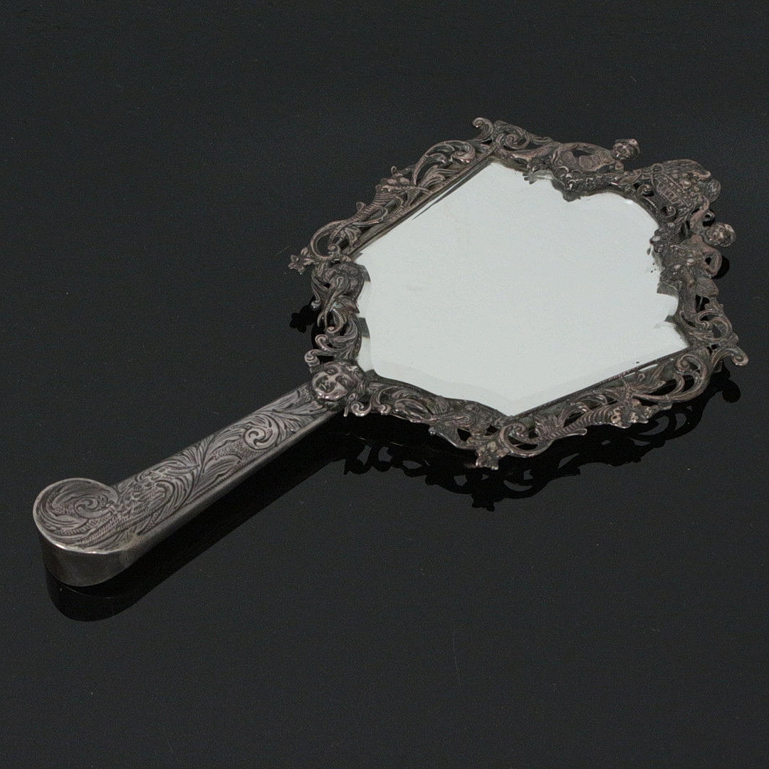 Antik spegel omkring 1845, silver, stämplad med lejonhuvud, striding lejon, drottning Victoria och årsbokstav (K).