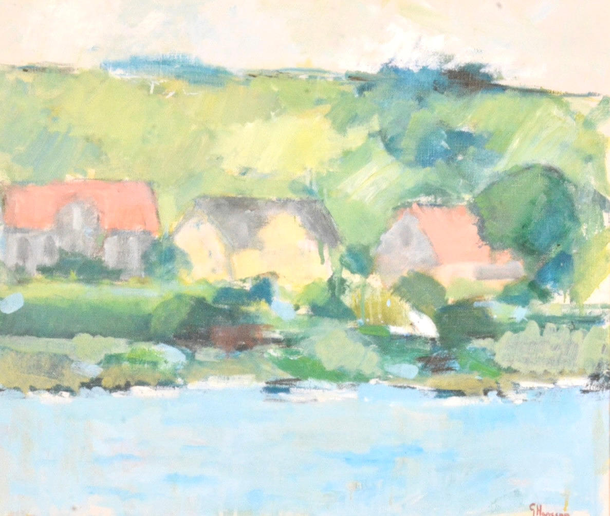 Kustbild med bebyggelse. Signerad. 52x61 cm.