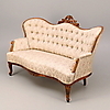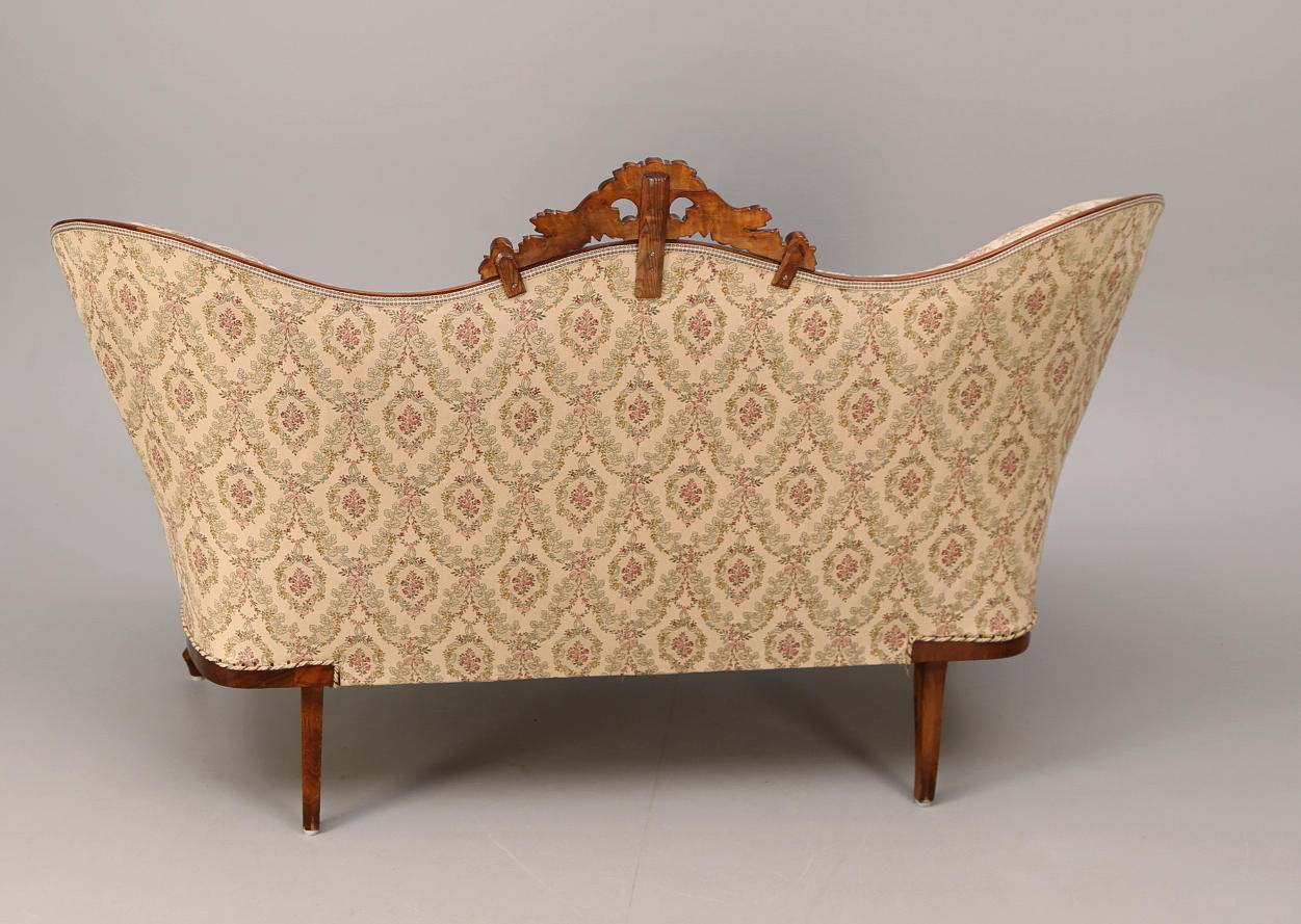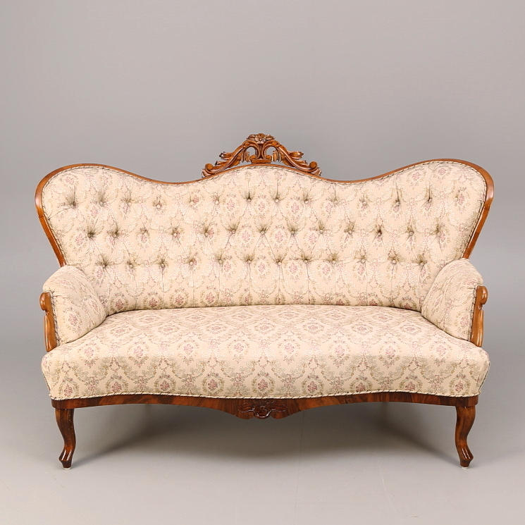 Träskuren dekor, stoppad, djuphäftad rygg, längd 162, rygghöjd 103 cm.