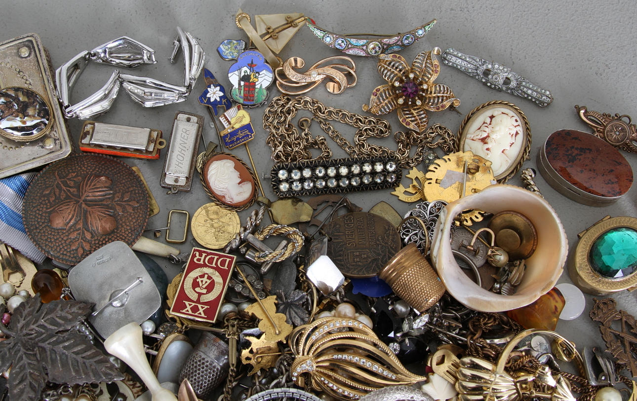 Bland annat broscher, armband, fingerborgar, dosor mm.