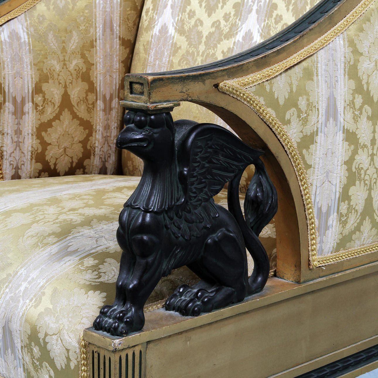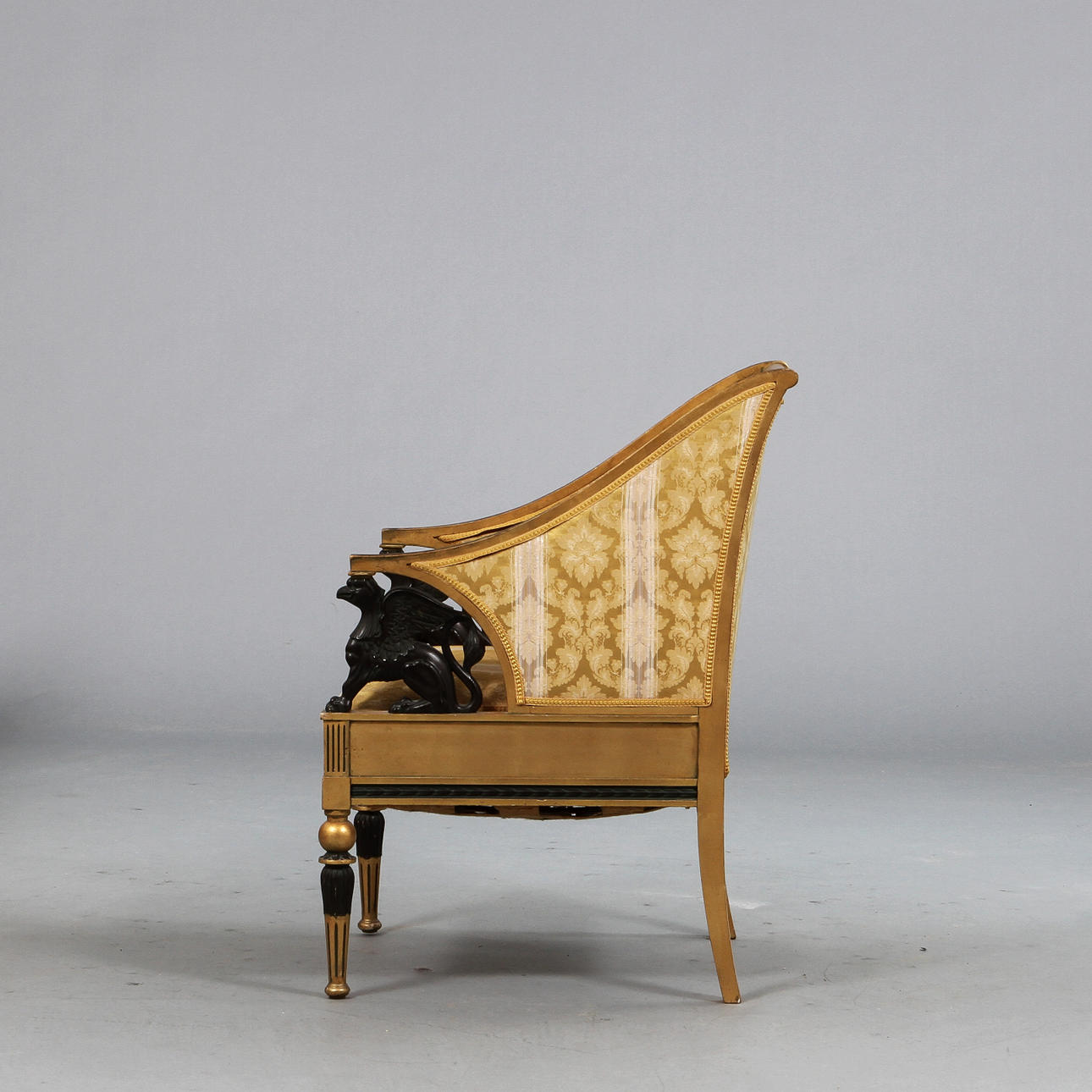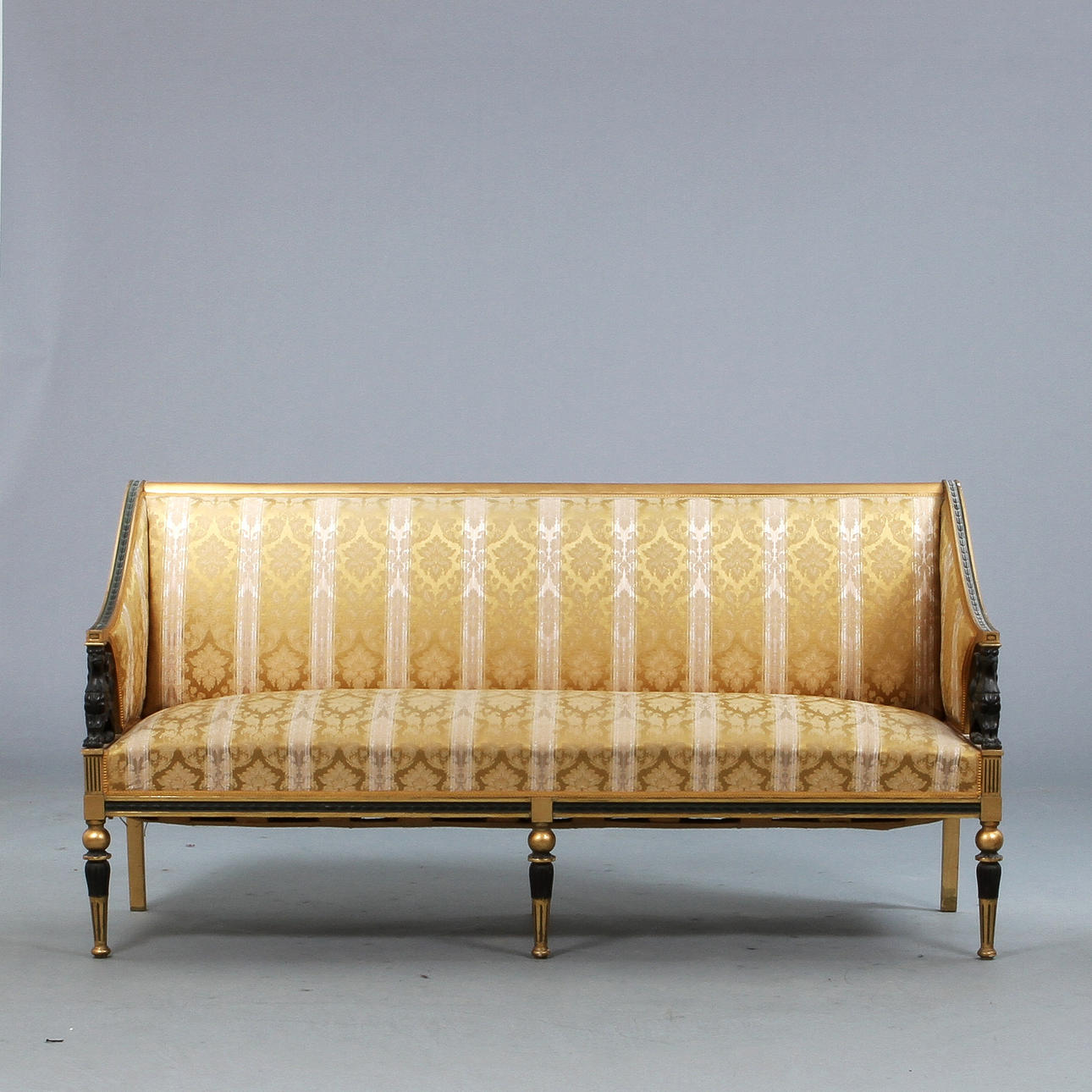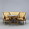 Soffa, längd 185 cm, 2 fåtöljer, bord med stenskiva, diameter 85 cm, höjd 76 cm.