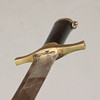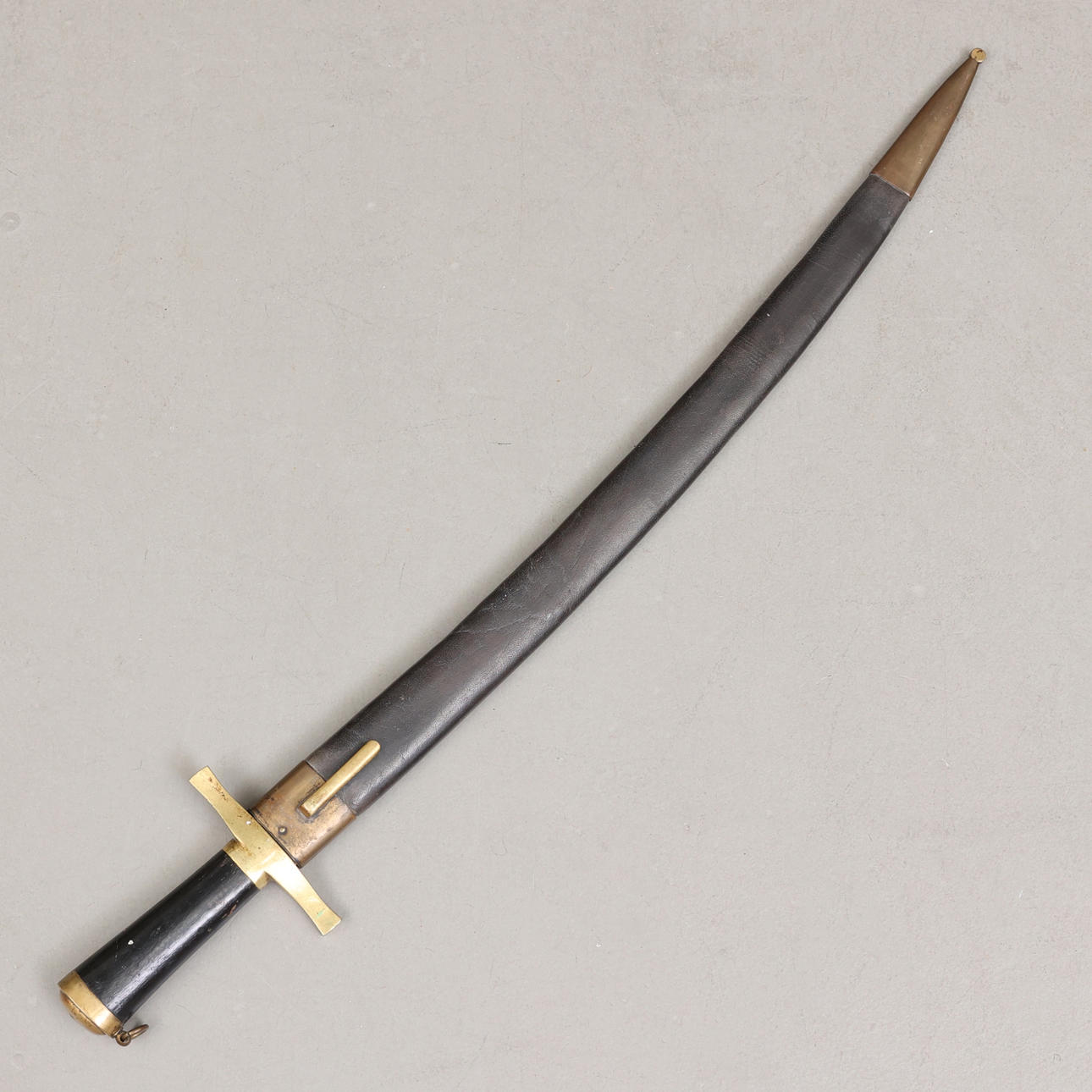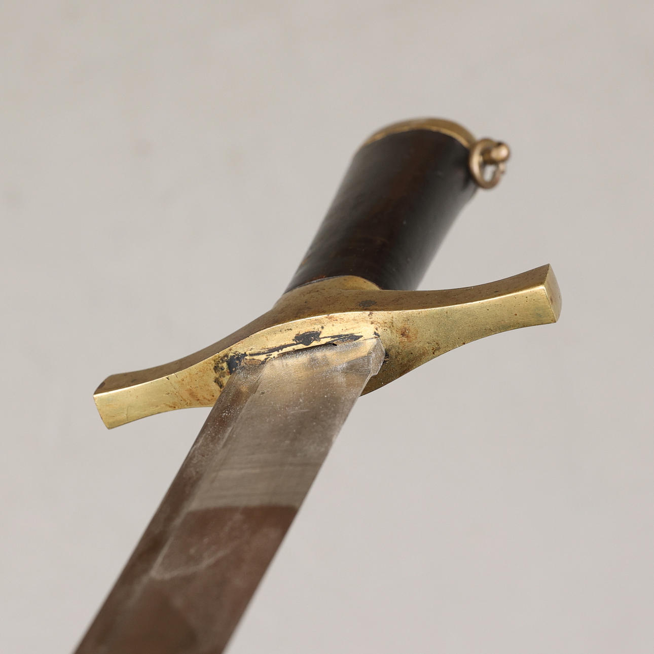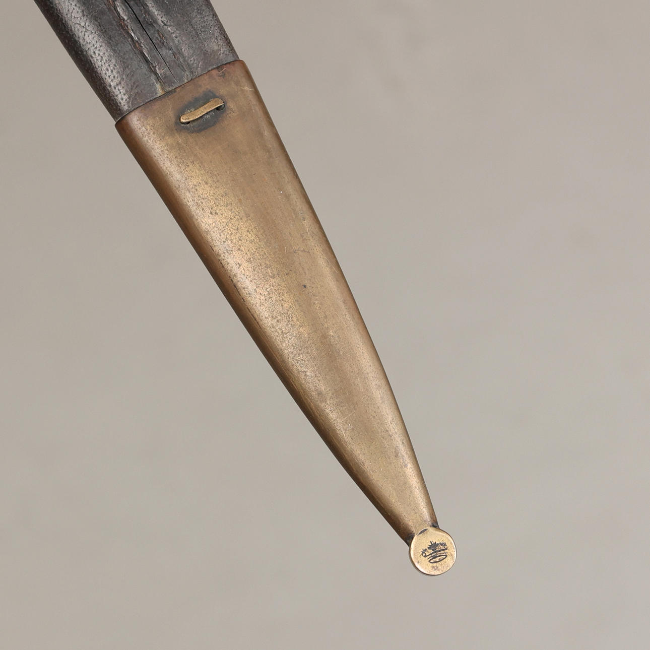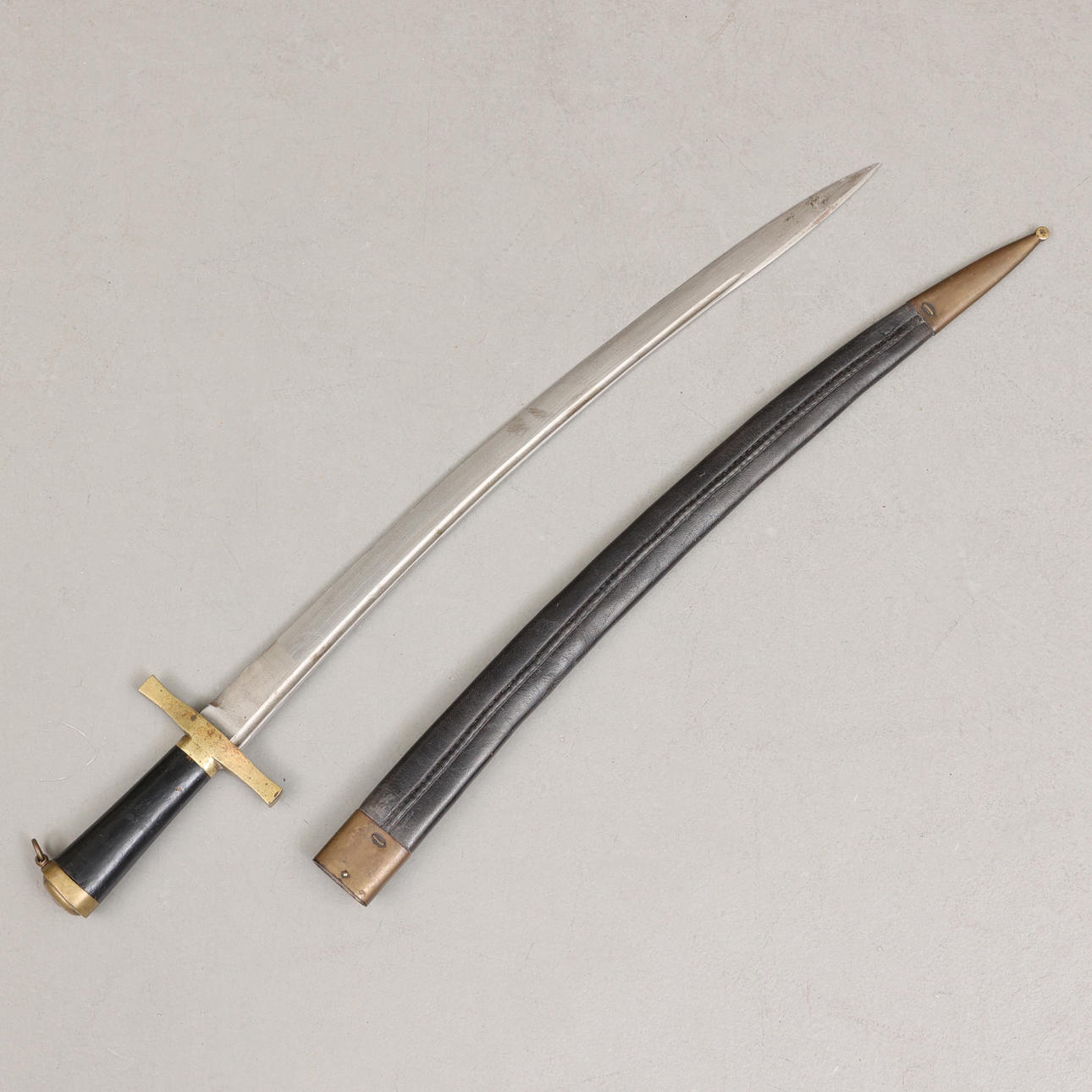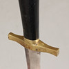Huggare med fäste i mässing och kavel i trä, balja i läder med beslag i mässing. Bladlängd 58 cm, längd 77,5 cm.
