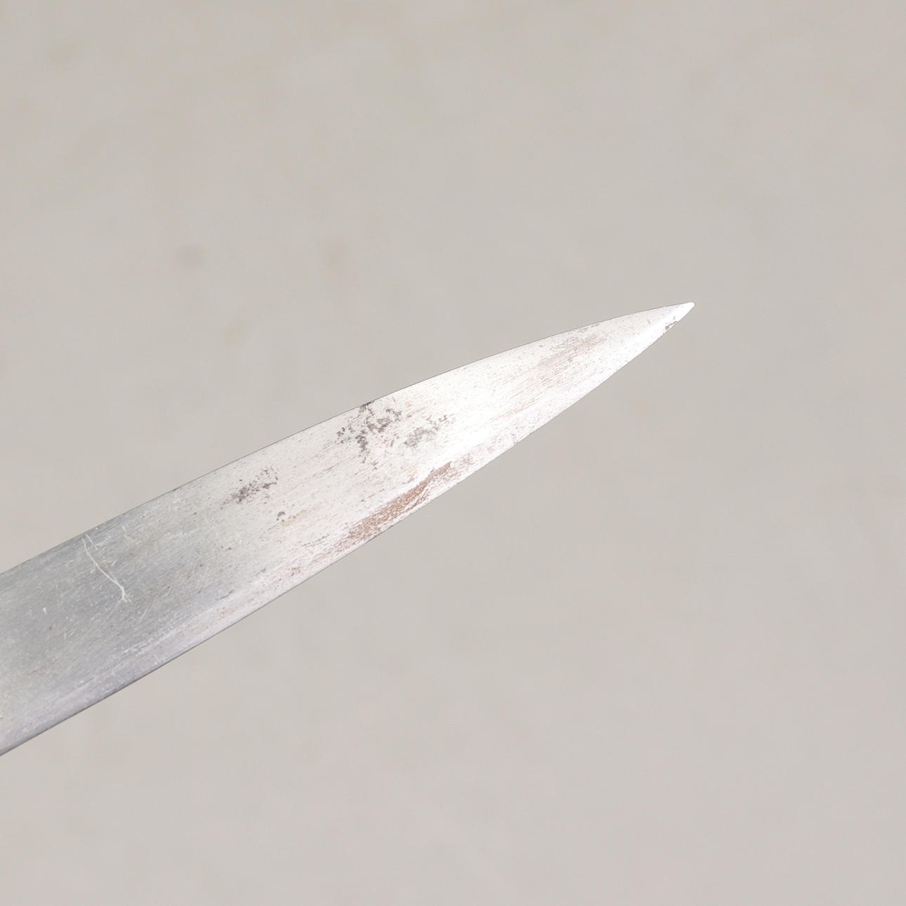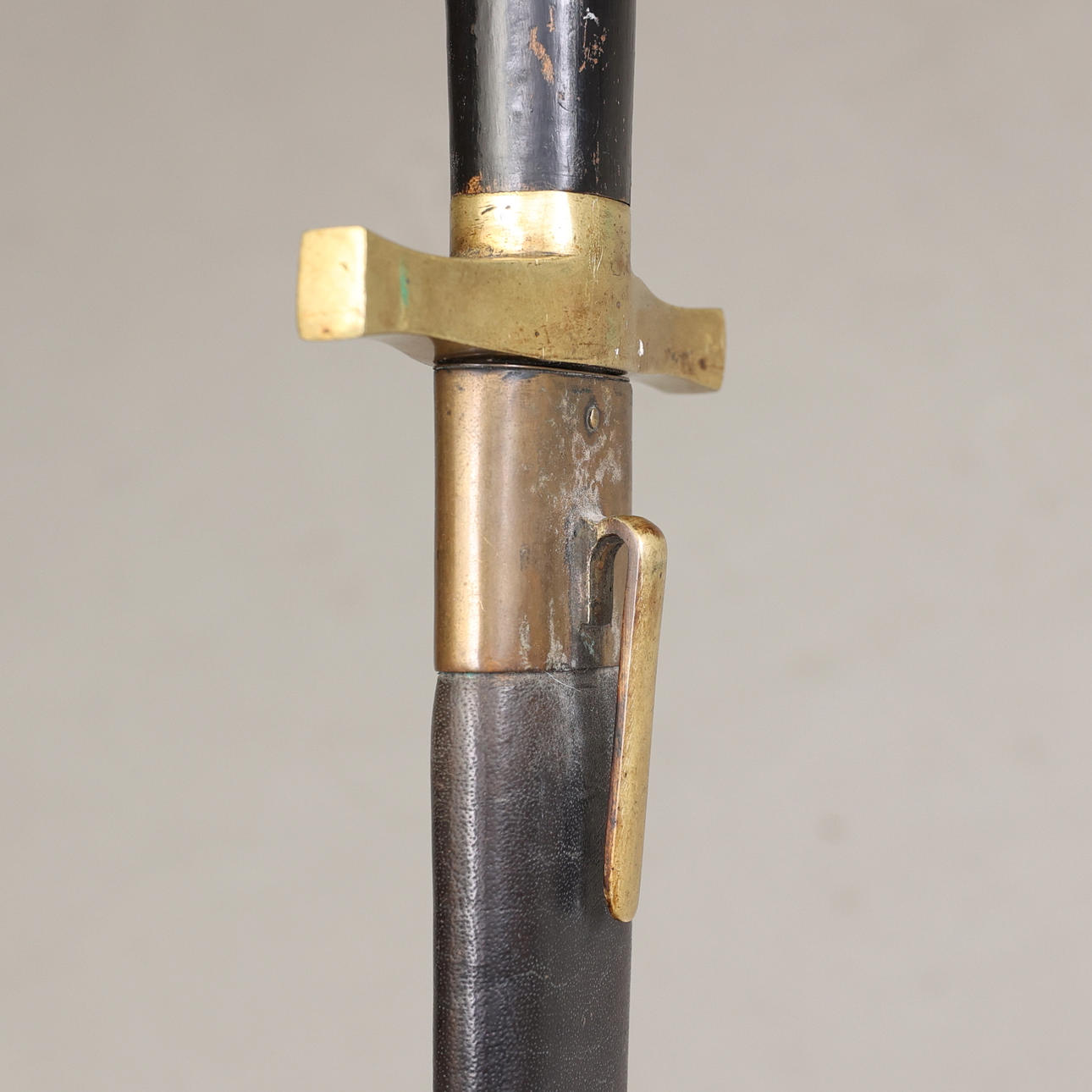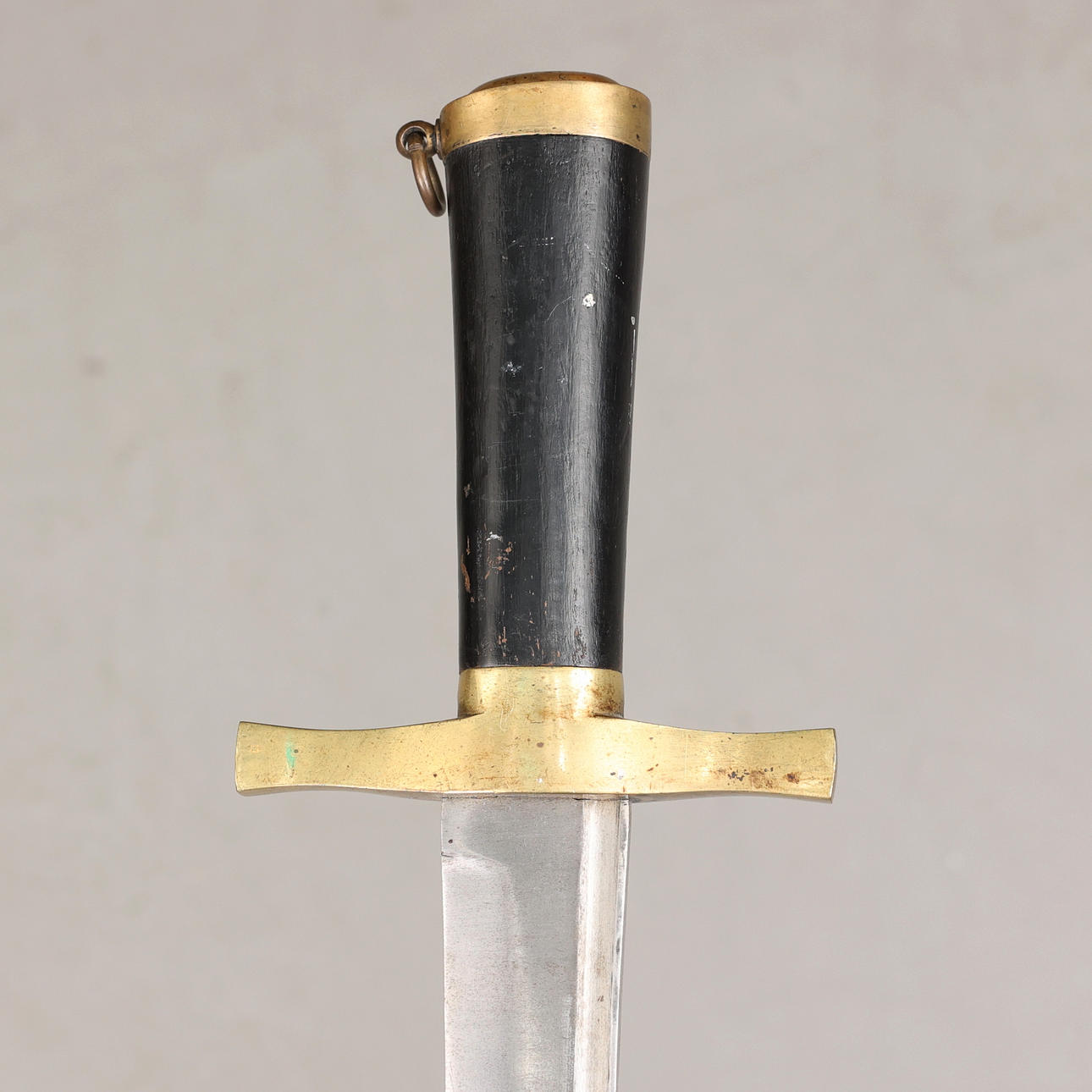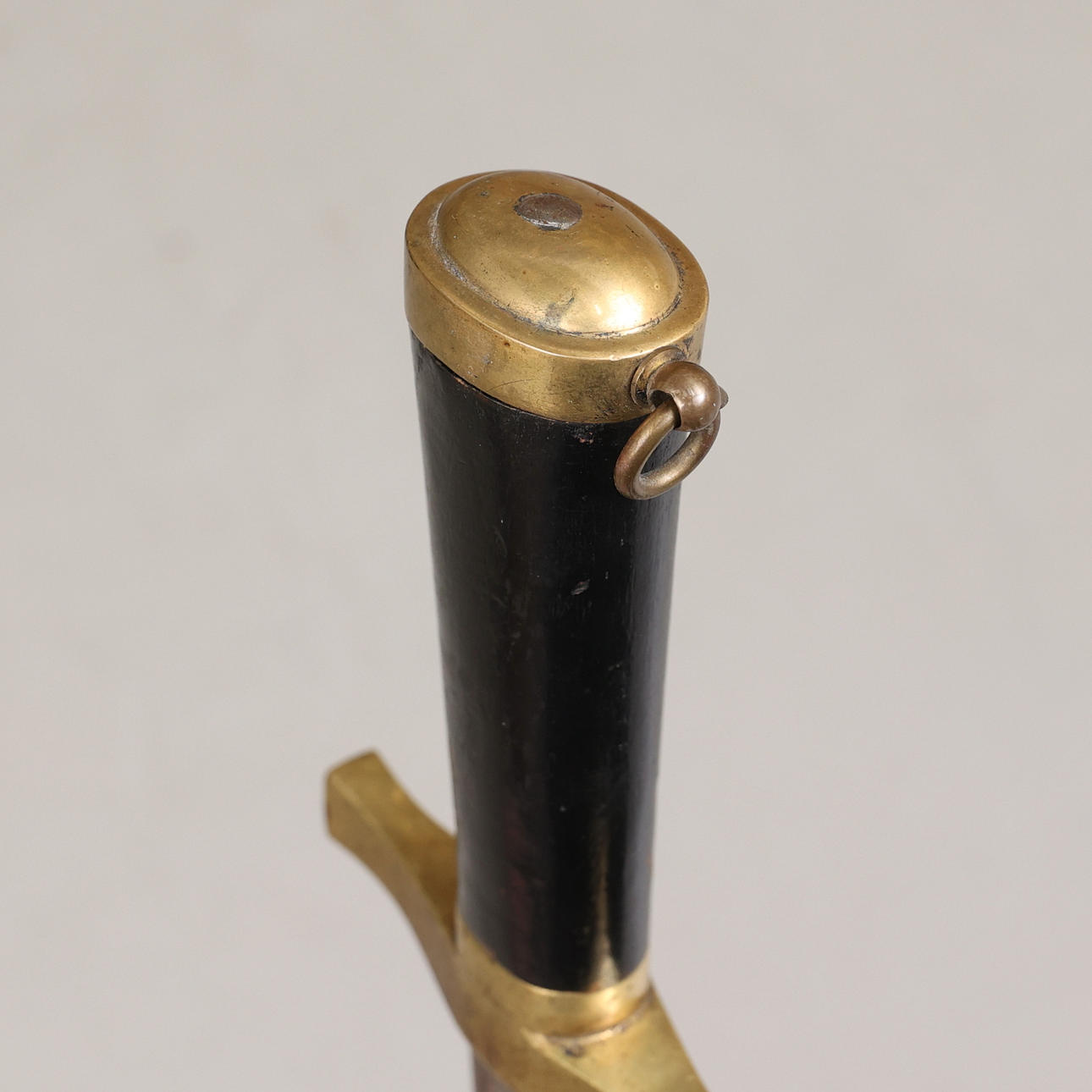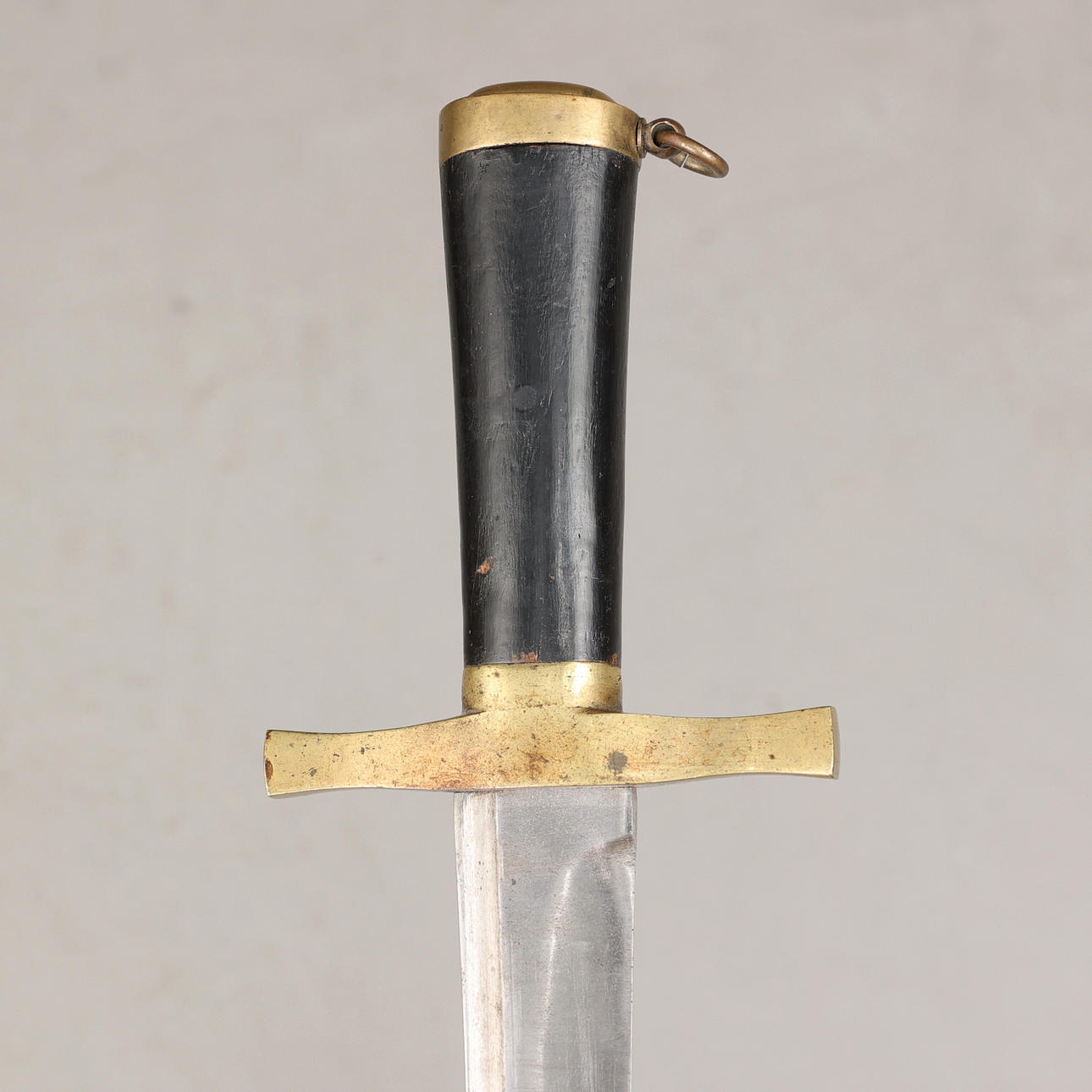Huggare med fäste i mässing och kavel i trä, balja i läder med beslag i mässing. Bladlängd 58 cm, längd 77,5 cm.