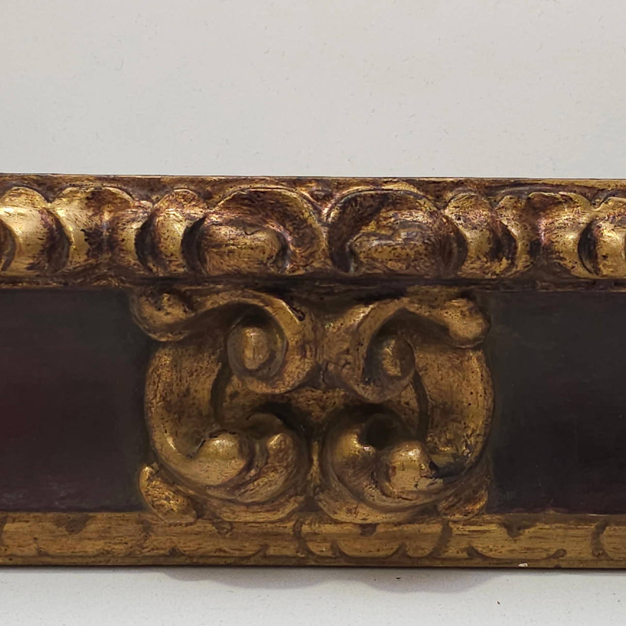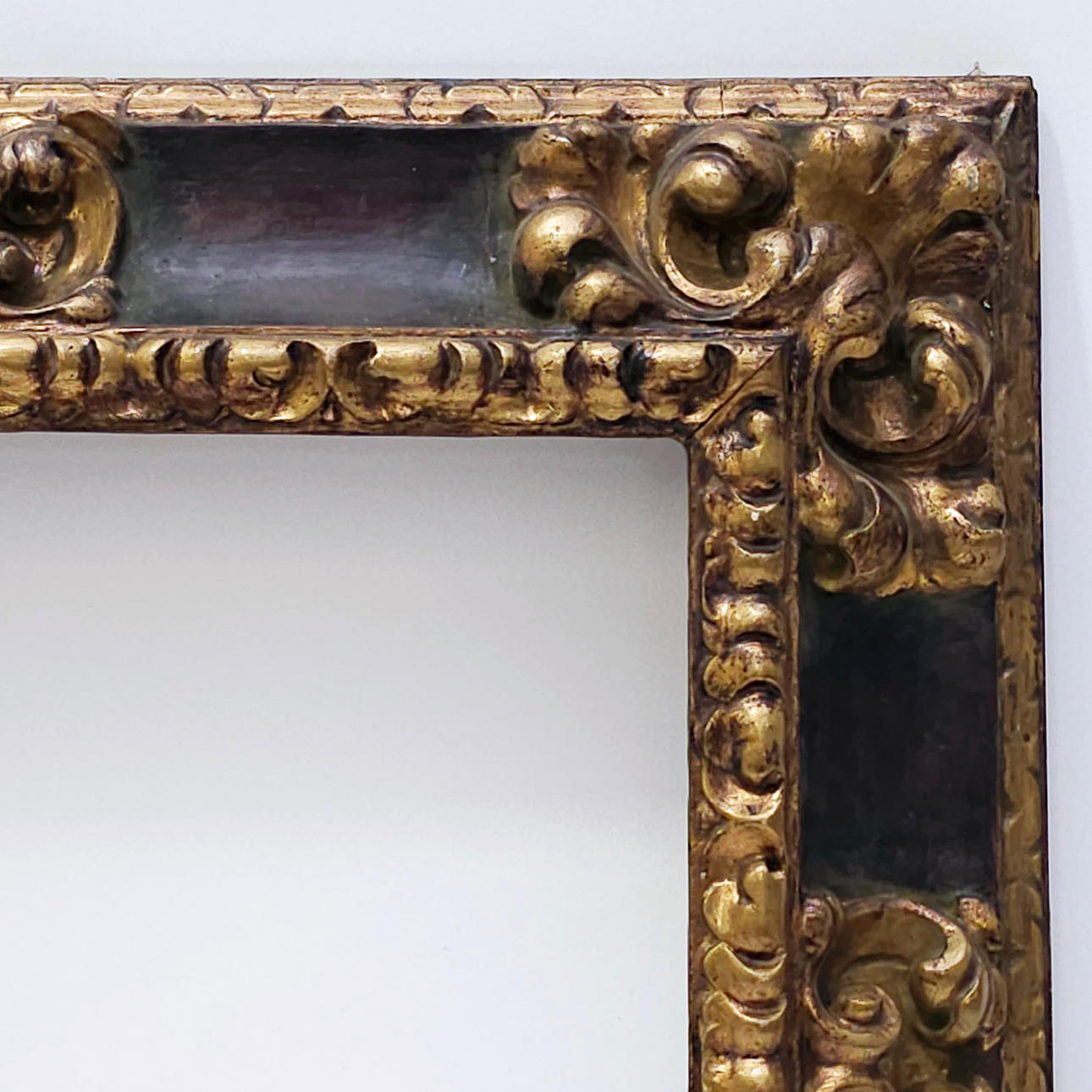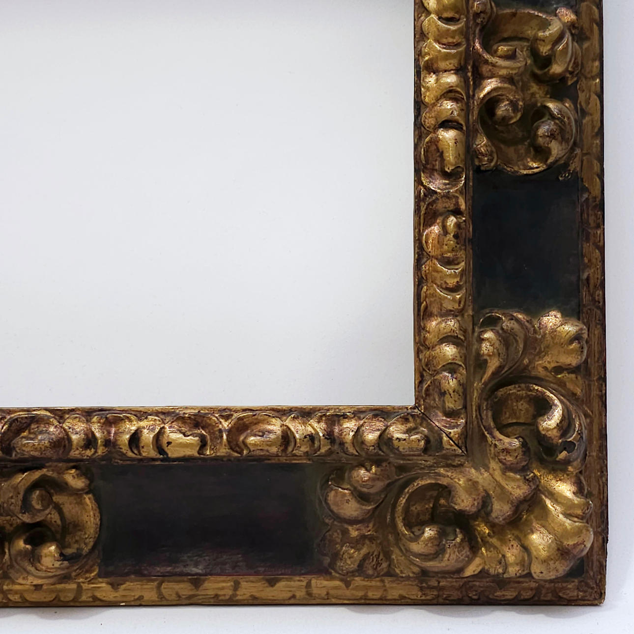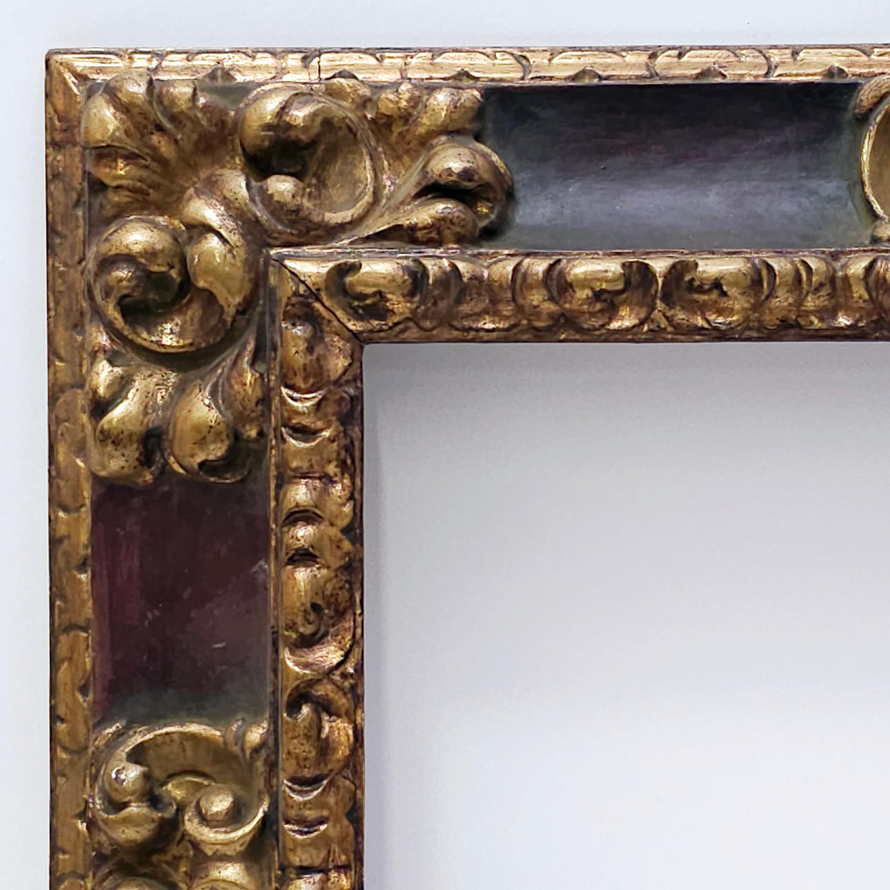 Dekorationen i akantusblad och guldlister, polykrom bakgrund i garante. Mått: 61,5x53,8 cm Mått: 43x35,5 cm.