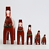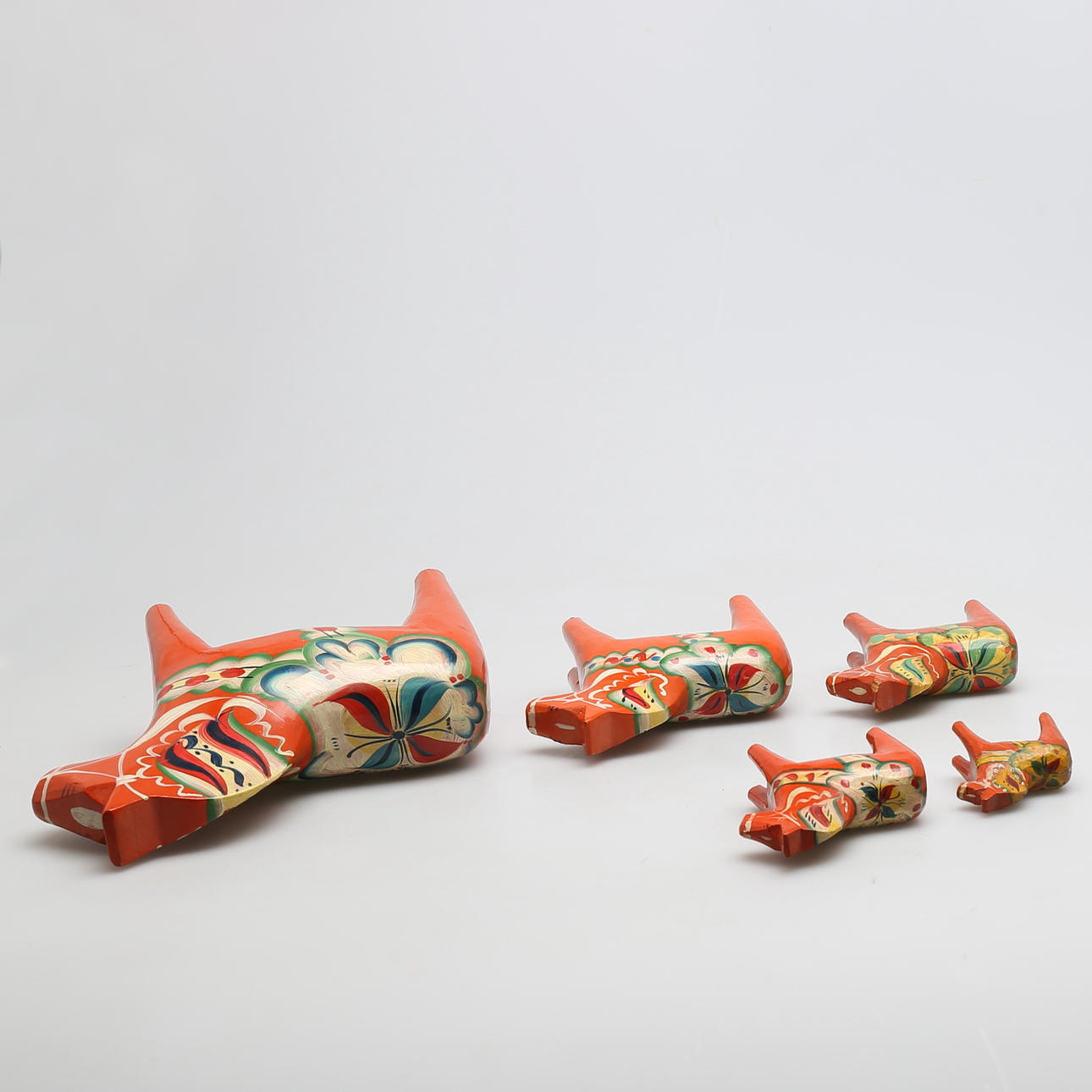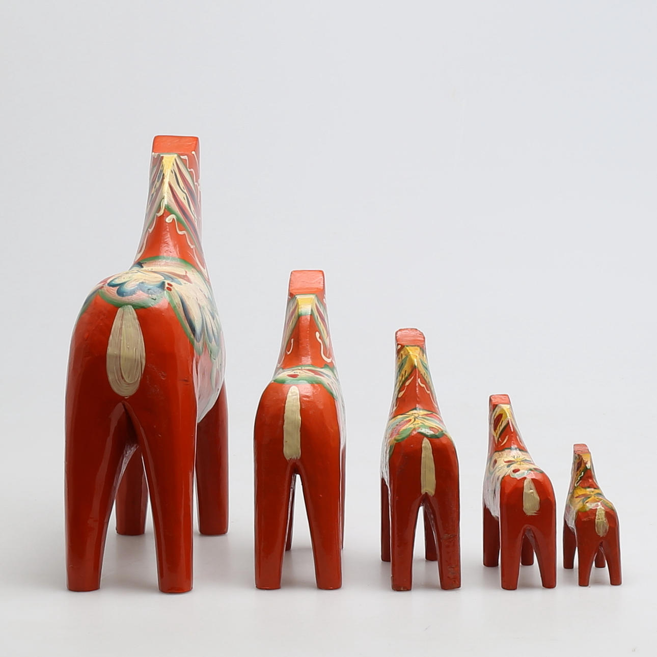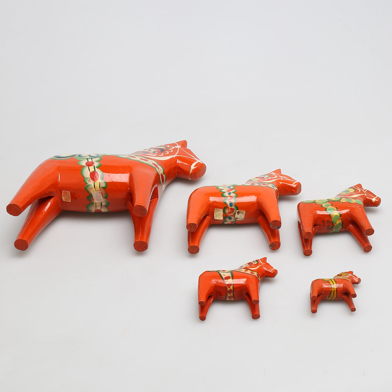 5 hästar med dekor mor orange bakgrund Höjd 26, 17,5, 14, 10 och 7,5 cm Största hästarna ettiekettmärkta Nils Olsson, Nusnäs, Mora.