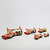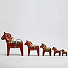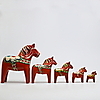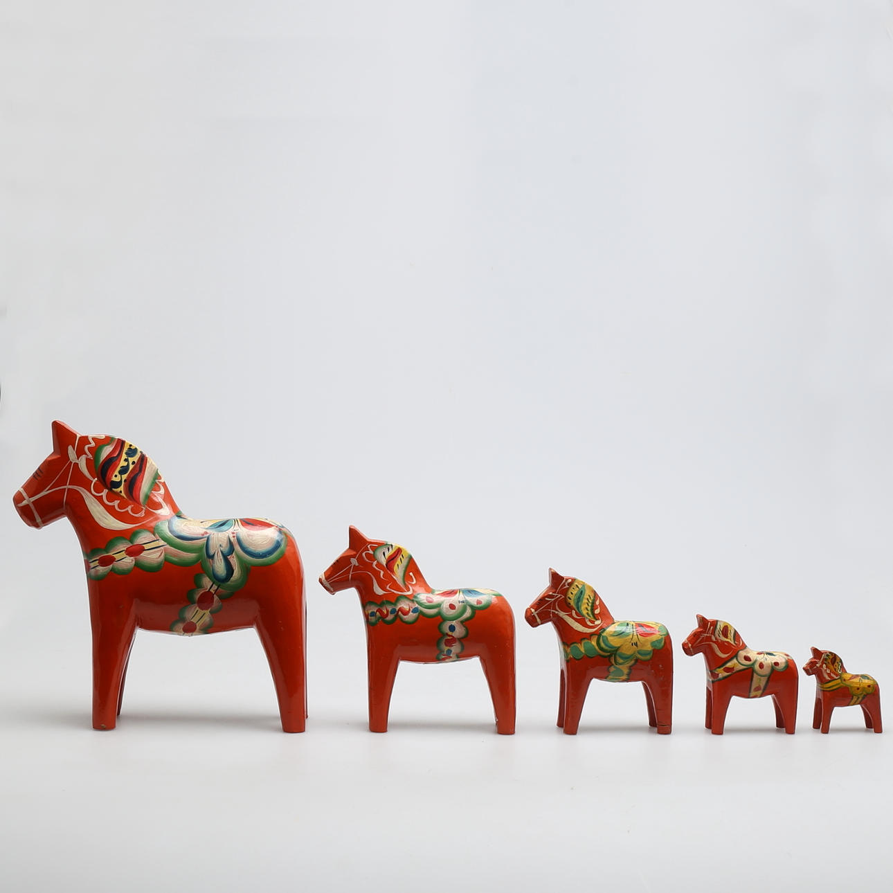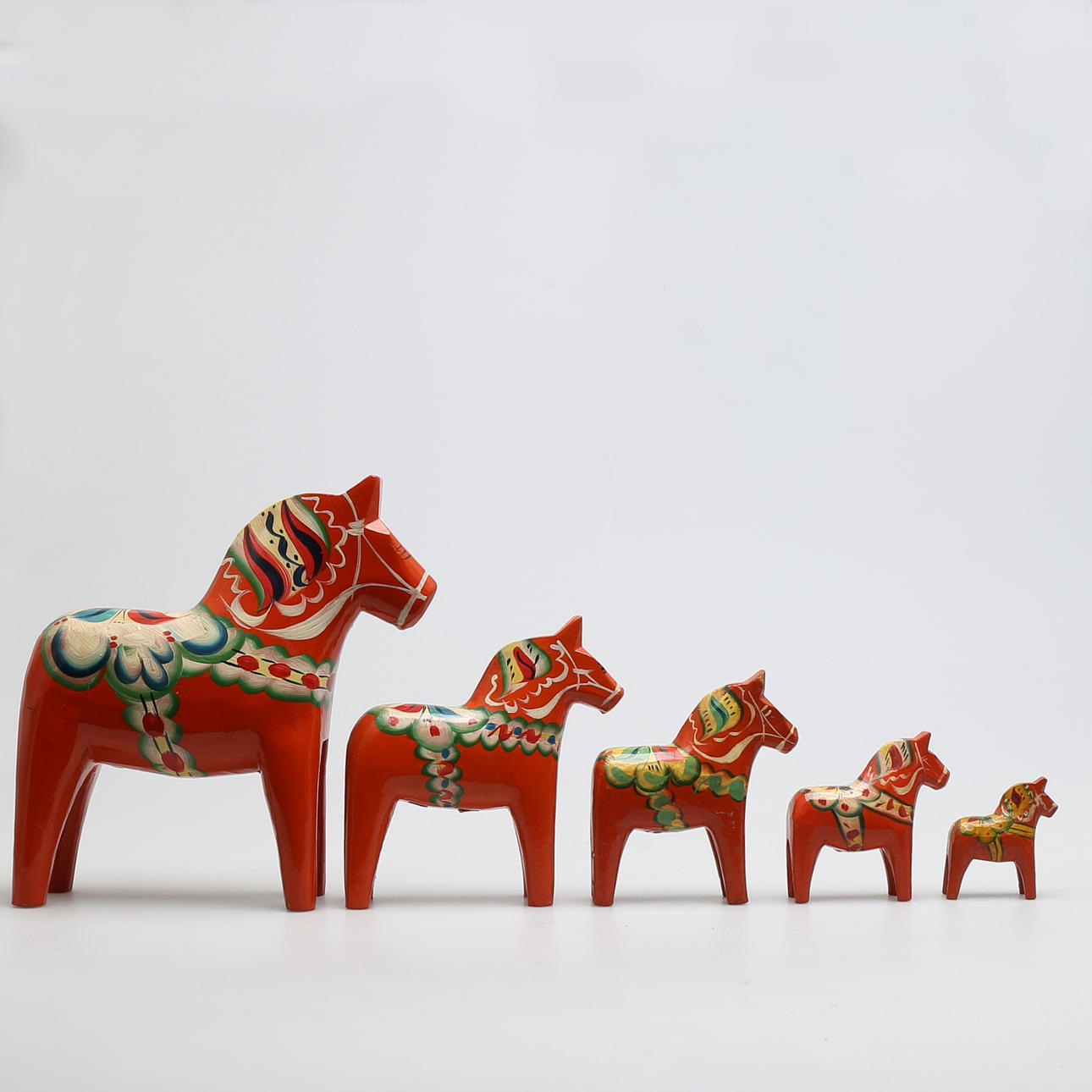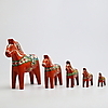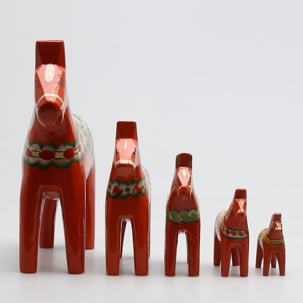 5 hästar med dekor mor orange bakgrund Höjd 26, 17,5, 14, 10 och 7,5 cm Största hästarna ettiekettmärkta Nils Olsson, Nusnäs, Mora.