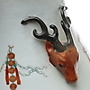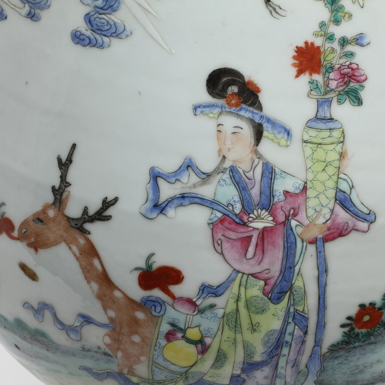 Polykrom dekor av figurscener. Hänklar i form av hjortar. Höjd ca 37,5 cm