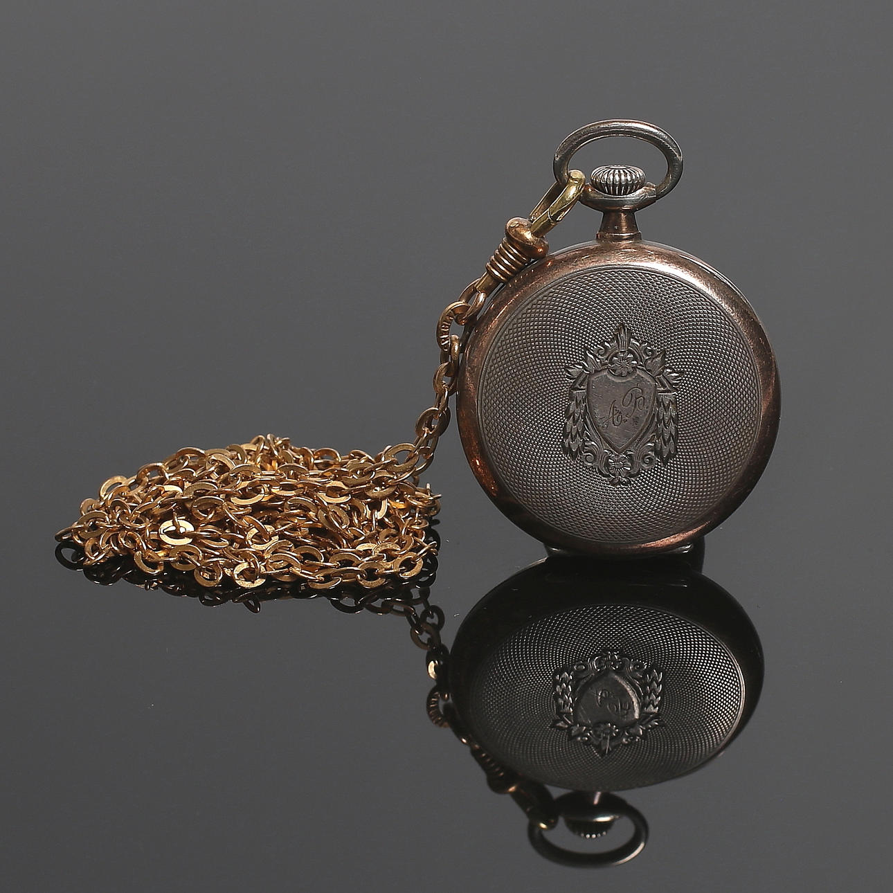 Diameter 33 mm, vikt 28 gram. Kedja i gul metall, längd 90 cm.